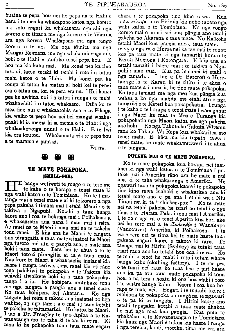 TE PIPIWHARAUROA. No. 180 huaina te pepa hou nei he pepa na te Hahi e hara i te mea ka whakapono katoa nga korero mo roto engari ka whakananu ngatahi nga korero o te tinana me nga korero o te Wairua ara nga korero Whakapono me nga rongo korero o te ao. Ma nga Minita ma nga Mangai Reimana me nga whakaminenga ano hoki o te Hahi e tautoko tenei pepa hou. E hoa ma kia kaha mai. Ma konei pea ka tino tata ai, tatou tetahi ki tetahi i roto i a tatou mahi katoa o te Hahi. Ma konei pea ka rongo ai tatou ka matau ai hoki kei te penei era o tatau na, kei te pera era na. Kei konei pea he awhina nui i a tatou i runga i te mahi whakawhiti i o tatou whakaaro. Otiia ko te mea tino nui e whakaarohia ana e te Pihopa kia waiho te pepa hou nei hei mangai whaka- puaki ki ia mema ki ia mema o te Hahi i nga whakaakoranga nunui o te Hahi. E te Iwi kia ora koutou. Whakamatauria te pepa hou a te marama e puta ai. ETITA. TE MATE POKAPOKA. (SMALL-POX). HE hanga wetiweti te rongo o te tere me te kaha o te horapa o tenei mate ki nga wahi katoa o te Tominiana. Ko te tima- tanga mai o tenei mate e ai ki te korero a nga pepa pakeha i timata mai i etahi Maori no te takiwa o Ngapuhi. Kotahi o taua hunga kaore ano i roa te hokinga mai i Poihakena a e whakaarotia ana nana i mau mai i reira. Ae ranei na te Maori i mau mai na te pakeha tonu ranei. E kiia ana he Maori te tangata tino pirangatia e taua mate a inainei he Maori nga turoro nui atu e pangia ana, e mate ana hoki i taua mate. Tera kei te ahua o to te Maori toto i pirangitia ai ia e taua mate. Kua kore te Maori e whakaaetia inaianei kia haere i runga reriwe, tima ranei kia oti rano tona pakihiwi te pokapoka e te Takuta, kia whiwhi tiwhikete hoki ia o taua pokapoka- tanga i a ia. He hohipera motuhake tonu mo nga tangata e pangia ana e tenei mate. Ko taua hohipera kei Akarana. Ko nga tangata kei reira e takoto ana inaianei 10 nga wahine, 13 nga tane; a o enei 13 tane kotahi te pakeha he taitamariki. Ko katoa he Maori. I tae a Dr. Frengley te tino Apiha a te Ka- wanatanga mo te taha ki te ora ki reira. Ki tana ki he pokapoka tonu taua mate engari ehara i te pokapoka tino kino rawa. Kua puta te kupu a te Pirimia kia noho tupato nga wahi katoa o te Tominiana. Ko nga rongo korero mai o muri nei kua pangia ano tetahi pakeha no Akarana e taua mate. No Kaikohe tetahi Maori kua pangia ano e taua mate. I te 25 o nga ra o Hurae nei ka tae mai te rongo kua pa taua mate ki nga tamariki kura o te Kareti Momona i Korongata. E kiia ana na tetahi tamaiti i haere mai i te takiwa o Nga- puhi i mau mai. Kua pa inaianei ki etahi o nga tamariki. I tae a Dr. Barcroft o Here- taunga ki te Kareti ki te titiro i te ahua o taua mate a i mea ia he tino mate pokapoka. Ko taua tamaiti me nga mea kua pangia kua wehea a ko nga mahita me etahi atu o nga tamariki o te Kareti kua pokapokatia. I runga i te kaha o te horapa o tenei mate i waenganui i nga Maori ka mea te Mea o Turanga kia pokapokatia nga Maori katoa me nga pakeha ano hoki. Ko nga Takuta ko Takuta Wiremu raua ko Takuta Wi Repa kua whakaritea mo tenei mahi. E hika ma kia tupato rawa i tenei mate, he mate whakaweriweri i te ahua o te tangata. PUTAKE MAI O TE MATE POKAPOKA. Ko te mate pokapoka kua horapa nei inai- anei ki nga wahi katoa o te Tominiana i pu- take mai i Amerika rano ara he mate e nui ana ki te taha whakarunga o Amerika. He ngawari taua tu pokapoka kaore i te pokapoka tino kino rawa inahoki e whakaritea ana ki tetahi mate ano e pa ana i etahi wa i Niu Tirani nei ki te " chicken-pox." Ko te mate nei na tetahi pakeha he tuari no tetahi o nga tima o te Hatata Paka i mau mai i Amerika. I te 12 o nga ra o tenei Aperira kua hori ake nei ka rere mai a te Zealandia i Wanakupa (Vancouver) Amerika, ki Poihakena. I te wa e rere nei te tima kei te mate haere taua pakeha engari kaore e takoto ki raro. Te taenga mai ki Hirini (Sydney) ka tutaki taua tuari raua ano ko tetahi hoa ona i reira. Ko te mahi a tenei he mahi i roto i tetahi whare hanga kahu (clothing factory). I te roa pea o te tuari nei raua ko tona hoa e piri haere ana ka pa atu taua mate pokapoka ki tona hoa, a na tera i hoatu ki ona hoa mahi i roto i te whare hanga kahu. Kaore i roa kua ho- rapa te mate nei. Engari i te tuatahi kaore i mohiotia he pokapoka na runga na te ngawari o te pa ki te tangata. I Hirini kaore ano tetahi tupapaku kotahi a taua mate ahakoa he nui nga mea kua pangia. Kua puta te whakahau a te Kawanatanga o te Tominiana kia kaua nga Maori e. tukua kia haere i runga i nga tereina, kooti, motoka, tima me era atu