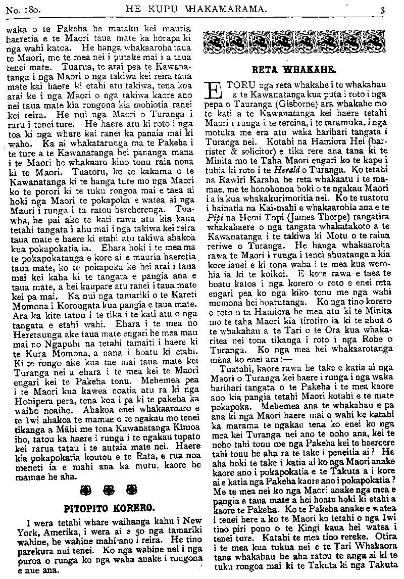No. 180. HE KUPU WHAKAMARAMA. waka o te Pakeha he mataku kei mauria haeretia e te Maori taua mate ka horapa ki nga wahi katoa. He hanga whakaaroha taua te Maori, me te mea nei i putake mai i a taua tenei mate. Tuarua, te arai pea te Kawana- tanga i nga Maori o nga takiwa kei reira taua mate kai haere ki etahi atu takiwa, tena koa arai ke i nga Maori o nga takiwa kaore ano nei taua mate kia rongona kia mohiotia ranei kei reira. He nui nga Maori o Turanga i raru i tenei ture. He haere atu ki roto i nga toa ki nga whare kai ranei ka panaia mai ki waho. Ka ai whakatarunga ma te Pakeha i te ture a te Kawanatanga hei pananga mana i te Maori he whakaaro kino tonu raia nona ki te Maori. Tuatoru, ko te kakama o te Kawanatanga ki te hanga ture mo nga Maori ko te porori ki te tuku rongoa mai e taea ai hoki nga Maori te pokapoka e watea ai nga Maori i runga i ta ratou hereherenga. Tua- wha, he pai ake te kati rawa atu kia kaua tetahi tangata i ahu mai i nga takiwa kei reira taua mate e haere ki etahi atu takiwa ahakoa kua pokapokatia ia. Ehara hoki i te mea ma te pokapokatanga e kore ai e mauria haeretia. taua mate, ko te pokapoka ke hei arai i taua mai kei kaha ki te tangata e pangia ana e taua mate, a hei kaupare atu ranei i taua mate kei pa mai. Ka nui nga tamariki o te Kareti Momona i Korongata kua pangia e taua mate. Ara ka kite tatou i te tika i te kati atu o nga tangata e etahi wahi. Ehara i te mea no Heretaunga ake taua mate engari he mea mau mai no Ngapuhi na tetahi tamaiti i haere ki te Kura Momona, a nana i hoatu ki etahi. Ki te rongo ake kua tae mai taua mate kei Turanga nei a ehara i te mea kei te Maori engari kei te Pakeha tonu. Mehemea pea i te Maori kua kawea noatia atu ra ki nga Hohipera pera, tena koa i pa ki te pakeha ka waiho noaiho. Ahakoa enei whakaaroaro e te Iwi ahakoa te mamae o te ngakau mo tenei tikanga a Mahi me tona Kawanatanga Kimoa iho, tatou ka haere i runga i te ngakau tupato kei rarua tatau i te autaia mate nei. Haere kia pokapokatia koutou e te Rata, e rua noa meneti ia e mahi ana ka mutu, kaore he mamae he aha. PITOPITO KORERO. I wera tetahi whare waihanga kahu i New York, Amerika, i wera ai e 50 nga tamariki wahine, he wahine mahi ano i reira. He tino parekura nui tenei. Ko nga wahine nei i nga puroa o runga ko nga waha anake i rongona e aue ana. RETA WHAKAHE. E TORU nga reta whakahe i te whakahau a te Kawanatanga kua puta i roto i nga pepa o Tauranga (Gisborne) ara whakahe mo te kati a te Kawanatanga kei haere tetahi Maori i runga i te tereina, i te taramuka, i nga motuka me era atu waka harihari tangata i Turanga nei. Kotahi na Hamiora Hei (bar- rister & solicitor) e tika rere ana tana ki te Minita mo te Taha Maori engari ko te kape i tuhia ki roto i te Herald o Turanga. Ko tetahi na Rawiri Karaha he reta whakaatu i te ma- mae, me te honohonoa hoki o te ngakau Maori i a ia kua whakakurimoritia nei. Ko te tuatoru i hainatia na Kai-mahi e whakaarohia ana e te Pipi na Hemi Topi (James Thorpe) rangatira whakahaere o nga tangata whakatakoto a te Kawanatanga i te takiwa ki Motu o te raina reriwe o Turanga. He hanga whakaaroha rawa te Maori i runga i tenei ahuatanga a kia kore ianei e ki tona waha i te mea kua wero- hia ia ki te koikoi. E ko:: e rawa e taea te hoatu katoa i nga korero o roto e enei reta engari pea ko nga kiko tonu me nga wahi momona hei hoatutanga. Ko nga tino korero o roto o ta Hamiora he mea atu ki te Minita mo te taha Maori kia tirotiro ia ki te ahua o te whakahau a te Tari o. te Ora kua whaka- ritea nei tona tikanga i roto i nga Rohe o Turanga. Ko nga mea hei whakaarotanga mana ko enei ara:— Tuatahi, kaore rawa he take e katia ai nga Maori o Turanga kei haere i runga i nga waka harihari tangata o te Pakeha i te mea kaore ano kia pangia tetahi Maori kotahi e te mate pokapoka. Mehemea ana te whakahau e pa ana ki nga Maori haere mai o wahi ke katahi ka marama te ngakau tena ko enei ko nga mea kei Turanga nei ano te noho ana, kei te noho tahi tonu me nga Pakeha kei te haereere tahi tonu he aha ra te take i peneitia ai? He aha hoki te take i katia ai ko nga Maori anake kaore ano i pokapokatia e te Takuta a i kore ai e katia nga Pakeha kaore ano i pokapokatia? Me te mea nei ko nga Maori: anake nga mea e pangia e taua mate a hei hoatu hoki ki etahi a kaore te Pakeha. Ko te Pakeha anake e watea i tenei here a ko te Maori ko tetahi o nga Iwi tino piri pono o te Kingi kaua hei watea i tenei ture. Katahi te mea tino rereke. Otira i te mea kua tukua nei e te Tari Whakaora tana whakahau he aha ratou te anga ai ki te tuku rongoa mai ki te Takuta ki nga Takuta