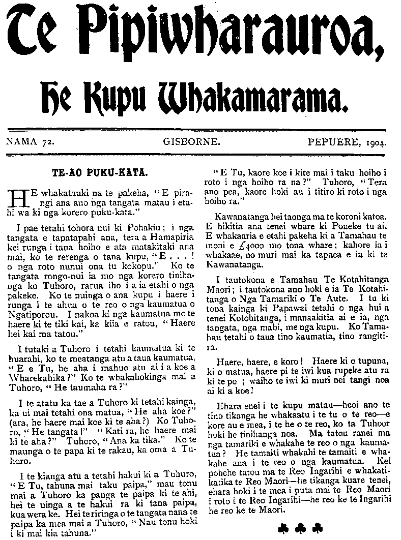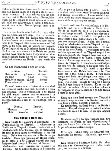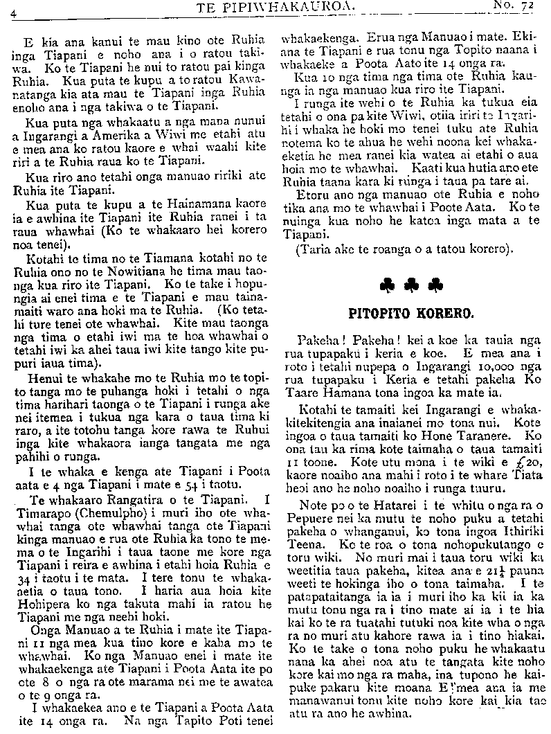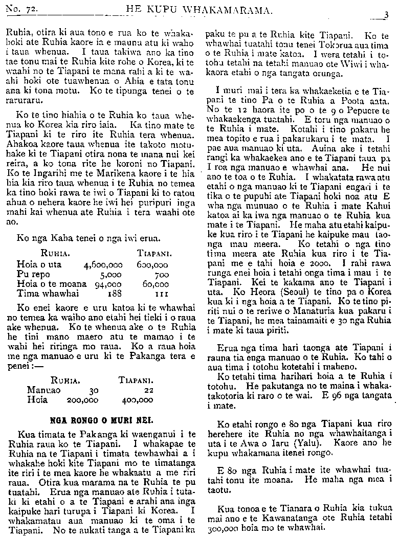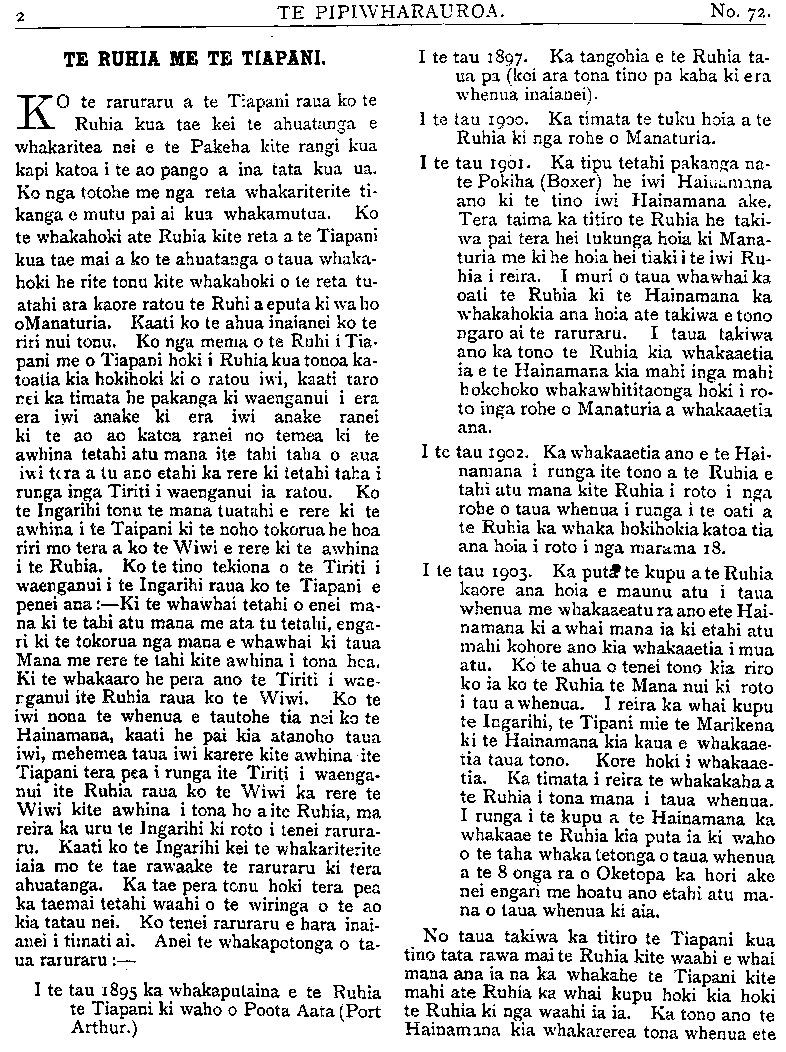 TE PIPIWHARAUROA. E kia ana kanui te mau kino o te Ruhia inga Tiapani e noho ana i o ratou taki- wa. Ko te Tiapani he nui to ratou pai kinga Ruhia. Kua puta te kupu a to ratou Kawa- natanga kia ata mau te Tiapani inga Ruhia enoho ana i nga takiwa o te Tiapani. Kua puta nga whakaatu a nga mana nunui a Ingarangi a Amerika a Wiwi me etahi atu e mea ana ko ratou kaore e whai waahi kite riri a te Ruhia raua ko te Tiapani. Kua riro ano tetahi onga manuao ririki a te Ruhia i te Tiapani. Kua puta te kupu a te Hainamana kaore ia e awhina i te Tiapani i te Ruhia ranei i ta raua whawhai (Ko te whakaaro hei korero noa tenei). Kotahi te tima no te Tiamana kotahi no te Ruhia ono no te Nowitiana he tima mau tao- nga kua riro i te Tiapani. Ko te take i hopu- ngia ai enei tima e te Tiapani e mau taina- maiti waro ana hoki ma te Ruhia. (Ko teta- hi ture tenei o te whawhai. Kite mau taonga nga tima o etahi iwi ma te hoa whawhai o tetahi iwi ka ahei taua iwi kite tango kite pu- puri iaua tima). Henui te whakahe mo te Ruhia mo te topi- to tanga mo te puhanga hoki i tetahi o nga tima harihari taonga o te Tiapani i runga ake nei i te mea i tukua nga kara o taua tima ki raro, a i te totohu tanga kore rawa te Ruhui i nga kite whakaora ianga tangata me nga pahihi o runga. I te whaka e kenga a te Tiapani i Poota aata e 4 nga Tiapani i mate e 54 i taotu. Te whakaaro Rangatira o te Tiapani. I Timarapo (Chemulpho) i muri iho o te wha- whai tanga o te whawhai tanga o te Tiapani kinga manuao e rua o te Ruhia ka tono te me- ma o te Ingarihi i taua taone me kore nga Tiapani i reira e awhina i etahi hoia Ruhia e 34 i taotu i te mata. I tere tonu te whaka- aetia o taua tono. I haria aua hoia kite Hohipera ko nga takuta mahi ia ratou he Tiapani me nga neehi hoki. Onga Manuao a te Ruhia i mate i te Tiapa- ni 11 nga mea kua tino kore e kaha mo te whawhai. Ko nga Manuao enei i mate i te whakaekenga a te Tiapani i Poota Aata i te po o te 8 o nga ra o te marama nei me te awatea o te 9 onga ra. I whakaekea ano e te Tiapani a Poota Aata i te 14 onga ra. Na nga Tapito Poti tenei whakaekenga, Erua nga Manuao i mate. Ekii -ana te Tiapani e rua tonu nga Topito naana i whakaeke a Poota Matoke 14 onga ra. Kua 10 nga tima nga tima o te Ruhia kau- nga ia nga manuao kua riro i te Tiapani. I runga i te wehi o te Ruhia ka tukua eia tetahi o ona pa kite Wiwi, otiia iriri Ingari- hi i whaka he hoki mo tenei tuku a te Ruhia no te mea ko te ahua he wehi noona kei whaka- ekenga he mea ranei kia watea ai etahi o aua hoia mo te whawhai. Kaati kua hutia ano ete Ruhia taana kara ki runga i taua pa tare ai. Etoru ano nga manuao o te Ruhia e noho tika ana mo te whawhai i Poota Aata. Ko te nuinga kua noho he katoa i nga mata a te Tiapani. (Taria ake te roanga o a tatou korero). PITOPITO KORERO. Pakeha! Pakeha! kei a koe ka tauia nga rua tupapaku i keria e koe. E mea ana i roto i tetahi nupepa o Ingarangi 10, 000 nga rua tupapaku i Keria e tetahi pakeha Ko Taare Hamana tona ingoa ka mate ia. Kotahi te tamaiti kei Ingarangi e whaka- kitekitengia ana inaianei mo tona nui. Kote ingoa o taua tamaiti ko Hone Tararere. Ko ona tau ka rima kote taimaha o taua tamaiti 11 toene. Kote utu mona i te wiki e 20, kaore noaiho ana mahi i roto i te whare Tiata heoi ano he noho noaiho i runga tuuru. No te po o te Hatarei i te whitu o nga ra o Pepuere nei ka mutu te noho puku a tetahi pakeha o whanganui, ko tona ingoa Ithiriki Teina. Ko te roa o tona nohopukutango e toru wiki. No muri mai i taua toru wiki ka weetitia taua pakeha, kitea ana e 21^ pauna weeti te hokinga iho o tona taimaha. I te patapataitanga ia ia i muri iho ka kii ia ka mutu tonu nga ra i tino mate ai ia i te hia kai ko te ra tuatahi tutuki noa kite wha o nga ra no muri atu kahore rawa ia i tino hiakai. Ko te take o tona noho puku he whakaatu nana ka ahei noa atu te tangata kite noho kore kai mo nga ra maha, ina tupono he kai- puke pakaru kite moana E mea ana ia me manawanui tonu kite noho kore kai kia tae atu ra ano he awhina.