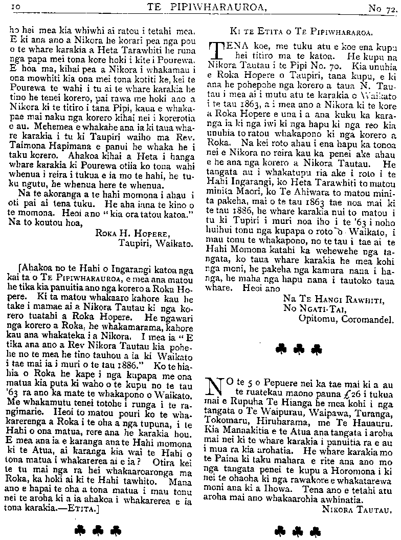 TE PIPIWHARAUROA, ho hei mea kia whiwhi ai ratou i tetahi mea. E ki ana ano a Nikora he korari pea nga pou o te whare karakia a Heta Tarawhiti he runa nga papa mei tona kore hoki i kite i Pourewa. E hoa ma, kihai pea a Nikora i whakamau i ona mowhiti kia ona mei tona kotiti ke, kei te Pourewa te wahi i tu ai te whare karakia he tino he tenei korero, pai rawa me hoki ano a Nikora ki te titiro i tana Pipi, kaua e whaka- pae mai naku nga korero kihai nei i korerotia e au. Mehemea e whakahe ana ia ki taua wha- re karakia i tu ki Taupiri waiho ma Rev. Taimona Hapimana e panui he whaka he i taku korero. Ahakoa kihai a Heta i hanga whare karakia ki Pourewa otiia ko tona wahi whenua i reira i tukua e ia mo te hahi, he tu- ku ngutu, he whenua here te whenua. Na te akoranga a te hahi momona i ahau i oti pai ai tena tuku. He aha iana te kino o te momona. Heoi ano " kia ora tatou katoa." Na to koutou hoa, ROKA H. HOPERE, Taupiri, Waikato. [Ahakoa no te Hahi o Ingarangi katoa nga kai ta o TE PIPIWHARAUROA, e mea ana matou he tika kia panuitia ano nga korero a Roka Ho pere. Ki ta matou whakaaro kahore kau he take i mamae ai a Nikora Tautau ki nga ko- rero tuatahi a Roka Hopere. He ngawari nga korero a Roka; he whakamarama, kahore kau ana whakateka i a Nikora. I mea ia " E tika ana ano a Rev Nikora Tautau kia pohe- he no te mea he tino tauhou a ia ki Waikato i tae mai ia i muri o te tau 1886." Ko te hia- hia o Roka he kape i nga kupapa me ona matua kia puta ki waho o te kupu no te tau '63 ra ano ka mate te whakapono o Waikato. Me whakamutu tenei totohe i runga i te ra- ngimarie. Heoi to matou pouri ko te wha- karerenga a Roka i te oha a nga tupuna, i te Hahi o ona matua, rere ana he karakia hou. E mea ana ia e karanga ana te Hahi momona ki te Atua, ai karanga kia wai te Hahi o tona matua i whakarerea ai e ia? Otira kei te tu mai nga ra hei whakaaroaronga ma. Roka, ka hoki ai ki te Hahi tawhito. Mana ano e hapai te oha a tona matua i mau tonu nei te aroha ki a ia ahakoa i whakarerea e ia tona karakia.—ETITA.] KI TE ETITA O TE PIP1WHARAROA. TENA koe, me tuku atu e koe ena kupu hei titiro ma te katoa. He kupu na Nikora Tautau i te Pipi No. 70. Kia unuhia e Roka Hopere o Taupiri, tana kupu, e ki ana he pohepohe nga korero a taua N Tau- tau i mea ai i mutu atu te karakia o Waikato i te tau 1863, a i mea ano a Nikora ki te kore a Roka Hopere e una i a ana kuku ka kara- nga ia ki nga iwi ki nga hapu ki nga reo kia unuhia to ratou whakapono ki nga korero a Roka. Na kei roto ahau i ena hapu ka tonoa nei e Nikora no reira kau ka penei ake ahau e he ana nga korero a Nikora Tautau. He tangata au i whakatupu ria ake i roto i te Hahi Ingarangi, ko Heta Tarawhiti to matou minita Maori, ko Te Ahiwara to matou mini- ta pakeha, mai o te tau 1863 tae noa mai ki te tau 1886, he whare karakia nui to matou i tu ki Tupiri i muri noa iho i te '63 i noho huihui tonu nga kupapa o roto "o Waikato, i mau tonu te whakapono, no te tau i tae ai te Hahi Momona katahi ka wehewehe nga ta- ngata, ko taua whare karakia he mea kohi nga moni, he pakeha nga kamura nana i ha- nga, he maha nga hapu nana i tautoko taua whare. Heoi ano Na TE HANGI RAWHITI, No NGATI TAI Opitomu, Coromandel NO te 5 o Pepuere nei ka tae mai ki a au te ruatekau maono pauna "26 i tukua mai e Rupuha Te Hianga he mea kohi i nga tangata o Te Waipurau Waipawa, Turanga, Tokomaru, Hiruharama, me Te Hauauru. Kia Manaakitia e te Atua ana tangata i aroha mai nei ki te whare karakia i panuitia ra e au i mua ra kia arohatia. He whare karakia mo te Paina ki taku mahara e rite ana ano mo nga tangata penei te kupu a Horomona i ki nei te ohaoha ki nga rawakore e whakatarewa moni ana ki a Ihowa. Tena ano e tetahi atu aroha mai ano whakaarohia awhinatia NIKORA TAUTAU.