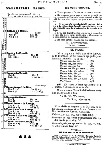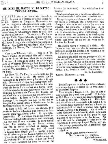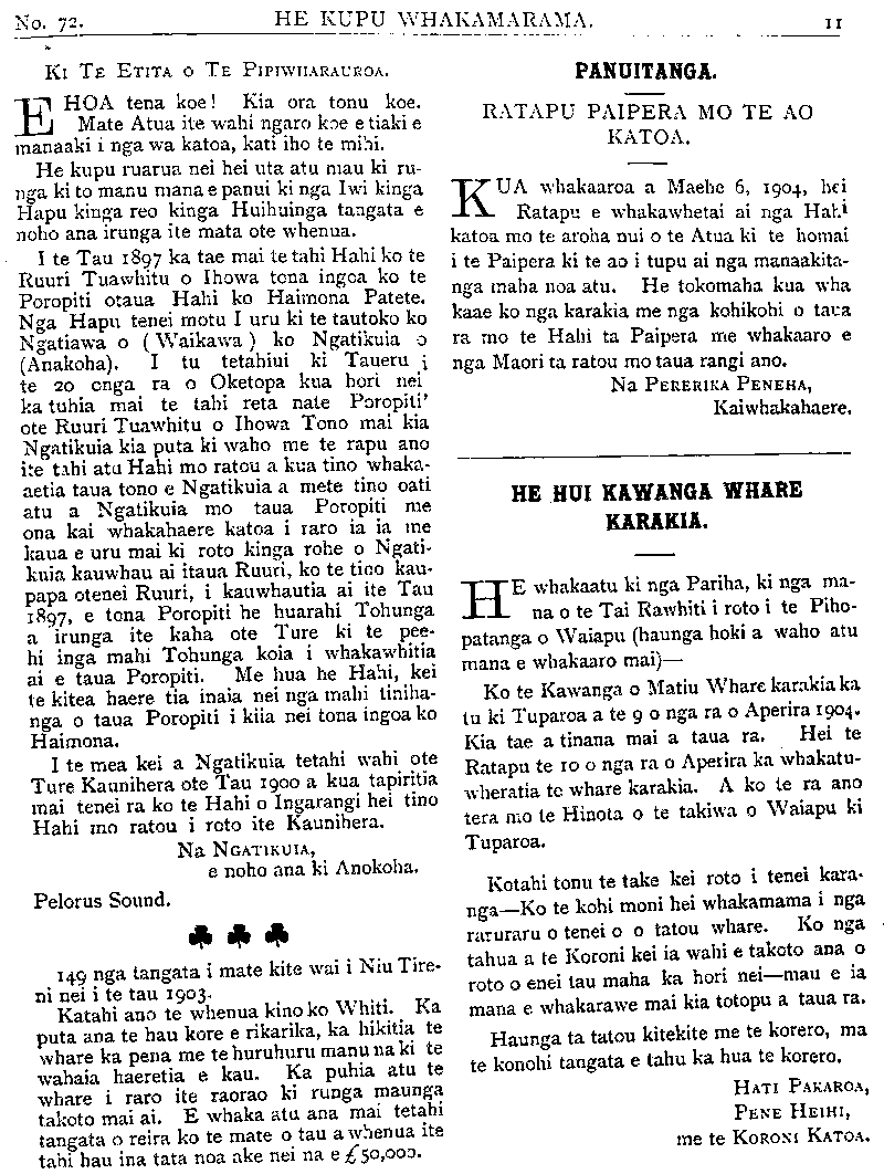 HE KUPU WHAKAMARAMA. KI TE ETITA o TE PIPIWHARAUROA. EHOA tena koe! Kia ora tonu koe. Mate Atua ite wahi ngaro koe e tiaki e manaaki i nga wa katoa, kati iho te mihi. He kupu ruarua nei hei uta atu mau ki ru- nga ki to manu mana e panui ki nga Iwi kinga Hapu kinga reo kinga Huihuinga tangata e noho ana irunga ite mata ete whenua. I te Tau 1897 ka tae mai te tahi Hahi ko te Ruuri Tuawhitu o Ihowa tona ingoa ko te Poropiti otaua Hahi ko Haimona Patete. Nga Hapu tenei motu I uru ki te tautoko ko Ngatiawa o (Waikawa) ko Ngatikuia o (Anakoha). I tu tetahiui ki Taueru i te 20 onga ra o Oketopa kua hori nei ka tuhia mai te tahi reta nate Poropiti' ote Ruuri Tuawhitu o Ihowa Tono mai kia Ngatikuia kia puta ki waho me te rapu ano ite ta hi atu Hahi mo ratou a kua tino whaka- aetia taua tono e Ngatikuia a mote tino oati atu a Ngatikuia mo taua Poropiti me ona kai whakahaere katoa i raro ia ia me kaua e uru mai ki roto kinga rohe o Ngati- kuia kauwhau ai haua Ruuri, ko te tino kau- papa otenei Ruuri, i kauwhautia ai ite Tau 1897 e tona Poropiti he huarahi Tohunga a irunga he kaha ote Ture ki te pee- hi inga mahi Tohunga koia i whakawhitia ai e taua Poropiti. Me hua he Hahi, kei te kitea haere tia inaia nei nga mahi tiniha- nga o taua Poropiti i kiia nei tona ingoa ko Haimona. I te mea kei a Ngatikuia tetahi wahi ote Ture Kaunihera ote Tau 1900 a kua tapiritia mai tenei ra ko te Hahi o Ingarangi hei tino Hahi mo ratou i roto ite Kaunihera. Na NGATIKUIA, e noho ana ki Anakoha. Pelorus Sound. 149 nga tangata i mate kite wai i Niu Tire- ni nei i te tau 1903- Katahi ano te whenua kino ko Whiti. Ka puta ana te hau kore e rikarika, ka hikitia te whare ka pena me te huruhuru manu na ki te wahaia haeretia e kau. Ka puhia atu te whare i raro ite raorao ki runga maunga takoto mai ai. E whaka atu ana mai tetahi tangata o reira ko te mate o tau a whenua ite tahi hau ina tata noa ake nei na e '50, 000. PANUITANGA. RATAPU PAIPERA MO TE AO KATOA. KUA whakaaroa a Maehe 6, 1904, hei Ratapu e whakawhetai ai nga Hahi katoa mo te aroha nui o te Atua ki te homai i te Paipera ki te ao i tupu ai nga manaakita- nga maha noa atu. He tokomaha kua wha kaae ko nga karakia me nga kohikohi o taua ra mo te Hahi ta Paipera me whakaaro e nga Maori ta ratou mo taua rangi ano. Na PERERIKA PENEHA, Kaiwhakahaere. HE HUI KAWANGA WHARE KARAKIA. HE whakaatu ki nga Pariha, ki nga ma- na o te Tai Rawhiti i roto i te Piho- patanga o Waiapu (haunga hoki a waho atu mana e whakaaro mai)— Ko te Kawanga o Matiu Whare karakia ka tu ki Tuparoa a te 9 o nga ra o Aperira 1904. Kia tae a tinana mai a taua ra. Hei te Ratapu te 10 o nga ra o Aperira ka whakatu- wheratia te whare karakia. A ko te ra ano tera mo te Hinota o te takiwa o Waiapu ki Tuparoa. Kotahi tonu te take kei roto i tenei kara- nga—Ko te kohi moni hei whakamama i nga raruraru o tenei o o tatou whare. Ko nga tahua a te Koroni kei ia wahi e takoto ana o roto o enei tau maha ka hori nei—mau e ia mana e whakarawe mai kia totopu a taua ra. Haunga ta tatou kitekite me te korero, ma te konohi tangata e tahu ka hua te korero. HATI PAKAROA, PENE HEIHI, me te KORONI KATOA.