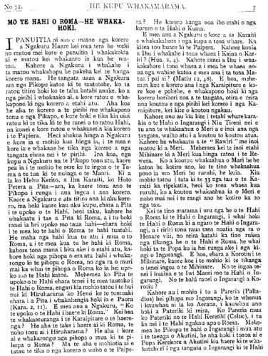 TE PIPIWHARAUROA, HAHI O ROMA. KI TE ETITA o TE PIPIWHARAUROA. ME whaka atu, ahau kia koe. Ko nga kai whakaako onga iwi Maori. Ki Te Matauranga. He Pakeha anake mo Ha- to Petera. Mo to korero Hore kau i roto i te karaipiture, Tona whaka Turanga; hei apo ko. Mo Te Hahi. Me To kupu anohoki e kore oku kanohi e kite o Tira e Te Etita. Kua kite oku kanohi. Ko. He hu kerite i whiriwhiri ia Hato Petera. Hei upoko. Mo Tona Hahi i Hoatu hoki kia ia Ngaki, o te rangatiratanga o te rangi. Matui 16. 18 19. Ko te upoko o te Hahi i Haere ki Roma. Ka Hore He Take kia whaka aturia tenei E He- hukerito. i Tono Hoki ia i nga Potoro kia kau whau ki te ao katoa kati ngariwhi o Ha- to Petera i noho katoa ki Roma. Hoi e mea ana koe E ki ana te whaka roherohenga. E kore e Tika kia Tohea nga mea ka Hore nei i Te karaipiture. Me Titiro koe ki te kupu A Hehu kerito i te 2 teharo niko. 2up 15ra. Na Eaku Teina Etu koutou kia mau kinga whakaakoranga i whaka akona ai koutou. E Te Kupu ranei e ta matou Pukapuka ranei. Hato Hoane 21. 25. Na tera atu ano tini onga mea i mea ai A Hekukerito. Mei tuhi- tuhia katoa Tia e nei mea. E mea ana a hau e kore e whai Ta Kotoranga. Ki Te ao nei. A konga Pihopa o Roma Hei whaka Haere i nga Tikanga o te Hahi moia whenua moia whenua. No te Timatanga mai ano o te Hahi. '2 Mo Hatamaria. Na. Te atua ano i whiri whiri ia hei matua Wahine Mo He hukerito e kore ia e whaka kahore kinga kupu akona whaea. E whaka rite ana matou tona kupu. Amua ake kaimeinga tia ahau Enga whaka paparanga. Katoa He wahine hari otira e whaka heana te Etita o te Pipi inga Tika nga o tona Hahi ano. He Tini nga Tangata o te Hahi oinga- rangi E inoi ana ki te whaka ahua o Hata Mana e tuana irotu i o ratou whare karakia. Kei Meinga He Tito. Tenei. He konohi o te Pakeha E kite ana. 3 He Pono to korero kua ru kea E te Hahi oingarangi. Nga Tik- anga o te Hahi o Roma. E rangi no te Ta- kiwa i Muri i a Henare viii. No te Timata tanga mai o te Hahi kingarangi E Kitea Ana ko Enei Tikanga. Ko te whaki Hara ko te Miha. Ko tewai Tapu. Te tohu o te ripeka me ra atu Tikanga. Tae noa kingara o Henare viii Tena kei Hea nga Mihinare i aua ra. E mea ana koe ko Piti He Pikopo. He katorika anake ngakai Tuhituhi o aua ra He ahara te kitea ai Te tahi mihi nare i aua ra. Hei Tuara mo te Pipi kia tino nui ai te kite rena kanohi ko wai ra nei tetahi Tangata o tenei Ao i hoatu e He hukerito ngaki o te rangatiranga o te rangi kia ia i Tahaki atu i a Hato Petera. Koia Hoki te upoko onga Potoro. A. He Pihopa ano ohoma no mua mai ano. A. Ko Pio x te upoko onga Piho- pa e noho ana ki Roma. Kati ki taku Titiro kahore ano te Etita o te Pipi kia Matau He hihi nare a korotiu i te Take o te Takanga o Tia- roa i roto i te Hahi kahore pea ia e Matau ana. E 20, 000, 000 katorika kei Tia maua i tenei waahi. Mo To Korero ko aku Tina Te Pihopa tu- atahi kua Tae ki ngarangi i te tau 597 Ehoa He Pihopa katorika ano to i nga rangi i mua atu i a akutina. Ko Pareina Ballidius. No te tau 431 ko Hato Pateriki ki airana i te tau 432 He kupu mutunga naku kia koe e te Etita me Tino whaka ako koe i te Hitoria o Kimi. Mo te Timata tanga o te Hahi ki ngarangi Hoi Mo To Kupu. E te Etita E Kara- kia ana nga Pikopo. Kia Mari, Te ahua o tenei korero au. E mea ana. Ko Mana tea tua o nga Pikopo. Kei Pohehe Koe ki tena E kore e kitea e koe te kupu i roto i nga Puka Puka karakia anga katorika E Penei aua te kupu. E Hata Mana. e to matou atua tae noa Kinga Hato. Ki Te kite koe kena korero. i roto i a Matou- Pukapuka katu ku mai kia kite ahau. Ko te tahi o whaka He ko Te kore o te waina o te Hapa E kore e Hoatu. Ki te whaka Minenga. Hoi E kore au e whaka utu i tenei kei tino roa. E rangi Mehemea me tu tinana mai koe ki mua kia hau. Mo tena Take. He roa rawa Te 20 Meneti kua Puru to waha. E hoa kei riri koe. Katahi ano Taku kupu taimaha ki Tou tinana ko tena. E rangi He Kupu Pono. Hoi ano, NGAKURU P. HAARE, Kaihu.