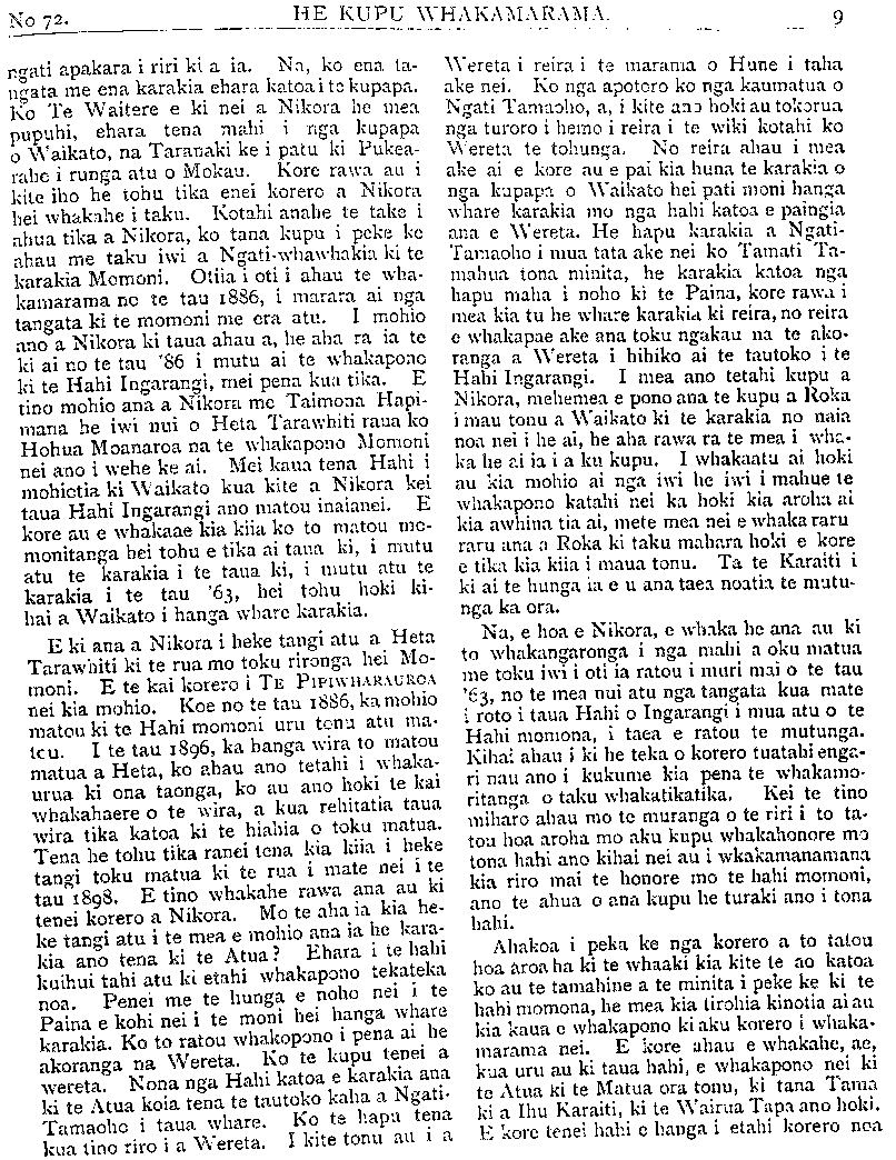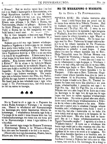 TE PIPIWHARAUROA. o Roma? Kei te mohio ranei koe i te hui nui o te Hahi i karangatia e Konotatama, e te kingi Karaitiana tuatahi, i tu nei ki Aara (Council of Arles) i te tau a.d, 314 tokotoru nga pihopa o Ingarangi i tae ki taua hui? Ehara aua pihopa i te Hahi o Roma, me Konotataina, ehara i te pikopo. Kahore kau he Hahi Pikopo o era ra engari i whai te Hahi o Roma ko ia hei rangatira mo nga hahi katoa i muri mai. Ko te tino tangata e inoi ana nga Pikopo ko Meri, ehara ia nei tenei i te karakia ki a Meri? Kahore au e riri mo nga korero whakape- hapeha a Ngakuru e kore e pau te 20 meneti kua puru toku waha ia ia. He tu tono no te tangata kuare te whakapehapeha. Kei te mo- hio a Ngakuru e kore ia e kite i a au ua reira i ia toa ai ki te pakiwaha. E kore rawa koe e whai kupu ki te kore koe e tohutohungia e o pakeha. Kua korero ranei koe i te " hitoria a Kirini?" Ki te ahua o to tuhituhi Maori, kahore koe e mohio ki te tuhituhi Maori; ka- hore ano hoki e mohio; ki te tuhituhi i te Reo Ingarihi. E hoa he tikanga na nga pikopo te tango i nga korero wananga. He wana- nga noa a koutou korero mo Pita, mo Ruhiu -puritia ko nga korero e marama ana he pono. Me kaati pea ta tau whakaki noa i nga wha- rangi o TE PIPIWHARAUROA, kei riria taua e te iwi na ratou te taonga. No te Turei te 16 o nga ra o Pepuere ka moe a Ruka Aratapu o Turanga i te moenga roa. Henui te whakanui ate Kawanatanga ite kawenga atu tenei kaumatua kitona ta- kotoranga. I whakahaua kotoatia nga hoia o Turanga ki te arahi i tona tinana kite rua hei whakamaharatanga mo tona toa me tona piri ki te Kawanatanga i mua i nga takiwa o te whawhai. Kua taemai nga rongo ko Henare Tomoana o Heretaunga Mema o te Whare-o-Runga kua riro ano ite huarahi o te tini o te mano. [Haere atu ra e nga kaumatua, Haere, haere. Haere atu kite tini ki te mano.] MO TE WHAKAPONO O WAIKATO. KI TE ETITA O TE PIPIWHARAUROA. TENA KOE! He whaka marama ake tenei i etehi kupu kua pa pouri nei ki to tatou hoa minita ki a Nikora Tautau. Kei te mahara pea tatou i panuitia e taua Rev. Honore nei i Te Pipi, No. 68. I mea ia no te tau 63 ka mahue te karakia i nga tangata o Waikato, kua tino tutuki te wha tekau tau kaore rawa he whare karakia o nga Maori o tenei takiwa nui o Waikato. No to raua tae- nga mai ko Rev. Taimona ki tenei takiwa ko- ia i tu ai he whare karakia ki Te Pourewa. Na aua kupu i puta ai toku mahara me wha- katikatika te pohehe o enei kupu. I mea ahau i tu ano he whare karakia ma te Rev. Heta Tarawhiti raua ko Hohua Moana roa ki Taupiri ki Weraroa, i hanga ena whare i muri o te tau 1872. I mea ano au i mau to- nu te whakapono o nga kupapa o Waikato i muri o te tau 1863, tae noa iho ki te tau 1886. He maha nga hapu o Rev. Heta Tarawhiti na ratou i awhina te whare karakia i tu ki Tauperi. I kite ano a Rev. Taimona Hapi- mana i taua whare karakia kua riro te pere o taua whare ki te Pou rewa. Heoi kua puta mai te kupu whaaki a te Rev, N Tautau in- aianei he tono mai nana kia unuhia e au aua kupu whakatikatika i panuitia nei eau i te Pipi No. 69. Kei Te Pipi No. 70, e ki ana a Nikora me unu aku kupu ki te kore au e unu ka karanga ia ki nga iwi, ki nga reo ki nga hapu me kore to ratou ngakau whakarongo ki aua kupu. No reira e penei ake ana ahau, kore rawa tetahi kupu whakamarama a Niko- ra ko te whea o aku korero e he ana. Mehe- mea nei e penei ana ia ahakoa i hanga whare karakia ano i whakapono tonu hoki i muri o te tau 63, hei aha i korerotia ai, te take kia rere totoa mai ai nga moni a te tangata ki ta ratou kohi moni. He aha koia koe te kara- poti iho ai i o kupu whakamanamana mo Ngatitamaoho anake? I apitiria ai e koe a Waikato katoa? E kore au e whakaae kia huna nga mahi pai a oku maatua me oku ha- pu kua poto ki te mate kia waiho hei mea e ngakau ai te rere o te moni a te tangata. Ko nga ahua karakia hauhau a te hauhau ara te Pao miere. Te Tariao me era atu karakia hauhau i homai e Nikora hei tohu mo te tika o tana, tae noa ki a Te Awhenga, ki a kingi o