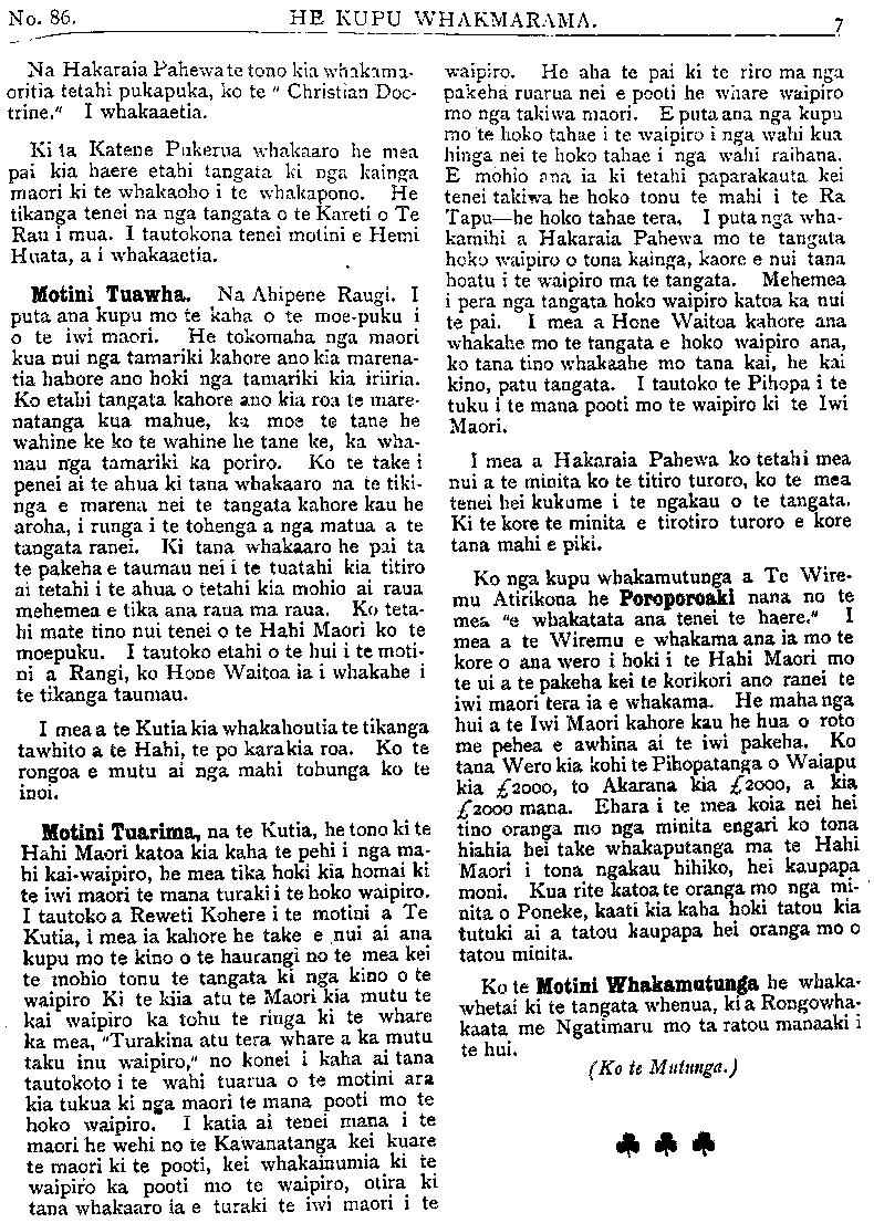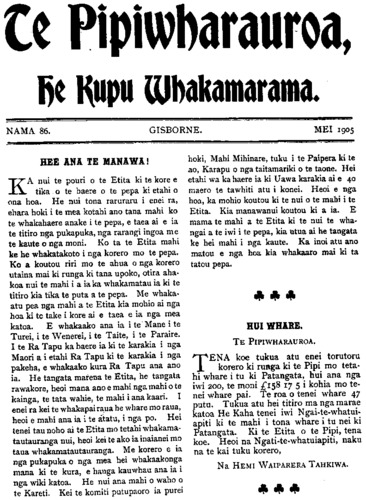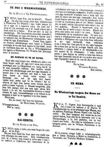 TE PIPIWHARAUROA TE POU O WHANGAPARAOA. Ki TE ETITA O TE PIPIWHARAUROA. EHOA, tena koa, me te komiti. Panui- tia atu kia rongo mai nga whanaunga o Haimona Te Waititi i nga wahi katoa no 22 o nga ra o Aperira 1905 ka hori nei i moe ai i te moenga roa o te mate e kore nei e hoki mai ki a tatau. Kua tae atu ia kai te okiokinga. He kaumatua atawhai manuhiri, he o-kiokinga no nga iwi katoa e haere ana i te takutai nei, he kaumatua whakapono, ata- whai ki nga Karaitiana. Tenei kua ngaro to koutou okiokitanga, mai tenei a Tikirau maunga te tu nei kua ngaro te kai tiaki, tenei te tuwhera kau nei te riu o 'Whangaparaoa ka ngaro a Haimona Te Waititi hai karanga atu i a koutou. HE POWHIRI KI TE AO KATOA. Kati ake enei kupu me whakaatu ake e au tana kupu mihi ki nga iwi i mua atu o tona matenga ara i a Hepetema 12, 1903, ka ki ia ki ana tamariki wahine kia mahia tetahi whare hai okiokitanga mai mo nga tangata e haere ana i te takutai nei kati e hoa ma kua mate ia tenei tona whare te karanga atu nei ki nga tira haere «peka mai, peka mai ki te whare," ka tu whera ki nga tira haere tona whare ara te poho-o -tana tupunu o Kauae-tangohia, aha koa kiri pango kiri ma ara nga ahua kiri katoa i te ao, ka manaakitia koutou e tenei whare ki nga manaakitanga a te whare a te tangata e hari ai te ngakau o te tira haere. Heoi ana, Ko au tenei, hai hoa mo koutou, ko MANIHERA WAITITI. Whangaparaoa, Mei 9, 1905 KAIREHITA. Ki TE ETITA O TE PIPI. EHOA mau e tuku atu enei kupu ki roto ki te Pipi. He tau hou tenei ka hou ano ona mahi me ona tikanga me ona ture. Kia whakaatutia ano ki o tatou hoa maori e noho ana i roto i te takiwa o Takitimu kei wareware ki te whakaatu mai nga ra whanautanga tamariki me nga ra matenga tupapaku. I taku rongo ka- nui nga tamariki whanau hou o tera tau tae mai ki tenei tau me nga tupapaku kua mate kaati kaore ano kia tae mai he whakaatu ki a au kei te wareware pea te iwi Maori inaianei mo te mahi rehita kia penei tonu tatou me te iwi pakeha. Kaore e wareware ana no te mea kei te wehi ratou i te ture. Kaati me pera ano tatou me wehi i te ture. Kaati te whakakeke ki te whakaatu mai. Ia toru ma- rama e whakaatutia ana e au ki te kai rehita pakeha o Kihipane nei nga mea kua rehitatia e au nga tamariki kua rehitatia e au o tera tau i tae pea ki te 20, nga tupapa- ku o tera tau 30 ko te nuinga kaore ano kia rehitatia i runga hoki o te whakakeke o te iwi maori ki te whakaatu. I taku mohio penei i pau katoa te rehita o tera tau tera e tae nga tamariki tata ki te 100 nuku atu ranei nga tupapaku tata ki te 100 iti iho ranei. Heoi ano Na te hoa WAKANA KINIHA. Kai-rehita. HE MEMA. He Whakaaringa tangata Hei Mema mo te Tai Rawhiti. KO A. T. Ngata kua karangatia e nga iwi o-roto i te takiwa o te Paritu ki Tarakeha kia tu, ki te whakaaringa Mema, mo te takiwa Pootinga Mema Maori o te Tai Ra- whiti. He tino tangata nui tenei no te iwi maori katoa, kua eke ki te taumata nui o te Matauranga, o te Iwi pakeha, me te iwi maori ano hoki. Ka tika te whakaara i te tu tangata pena, mo te Whare Paremete o te Koroni. (He mea tuku mai.) Ki ta matou rongo hoki e whakaingoatia. ana a Ihaia Hutana, a Mohi te Atahikoia, a Taranaki, me Tuhaka Mokena Kohere.