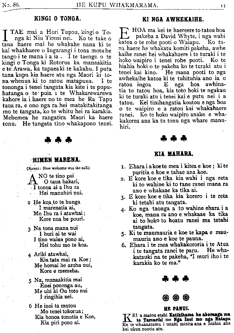HE KUPU WHAKAMARAMA. KINGI O TONGA. I TAE mai a Hori Tupou, kingi o To- nga ki Niu Tireni nei. Ko te take o tana haere mai he whakahe nana ki te kai whakhaere o Ingarangi i tona motu he tango i te mana i a ia . I te taenga o te kingi o Tonga ki Rotorua ka manaakitia e te Arawa, ka tapaea ki te kakahu. I puta tana kupu kia haere atu nga Maori ki to- na whenua ki to ratou matapuna. I te tononga i tenei tangata kia kite i te pupu- hatanga o te puia i te Whakarewarewa kahore ia i, haere no te mea he Ra Tapu taua ra, e ono nga ra. hei matakitakinga mo te tangata, ko te whitu hei ra karakia. Mehemea he rangatira Maori ka haere tonu. He tangata tino whakapono tenei. HIMEN MARENA. (RANGI: How welcome was the call.) A NO te tiho pai O taua hakari, I tonoa ai a Ihu ra Hei manuhiri nui. 2 He koa, to te hunga I marenatia ai, Mo Ihu ra i atawhai; Kore noa he pouri. 3 Na tona mana nui I huri ai te wai I tino waina pono ai, Hei tohu mo te koa. 4 Ariki atawhai, Kia tata mai ra Koe; Me homai he aroha nui, Kore e memeha. 5 Na, manaakitia mai Enei pononga au, Me uhi ki Ou toto nui I ringihia nei. 6 He inoi ta matou Mo tenei tokorua; Kia honoa tonutia e Koe, Kia piri pono ai. KI NGA AWHEKAIHE. EHOA ma kei te haereere to tatou hoa pakeha a David Whyte, i nga wahi katoa o te rohe pooti o Waiapu. Ko ta- na haere he whakatu komiti pakeha, awhe kaihe ranei hei whakahaere i te turaki i te hoko waipiro i tenei rohe pooti. Ko te hiahia hoki o te pakeha ko te turaki atu i tenei kai kino. He mana pooti to nga awhekaihe katoa ki te tuhituhia ano ia o ratou ingoa E nga hoa awhina- tia to tatou hoa, kia toto hoki te ngakau ki te turaki atu i tenei kai e putu nei i a tatou. Kei tinihangatia koutou e nga hoa o te waipiro e a ratou kai whakahaere ranei. Ko te hoko waipiro anake e wha- kakorea ana ka tu tonu nga whare manu- hiri. KIA MAHARA, 1. Ehara i a koe te mea i kitea e koe; ki te puritia e koe e tahae ana koe. 2. E kore koe e tika kia wahi i nga reta ki to wahine ki to tane ranei mana ra ano e whakaae ka tika ai. 3. E kore koe e tika kia korero i te reta ki tetahi atu tangata. 4. Ko nga taonga a to wahine ehara i a koe, mana ra ano e whakaae ka tika ai to hoko to hoatu ranei ma tetahi tangata. 5. Ki te maumauria e koe te kapa e mau- mauria ano e koe te pauna. 6. Ehara i te mea whakakororia i te Atua i te tangata ranei te paru. He wha- katauki na te pakeha, "I muri iho i te karakia ko te ma." HE PANUI. KEI a matou etahi Katikihama he akoranga ma te Tamariki me Nga Inoi mo nga Ratapu Ke te whakaatuma i tetahi minita ana e hiahia ana hei ukun noatia atu.