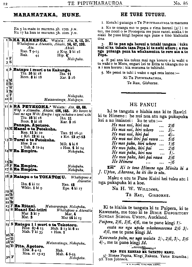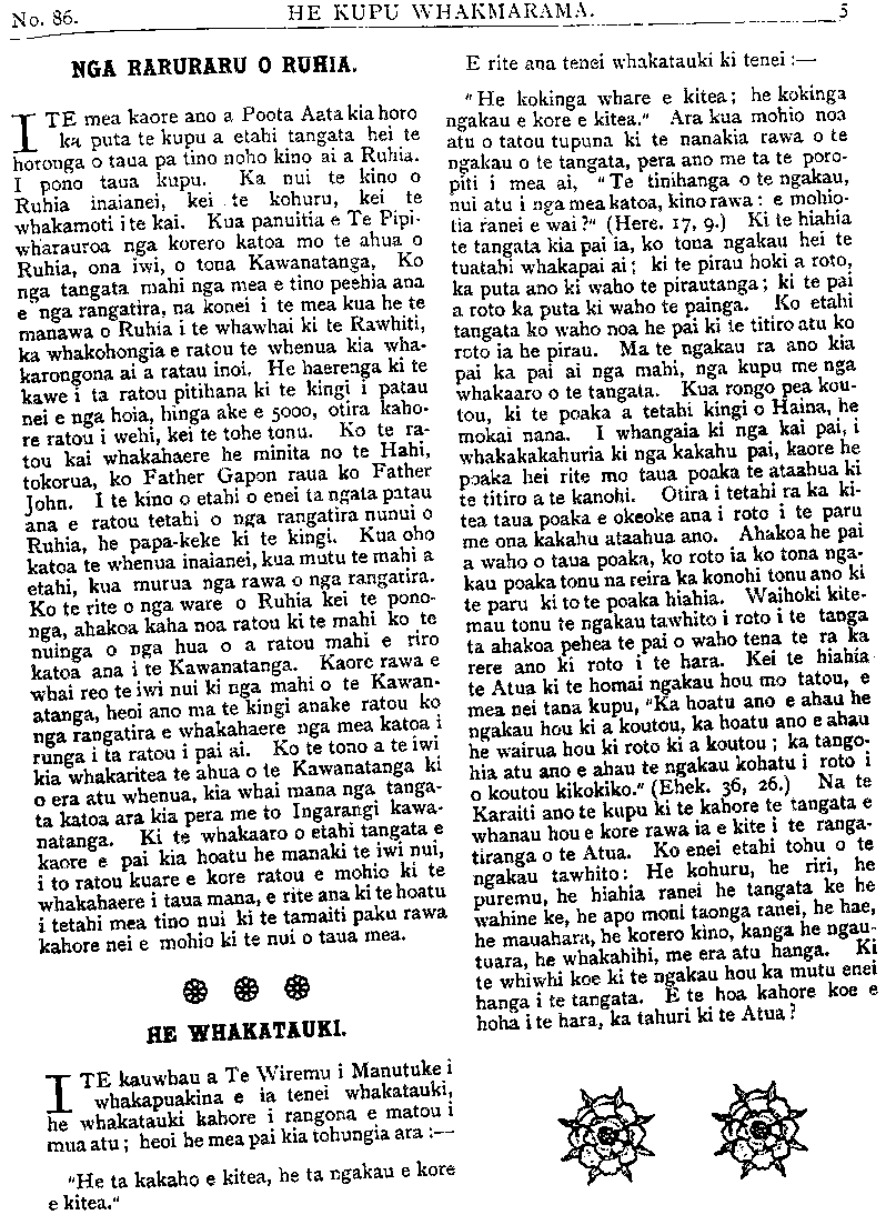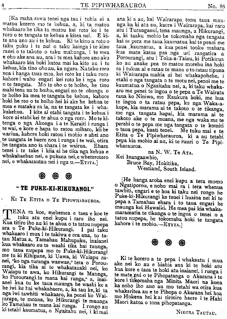 TE PIPIWHARAUROA [Ka maha rawa tenei nga tau i tuhia ai a matou korero mo te kehua, a, ki ta matou whakaaro he tika ta matou kei roto ke i te roro o te tangata te kehua e kitea nei. E ki- te ana ano au i te kehua. Ki te kino a roto o taku puku i te nui o taku kainga i te kino ranei o te takoto o taku mahunga, i te mea e oho ake ana au, ara i te mea kahore ano aku whakaaro kia hoki katoa mai ka kite au i te kehua, kia tino oho au, ka ngaro. Na taku roro noa i hanga taua mea, kei roto ke i taku roro kahore i waho engari kei roto ke i nga roro o te tangata. Mo te oho o te hoiho, he tino mahi tena na te hoiho, engari no te ohonga o te hoiho ka mea te tangata he kehua, kahore hoki he reo o te hoiho hei ki ake he kehua te mea e mataku ra ia, na te tangata ke i wha- kakehua. I kite ai etahi tangata i te kehua i kore ai etahi kei te ahua o nga roro. Mo te ki- tenga o nga. Akonga i a te Karaiti i runga i te wai, e kore e hapa to ratou miharo, kii he wariua, kahore hoki ratou i mohio e ahei ano te tangata te haere noa i runga i te wai, otira he tangata ano ia ehara i te wairua. Ehara tenei i te take i kiia ai he tika nga kehua e whakahaehae nei, e pukana nei, e wheterotero nei, e whakatautau nei i nga u.—ETITA.] " Te Puke-ki-Hikurangi." Ki TE ETITA o TE PIPIWHARAUROA. TENA ra koe, mehemea e taea e koe te tuku atu enei kupu i raro iho nei. Kua titiro iho au ki te ahua o ta tatou nupepa ara o Te Puke-ki -Hikurangi. I pai taku whakaaro i mua i te takiwa e ora ana, to ta- tau Matua a, Tamahau Mahupuku, inaianei kua whakaaro au te waahi tika hai tuunga, mo taua nupepa mo te Puke-ki-Hikurangi me tu ki Kihipane, ki Uawa, ki Waiapu ra- nei, "ko nga turanga waewae," tera o Porou- rangi, kia tika ai te whakatauaki nei, ko Waiapu te awa, ko Hikurangi te Maunga, ko Porourangi te mana kai runga," a, inai- anei kua tu ke taua maunga he waahi ke a he iwi ke hai whakahaere, a, ka tau ke, ki ta nga iwi tawhiti whakaaro, ka penei ko Wai- rarapa, te moana, ko Hikurangi te maunga ko Tamahau te mana kai runga. I rongo au ki tetahi kaumatua, o Ngaitahu nei, i ki mai ana ki a au, kai Wairarapa tonu taua mau- nga ka ki atu au, kaore i Wairarapa, kai raro atu i Turanganui, tena maunga, a Hikurangi, a, ki taaku mohio he tokomaha nga tangata kai te pera me taua kaumatua kai te penei me taua kaumatua, a kua penei tooku mahara kua mate katoa pea nga uri rangatira a Porourangi, atu i Toka-a-Taiau, ki Potikirua ko au anake pea to matou morehu ina hoki ra i tukua ai e ratau te mana o to ratau tipuna ki Wairarapa mahia ai hei whakapohehe, i etahi o nga tangata o te motu nei, penei me te kaumatua o Ngaaitahu nei, a, ki taku whaka- aro me penei te ingoa o te pepa a Te Wairata raua ko Niniwa, me Raukura hoki, me hua te ingoa o ta ratau pepa, ko nga Waka-a- kupe, kia marama ai te takoto o te tikanga, me nga tangata hapai, kia marama ai te takoto ake o te moana, me nga waka me te perehi o te pepa me nga tangata o te komiti o taua pepa, kaati tenei. Me tuku mai e te Etita o Te Pipiwharauroa, ki a au tetahi pepa kia mohio ai au, ki te ruuri o Te Pipi- wharauroa. na N. W. Te ATA. Kei Inangaawhio, Bruce Bay, Hokitika, Westland, South Island. [He hanga aroha enei kupu a tera momo o Ngatiporou, e noho mai ra i tera whenua tawhiti, engari e te hoa ki taku nei rongo he Puke-ki-Hikurangi ke tenei i huaina nei ki te pepa a Tamahau ehara i to taua engari he maunga kei Hawaiki. He mea pai kia whaka- maramatia te tikanga o te ingoa o tenei o a tatou nupepa, he tokomaha hoki te tangata kahore i te mohio.—ETITA.] Ki te korero a te pepa i whakaatu i mua ake nei ko au e hiahia ana ki te hoki atu kua kore e taea te hoki atu inaianei, i runga i te matenui o te Pihopatanga o Akarana i te kore i tokomaha, nga Minita Maori na kona ka noho iho ano au mo tetahi wa otira kua whakaritea au e te Pihopa o Akarana hei hoa mo Hokena hei k ai tirotiro haere i te Hahi Maori katoa o tona pihopatanga. NIKORA TAUTAU.