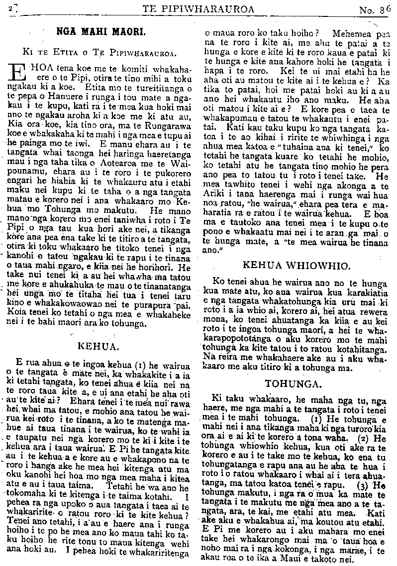 TE PIPIWHARAUROA NGA MAHI MAORI. i TE ETITA O TE PIPIWHARAUROA. EHOA tena koe me te komiti whakaha- ere o te Pipi, otira te tino mihi a toku ngakau ki a koe. Etita mo te tureititanga o te pepa o Hanuere i runga i tou mate a nga- kau i te kupu, kati ra i te -mea kua hoki mai ano te ngakau aroha ki a koe me ki atu au, Kia ora koe, kia tino ora, ma te Rungarawa koe e whakakaha ki te mahi i nga mea e tupu ai he painga mo te iwi. E manu ehara au i te tangata whai taonga hei haringa haeretanga mau i nga taha tika o Aotearoa me te Wai- pounamu, ehara au i te roro i te pukorero engari he hiahia ki te whakauru atu i etahi maku nei kupu ki te taha o a nga tangata matau e korero nei i ana whakaaro mo Ke- hua mo Tohunga mo makutu. He mano mano nga korero mo enei taniwha i roto i Te Pipi o nga tau kua hori ake nei, a tikanga kore ana pea ena take ki te titiro a te tangata, otira ki toku whakaaro he titoko tenei i nga kanohi o tatou ngakau ki te rapu i te tinana o taua mahi ngaro, e kiia nei he horihori. He take nui tenei ki. a au hei whawha ma tatou me kore e ahukahuka te mau o te tinanatanga hei unga mo te titaha hei tua i tenei taru kino e whakakowaowao nei te purapura pai. Koia tenei ko tetahi o nga mea e whakaheke nei i te hahi maori ara ko tohunga. KEHUA. E rua ahua & te ingoa kehua (II) he wairua o te tangata e mate nei, ka whakakite i a ia ki tetahi tangata, ko tenei ahua e kiia nei na te roro taua kite a, e ui ana etahi he aha oti • au te kite ai? Ehara tenei i te mea hui rawa hei, whai ma tatou, e mohio ana tatou he wai rua kei roto i te tinana, a ko te matenga ma- hue ai taua tinana i te wairua, ko te wahi ia e taupatu nei nga korero mo te ki i kite i te Kehua ara i taua wairua'. E Pi he tangata kite au i te kehua a e kore au e whakapono na te roro i hanga ake he mea hei kitenga atu ma oku kanohi hei hoa mo nga mea maha i kitea atu e au i taua taima. Tetahi he wa ano he tokomaha ki te kitenga i te taima kotahi. I pehea ra nga upoko o aua tangata i taea ai te whakaririte o ratou roro ki te kite kehua? Tenei ano tetahi, i a au e haere ana i runga hoiho i te po he mea ano ko maua tahi ko ta- ku hoiho he rite tonu to maua kitenga wehi ana hoki au. I pehea hoki te whakariritenga o maua roro ko taku hoiho? Mehemea pea na te roro i kite ai, mo ahu te patai a te hunga e kore e kite ki te roro kaua e patai ki te hunga e kite ana kahore hoki he tangata i hapa i te roro. Kei te ui mai etahi ha he aha oti au matou te kite ai i te kehua e? Ka tika to patai, hoi me patai hoki au ki a au ano hei whakautu iho ano maku. He aha oti matou i kite ai e? E kore pea e taea te whakapumau e tatou te whakautu i enei pa- tai. Kati kau taku kupu ko nga tangata ka- toa i te ao kihai i ririte te whiwhinga i nga ahua mea katoa e " tuhaina ana ki tenei," ko tetahi he tangata kuare ko tetahi he mohio, ko tetahi atu he tangata tino mohio he pera ano pea to tatou tu i roto i tenei take. He mea tawhito tenei i wehi nga akonga a te Ariki i tana haerenga mai i runga wai hua noa ratou, "he wairua," ehara pea tera e ma- haratia ra e ratou i te wairua kehua. E hoa ma e tautoko ana tenei mea i te kupu o te pono e whakaatu mai nei i te aran, ga mai o te hunga mate, a te mea wairua he tinana ano." KEHUA WHIOWHIO. Ko tenei ahua he wairua ano no te hunga kua mate atu, ko aua wairua kua karakiatia e nga tangata whakatohunga kia uru mai ki roto i a ia whio ai, korero ai, hei atua rewera mona, ko tenei ahuatanga ka kiia e au kei roto i te ingoa tohunga maori, a hei te wha- karapopototanga o aku korero mo te mahi tohunga ka kite tatou i to ratou kotahitanga. Na reira me whakahaere ake au i aku wha- kaaro me aku titiro ki a tohunga ma. TOHUNGA. Ki taku whakaaro, he maha nga tu, nga haere, me nga mahi a te tangata i roto i tenei mea i te mahi tohunga (I) He tohunga e mahi nei i ana tikanga maha ki nga turoro* kia ora ai e ai ki te korero a tona waha. (2) He tohunga whiowhio kehua, kua oti ake ra te korero e au i te take mo te kehua ko ena tu tohungatanga e rapu ana au he aha te hua i roto i o ratou whakaaro i whai ai i tera ahua- tanga, ma tatou katoa tenei e rapu. (3) He tohunga makutu, i nga ra o mua ka mate te tangata i te makutu me nga mea ano a te ta- ngata, ara, te kai, me etahi atu mea. Kati ake aku e whakahua ai, ma koutou atu etahi. E Pi me korero au i aku mahara mo enei take hei whakarongo mai ma o "taua hoa e noho mai ra i nga kokonga, i nga marae, i te akau roa o te ika a Maui e takoto nei.