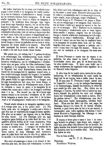HE KUPU WHAKAMARAMA. Ki taku mahara ko te mea nui i takoto kau- papa i enei mahi a te tangata he mahi maku- tu a ko te tianara whakahaere o tenei hunga ko te rewera raiona horo tangata. E ki ana etahi tangata kua kore e mate te tangata o naianei i te makutu kua kainga nga tapu, kua kore nga karakia maori, he ra no te wha- kapono inaianei. E tika ana pea ena kupu engari ki taku mahara na enei kupu, i kataina whakahorohorotia mai ai tatou e taua ropu kei te hari mai ratou ki a tatou e hapahapai nei i enei take, a ka tahuri ano tatou ki te hanga tunga mo ratou. He tino tunga ano no ratou tenei kupu e kore te pakeha me te ture e wha- kapono ki tenei mahi a te maori. Kia hoki ake inaianei he korero maku ki nga kupu a etahi e ki nei kua mutu taua mana. Me patai au, no tehea wa? I pehea te ahua o te meatanga kia whakamutua taua mahi? He aha te kai haukoti atu? Hoi ano pea ta koutou whakautu, na te whakapono i whaka- kore atu, ae pea, otira he tika mehemea i taea te ngakau o te tangata te tino motuhake kia te Karaiti hei tino Karaitiana mana tena ko tenei ko te nuinga kei te ngakau maori ano, a kia mahi tohunga katahi ka hapai i te karakia me te karaipiture hei hipoki "kirihipi" mona. He penei hoki to nga rewera tu, e tango ana ki nga karaipiture hei pou mo tana kupu, a kei nga rewera ano te whakapono noa, e kore te rewera e taea te patu e te tangata ki te rakau kia mate atu i roto i te hunga e awhina ana i a ia. Na konei au ka ki e kore nga mana maori a te rewera i whakato ai ki roto ki te tangata e mate kau noa iho i te tu kau mai o te whakapono i waho atu o te tangata. Tenei etahi ahua a te tangata ngakau mao- ri e rongo ana au, a he pono ano. (I) He hira noa atu te tangata e noho nei e kore e pai kia tae te waiwera ki runga ki tana upoko. He aha ra te take? ae rapua, ma a, ka kitea, he aha ranei. (2) He tikanga ano na nga tangata pera kohia ai te roke kuri ki roto i te pakete aikiha kohia ai ki tona manawa, heia ai ranei ki tona kaki hei arai atu i te mate mona a tetahi atu. I runga i te mahio ki te pono o a ratou mahi ara ki te mau tonu ratou ki aua tikanga mei torutoru pea te roke kuri nui atu te utu ki a ratou mo te aunihi i to te tutae tohora (amakirihi). Ko enei ahuatanga o taua o te maori e ko- rerotia ake nei, he mea hei whakaara i a tatou kia titiro tahi kia whakaaro tahi ki te tika ki te he ranei o enei take. Kei enei ahua pea teta- hi take e whakaheke nei i to taua tupu tinana, tupu mahi, tupu tikanga, tupu whakaaro. I ki tetahi kupu a T. Pomare i te pepa o Mae- he, na te rongonga o te tangata kua makutu- tia ia koia i wehi ai i pouri ai nawai a he he- mo te mutunga. Ha ? Kahore ra te makutu ki te tangata e makuturia ana e mea ngaro koia anake i matau, engari ma te tohunga- tanga o tetahi e kite atu mehemea he tohunga- tanga to te mea i makututia. Erangi pea i mate ai i tenei wa ao hou kei te mahara tonu o ia tangata he kopere tena kua oti te wha- kapiko mai ano i nga tupuna e takoto nei i roto i tona wai i to nga iwi maori. Koia to- nu nei te mahara a te tangata he mea ano tera. E kore Pomare e mate me te mano o te pakeha, he aha ranei te take? He tuturu motuhake rawa atu pea ki te kore noa iho, he aha tetahi mea. E kore ano hoki au e mate mehemea ka tapatahi toku ngakau ki a te Karaiti toku hepara. E aku hoa ki te mahi tonu tatou ki te wha- kahawea, ki te whakateka ki enei mahi ka kapi nei te ao turoa, tera e neke tonu ia tau. E ki ana ano T. Pomare i mahi penei ano te Ingarihi i mua a no te nuinga haeretanga o te matauranga, katahi ka hohonu te titiro ki aua mahi he tito noa iho. Na, titiro no te kitenga o Taewa, he mahi tito a ratou na ma- kutu, katahi ka pahitia he ture nui whaka- hara hei whakakore i ena mahi a ratou. Ha? ka pehea tatou? Ka whakatuma noa iho? Hei aha tena mahi hamupaka, titotito hori- hori. Hua atu ka kite i te tito me rapu he tikanga, kaua e tu tonu ki te tawai whaka- hawea, e pari tonu ana te tai o te ao maori, e tumanako ana toku ngakau kia kitea i roto i tenei Koroni o Ingarangi, he tikanga e me- hemea ai enei karepe kaiota. E manu e kore pea e taea e koe i te rere- nga kotahi te pikau i nga kupu nei, engari e inoi atu ana ahau kia koutou ko te komiti ko taku hiahia kia kotahi tonu pepa hei putanga. Ko koutou ano ia e mohio ana. Kia ora koe kia kaha te ora. Na to hoa aroha na W. T. P. HAPETA, Naumai, Northern Wairoa.