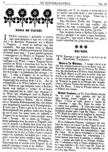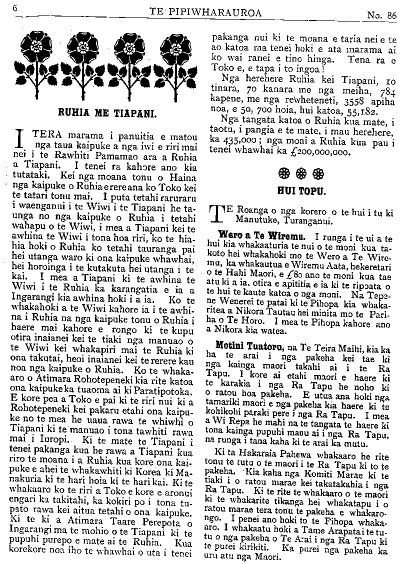 TE PIPIWHARAUROA RUHIA ME TIAPANI. I TERA marama i panuitia e matou nga taua kaipuke a nga iwi e riri mai nei i te Rawhiti Pamamao ara a Ruhia a Tiapani. I tenei ra kahore ano kia tutataki. Kei nga moana tonu o Haina nga kaipuke o Ruhia e rere ana ko Toko kei te tatari tonu mai. I puta tetahi raruraru i waenganui i te Wiwi i te Tiapani he ta- unga no nga kaipuke o Ruhia i tetahi wahapu o te Wiwi, i mea a Tiapani kei te awhina te Wiwi i tona hoa riri, ko te hia- hia hoki o Ruhia ko tetahi tauranga pai hei utanga waro ki ona kaipuke whawhai, hei horoinga i te kutakuta hei utanga i te kai. I mea a Tiapani ki te awhina te Wiwi i te Ruhia ka karangatia e ia a Ingarangi kia awhina hoki i a ia. Ko te whakahoki a te Wiwi kahore ia i te awhi- na i Ruhia na nga kaipuke tonu o Ruhia i haere mai kahore e rongo ki te kupu otira inaianei kei te tiaki nga manuao o te Wiwi kei whakapiri mai te Ruhia ki ona takutai, heoi inaianei kei te rerere kau noa nga kaipuke o Ruhia. Ko te whaka- aro o Atimira. Rohotepeneki kia rite katoa ona kaipuke ka tuaoma ai ki Paratipotoka. E kore pea a Toko e pai ki te riri nui ki a Rohotepeneki kei pakaru etahi ona kaipu- ke no te mea he uaua rawa te whiwhi o Tiapani ki te manuao i tona tawhiti rawa mai i Iuropi. Ki te mate te Tiapani i tenei pakanga kua he rawa a Tiapani kua riro te moana i a Ruhia kua kore ona kai- puke e ahei te whakawhiti ki Korea ki Ma- nakuria ki te hari hoia ki te hari kai. Ki te whakaaro ko te riri a Toko e kore e aronui engari ka takitahi, ka kokiri po i tona tu- pato rawa kei aitua tetahi o ona kaipuke. Ki te ki a Atimara Taare Perepota o Ingarangi ma te mohio o te Tiapani ki te pupuhi purepo e mate ai te Ruhia. Kua korekore noa iho te whawhai o uta i tenei pakanga nui ki te moana e taria nei e te ao katoa ma tenei hoki e ata marama ai ko wai ranei e tino hinga. Tena ra e Toko e, e tapa i to ingoai Nga herehere Ruhia kei Tiapani, 10 tinara, 70 kanara me nga meiha, 784 kapene, me nga rewheteneti, 3558 apiha noa, e 50, 700 hoia, hui katoa, 55, 182 . Nga tangata katoa o Ruhia kua mate, i taotu, i pangia e te mate, i mau herehere, ka 435,000 ; nga moni a Ruhia kua pau i tenei whawhai ka £200, 000, 000. HUI TOPU. TE Roanga o nga korero o te hui i tu ki i Manutuke, Turanganui. Wero a Te Wiremu. I runga i te ui a te hui kia whakaaturia te nui o te moni kua ta- koto hei whakahoki mo te Wero a Te Wire- mu, ka whakautua e Wiremu Aata, hekeretari o te Hahi Maori, e £80 ano te moni kua tae atu ki a ia. otira e apititia e ia ki te ripoata o te hui te kaute katoa o nga moni. Na Tepe- ne Wenerei te patai ki te Pihopa kia whaka- ritea a Nikora Tautau hei minita mo te Pari- ha o Te Horo. I mea te Pihopa kahore ano a Nikora kia watea. Motini Tuatoru, na Te Teira Maihi, kia ka ha te arai i nga pakeha kei tae ki nga kainga maori takahi ai i te Ra Tapu. I kore ai etahi maori e haere ki te karakia i nga Ra Tapu he noho ki o ratou hoa pakeha. E utua ana hoki nga tamariki maori e nga pakeha kia haere ki te kohikohi paraki pere i nga Ra Tapu. I mea a Wi Repa he mahi na te tangata te haere ki tona kainga pupuhi manu ai i nga Ra Tapu, na runga i tana kaha ki te arai ka mutu. Ki ta Hakaraia Pahewa whakaaro he rite tonu te tutu o te maori i te Ra Tapu ki to te pakeha. Kia kaha nga Komiti Marae ki te tiaki i o ratou marae kei takatakahia i nga Ra Tapu. Ki te rite te whakaaro o te maori ki te whakarite tikanga hei whakatapu i o ratou marae tera tonu te pakeha e whakaro- ngo. I penei ano hoki to te Pihopa whaka- aro. I whakaatu hoki a Tame Arapatai te tu- tu o nga pakeha o Te Arai i nga Ra Tapu ki te purei kirikiti. Ka purei nga pakeha ka uru atu nga Maori.