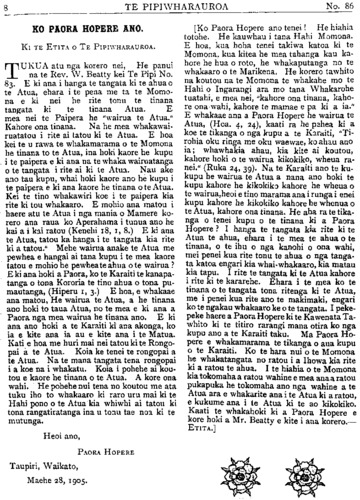 TE PIPIWHARAUROA KO PAORA HOPERE ANO. Ki TE ETITA O TE PIPIWHARAUROA. T U KU A atu nga korero nei, He panui 1 na te Rev. W. Beatty kei Te Pipi No. 83. E ki ana i hanga te tangata ki te ahua o te Atua, ehara i te pena me ta te Momo- na e ki nei he rite tonu te tinana tangata ki te tinana Atua. E mea nei te Paipera he "wairua te Atua." Kahore ona tinana. Na he mea whakawai- ruatatou i rite ai tatou ki te Atua. E hoa kei te u rawa te whakamarama o te Momona he tinana to te Atua, ina hoki kaore he kupu i te paipera e ki ana na te whaka waruatanga o te tangata i rite ai ki te Atua. Nau ake ano tau kupu, whai hoki kaore ano he kupu i te paipera e ki ana kaore he tinana o te Atua. Kei te tino whakawiri koe i te paipera kia rite ki tou whakaaro. E mohio ana matou i haere atu te Atua i nga mania o Mamere ko- rero ana raua ko Aperahama i tunua ano he kai a i kai ratou (Kenehi 18, I, 8.) E ki ana te Atua, tatou ka hanga i te tangata kia rite ki a tatou." Mehe wairua anake te Atua me pewhea e hangai ai tana kupu i te mea kaore tatou e mohio he pewhea te ahua o te wairua? E ki ana hoki a Paora, ko te Karaiti te kanapa- tanga o tona Kororia te tino ahua o tona pu- mautanga, (Hiperu 1, 3.) E hoa, e whakaae ana matou, He wairua te Atua, a he tinana ano hoki to taua Atua, no te mea e ki ana a Paora nga mea wairua he tinana ano. E ki ana ano hoki a te Karaiti ki ana akonga, ko ia e kite ana ia au e kite ana i te Matua. Kati e hoa me huri mai nei tatou ki te Rongo- pai a te Atua. Koia ke tenei te rongopai a te Atua. Na te mana tangata tena rongopai i a koe na i whakatu. Koia i pohehe ai kou- tou e kaore he tinana o te Atua. A kore ona wahi. He pohehe nui tena no koutou me ata tuku iho to whakaaro ki raro uru mai ki te Hahi pono o te Atua kia whiwhi ai tatou ki tona rangatiratanga ina u tonu tae noa ki te mutunga. Heoi ano, PAORA HOPERE Taupiri, Waikato, Maehe 28, 1905. [Ko Paora Hopere ano tenei! He hiahia totohe. He kauwhau i tana Hahi Momona. E hoa, kua hoha tenei takiwa katoa ki te Momona, kua kitea he mea tahanga kau ka- hore he hua o roto, he whakaputanga no te whakaaro o te Marikena. He korero tawhito na koutou na te Momona te whakahe mo te Hahi o Ingarangi ara mo tana Whakarohe tuatahi, e mea nei, "kahore ona tinana, kaho- re ona wahi, kahore te mamae e pa ki a ia." E whakaae ana a Paora Hopere he wairua te Atua, (Hoa. 4, 24), kaati ra he pehea ki a koe te tikanga o nga kupu a te Karaiti, "Ti- rohia oku ringa me oku waewae, ko ahau ano ia; whawhakia ahau, kia kite ai koutou, kahore hoki o te wairua kikokiko, wheua ra- nei." (Ruka 24, 39)- Na te Karaiti ano te ku- kupu he wairua te Atua a nana ano hoki te kupu kahore he kikokiko kahore he wheua o te wairua, heoi e tino marama ana i runga i enei kupu kahore he kikokiko kahore he whenua o te Atua, kahore ona tinana. He aha ra te tika- nga o tenei kupu o te tinana ki a Paora Hopere? I hanga te tangata kia rite ki te Atua te ahua, ehara i te mea te ahua o te tinana, o te ihu o nga kanohi o ona wahi, mei penei kua rite tonu te ahua o nga tanga- ta katoa engari kia whai-whakaaro, kia matau kia tapu. I rite te tangata ki te Atua kahore i rite ki te kararehe. Ehara i te mea ko te tinana o te tangata tona ritenga ki te Atua, me i penei kua rite ano te makimaki, engari ko te ngakau whakaaro ke o te tangata. I peke- peke haere a Paora Hopere ki te Kawenata Ta- whito ki te titiro rarangi mana otira ko nga kupu ano a te Karaiti taku. Ma Paora Ho- pere e whakamarama te tikanga o aua kupu o te Karaiti. Ko te hara nui o te Momona he whakatangata no ratou i a Ihowa kia rite ki a ratou te ahua. I te hiahia o te Momona kia tokomaha a ratou wahine e mea ana a ratou pukapuka he tokomaha ano nga wahine a te Atua ara e whakarite ana i te Atua ki a ratou, e kukume ana i te Atua ki te ao kikokiko. Kaati te whakahoki ki a Paora Hopere e kore hoki a Mr. Beatty e kite i ana korero.— ETITA.]