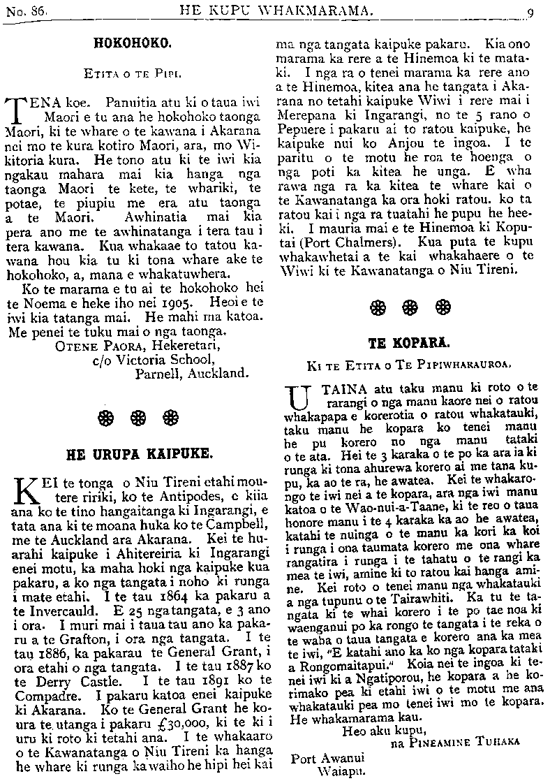 HE KUPU WHAKAMARAMA. HOKOHOKO. ETITA O TE PIPI. TENA koe. Panuitia atu ki otaua iwi Maori e tu ana he hokohoko taonga Maori, ki te whare o te kawana i Akarana nei mo te kura kotiro Maori, ara, mo Wi- kitoria kura. He tono atu ki te iwi kia ngakau mahara mai kia hanga nga taonga Maori te kete, te whariki, te potae, te piupiu me era atu taonga a te Maori. Awhinatia mai kia pera ano me te awhinatanga i tera tau i tera kawana. Kua whakaae to tatou ka- wana hou kia tu ki tona whare ake te hokohoko, a, mana e whakatuwhera. Ko te marama e tu ai te hokohoko hei te Noema e heke iho nei 1905. Heoi e te iwi kia tatanga mai. He mahi ma katoa. Me penei te tuku mai o nga taonga. OTENE PAORA, Hekeretari, c/o Victoria School Parnell, Auckland. (. HE URUPA KAIPUKE. KEI te tonga o Niu Tireni etahi mou- tere ririki, ko te Antipodes, e kiia ana ko te tino hangaitanga ki Ingarangi, e tata ana ki te moana huka ko te Campbell, me te Auckland ara Akarana. Kei te hu- arahi kaipuke i Ahitereiria ki Ingarangi enei motu, ka maha hoki nga kaipuke kua pakaru, a ko nga tangata i noho ki runga i mate etahi. I te tau 1864 ka pakaru a te Invercauld (1. E 25 nga tangata, e 3 ano i ora. I muri mai i taua tau ano ka paka- ru a te Grafton, i ora nga tangata. I te tau 1886, ka pakarau te General Grant, i ora etahi o nga tangata. I te tau 1887 ko te Derry Castle. I te tau 1891 ko te Compadre. I pakaru katoa enei kaipuke ki Akarana. Ko te General Grant he ko- ura te utanga i pakaru £30, 000, ki te ki i uru ki roto ki tetahi ana. I te whakaaro o te Kawanatanga o Niu Tireni ka hanga he whare ki runga ka waiho he hipi hei kai ma nga tangata kaipuke pakaru. Kia ono marama ka rere a te Hinemoa ki te mata- ki. I nga ra o tenei marama ka rere ano a te Hinemoa, kitea ana he tangata i Aka- rana no tetahi kaipuke Wiwi i rere mai i Merepana ki Ingarangi, no te 5 rano o Pepuere i pakaru ai to ratou kaipuke, he kaipuke nui ko Anjou te ingoa. I te paritu o te motu he roa te hoenga o nga poti ka kitea he unga. E wha rawa nga ra ka kitea te whare kai o te Kawanatanga ka ora hoki ratou, ko ta ratou kai i nga ra tuatahi he pupu he hee- ki. I mauria mai e te Hinemoa ki Kopu- tai (Port Chalmers Kua puta te kupu whakawhetai a te kai whakahaere o te Wiwi ki te Kawanatanga o Niu Tireni. TE KOPARA. Ki TE ETITA O TE PIPIWHARAUROA. U TAINA atu taku manu ki roto o te rarangi o nga manu kaore nei o ratou whakapapa e korerotia o ratou whakatauki, taku manu he kopara ko tenei manu he pu korero no nga manu tataki o te ata. Hei te 3 karaka o te po ka ara ia ki runga ki tona ahurewa korero ai me tana ku- pu, ka ao te ra, he awatea. Kei te whakaro- ngo te iwi nei a te kopara, ara nga iwi manu katoa o te Wao-nui-a-Tane, ki te reo o taua honore manu i te 4 karaka ka ao he awatea, katahi te nuinga o te manu ka kori ka koi i runga i ona taumata korero me ona whare rangatira i runga i te tahatu o te rangi ka mea te iwi, amine ki to ratou kai hanga ami- ne. Kei roto o tenei manu nga whakatauki a nga tupunu o te Tairawhiti. Ka tu te ta,- ngata ki te whai korero i te po tae noa ki waenganui po ka rongo te tangata i te reka o te waha o taua tangata e korero ana ka mea te iwi, "E katahi ano ka ko nga kopara tataki a Rongomaitapui ." Koia nei te ingoa ki te- nei iwi ki a Ngatiporou he kopara a he ko- rimako pea ki etahi iwi o te motu me ana whakatauki pea mo tenei iwi mo te kopara. He whakamarama kau. Heo aku kupu, na PENEAMINE TUHAKA Port Awanui Waiapu.