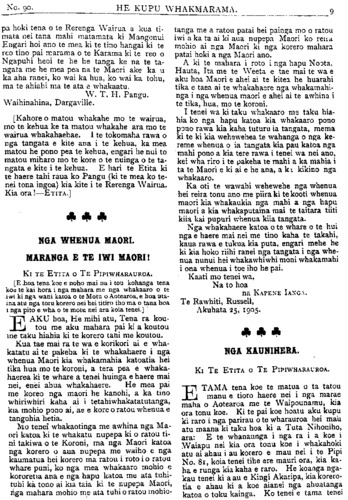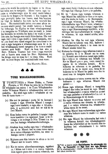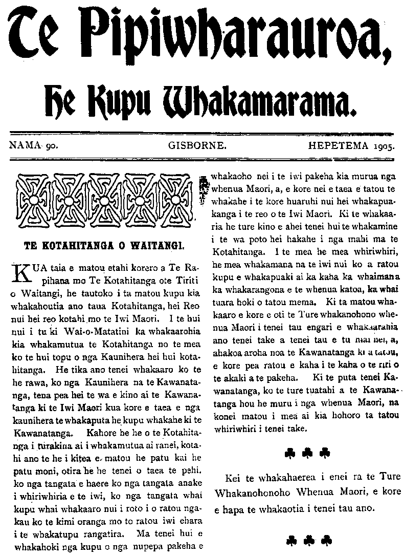 Te Pipiwharauroa, Ke Kupu WHAKAMARAMA NAMA 90. GISBORNE. HEPETEMA 1905. TE KOTAHITANGA O WAITANGI. KUA taia e matou etahi korero a Te Ra- pihana mo Te Kotahitanga ote Tiriti o Waitangi, he tautoko i ta matou kupu kia whakahoutia ano taua Kotahitanga, hei Reo nui hei reo kotahi mo te Iwi Maori. I te hui nui i tu ki Waiomatatini ka whakaarohia kia whakamutua te Kotahitanga no te mea ko te hui topu o nga Kaunihera hei hui kota- hitanga. He tika ano tenei whakaaro ko te he rawa, ko nga Kaunihera na te Kawanata- nga, tena pea hei te wa e kino ai te Kawana- tanga ki te Iwi Maori kua kore e taea e nga kaunihera te whakaputa he kupu whakahe ki te Kawanatanga. Kahore he he o te Kotahita- nga i turakina ai i whakamutua ai ranei, kota- hi ano te he i kitea e matou he patu kai he patu moni, otira he he tenei o taea te pehi. ko nga tangata e haere ko nga tangata anake i whiriwhiria e te iwi, ko nga tangata whai kupu whai whakaaro nui i roto i o ratou nga- kau ko te kimi oranga mo to ratou iwi ehara i te whakatupu rangatira. Ma tenei hui e whakahoki nga kupu o nga nupepa pakeha e a whakaoho nei i te iwi pakeha kia murua nga whenua Maori, a, e kore nei e taea e tatou te 1 whakahe i te kore huarahi nui hei whakapua- kanga i te reo o te Iwi Maori. Ki te whakaa- ria he ture kino e ahei tenei hui te whakamine i te wa poto hei hakahe i nga mahi ma te Kotahitanga. I te mea he mea whiriwhiri, he mea whakamana na te iwi nui ko a ratou kupu e whakapuaki ai ka kaha ka whaimana a ka whakarangona e te whenua katoa, ka whai tuara hoki o tatou mema. Ki ta matou wha- kaaro e kore e oti te Ture whakanohono whe- nua Maori i tenei tau engari e whakaarahia ano tenei take a tenei tau e tu mai nei, a, ahakoa aroha noa te Kawanatanga ki a tatou, e kore pea ratou e kaha i te kaha o te riri o te akaki a te pakeha. Ki te puta tenei Ka- wanatanga, ko te ture tuatahi a te Kawana- tanga hou he muru i nga whenua Maori, na konei matou i mea ai kia hohoro ta tatou whiriwhiri i tenei take. Kei te whakahaerea i enei ra te Ture Whakanohonoho Whenua Maori, e kore e hapa te whakaotia i tenei tau ano.