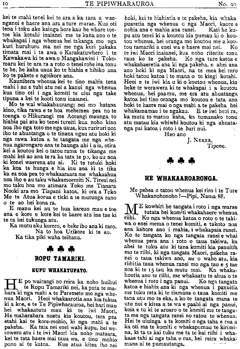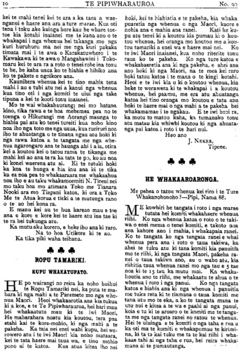 TE PIPIWHARAUROA kei te mahi tenei kei te ara a ka. taea a wae- nganui e haere ana ara a ture marae. Kua oti tena i toku ake kainga hore kau he whare toe- toe kia kotahi inaianei me te kaha ano o te whakapai i nga whenua hei takanga mo nga kuri huruhuru ma nei me nga kuri pakaka timata mai i te awa o Karakatuwhero i te Kawakawa ki te awa o Mangahawini i Toko- maru kei te ara ra a roto o tenei rohe ina tonu te he, he kaha uaua ko te hiahia e hihiko ana ko te pakete e ngoikore ana. Kaunihera whenua kei te tino mahia tena mahi i au e tuhi atu nei a kanui nga whenua kua tino oti i nga komiti te uiui nga take tipuna a kei te kooti tonu inaianei. Mo te wai whakahaurangi nei mo hatana kino, tika rawa e te hoa mehemea pea no te toenga o Hikurangi me Aorangi maunga to hiahia pai atu ko tenei tureiti kua noho kino noa iho nga toto me nga uaua,kua ruriruri noa iho te ahuatanga o te tinana ngau atu hoki ki nga rawa katoa a te tangata me nga whe- nua ngarongaro ana te haunga ahi i a ia, otira kei a koutou kei o tatou rama te tikanga me mahi kei ao ana te ra ka tata te po, ko au noa ki konei waerena atu ai. Ki te tutuki hoki ka koa te hunga e hia inu ana ki te tika ka ea noa pea to whakaaraara me whakaahua noa iho e au taku whakamoemiti N. Tireni nei mo taku hoa mo atimara Toko me Tianara Nooki ara mo Tiapani katoa, ki ora a Toko Me te Atua korua e tieki a te mutunga rano o te ao hei kona ra. E manu kei au te hua kareao mau e toe ana e kore e kore kei te haere atu ina tae ki te ra hei tukunga atu. Ka mutu aku korero, e heke iho ana ki raro. Na to hoa Urikore ki te ao. Ka tika piki waha teihana. ROPU TAMARIKI. KUPU WHAKATUPATO. HE po wairangi no reira ka noho huihui te Ropu Tamariki nei, ka puia te ma- hara ki nga mahi a te Paremete mo nga whe- nua Maori. Heoi whakaarotia ana kia tukua ki a koe, e te Te Pipiwharauroa, hei hari mau hei whakaatutu mau ki te iwi Maori. He maharahara noatu kia koutou, tera pea etahi kai te kore mohio, ki nga mahi a te pakeha. Ka taia nei enei wahi kupu, hei we- rowero atu i te iwi Maori kia noho mataara, kei te tata haere mai taua wa, e tino mohio pono ai te katoa. Kua atua kitea iho nei hoki, kei te hiahiatia e te pakeha, kia whaka puaretia nga whenua o nga Maori, kaore e nohia ana e mahia ana ranei. Kati he ku- pu atu tenei ki a koutou kia pumau ki o kou- tou whenua, hei oranga mo koutou me a kou- tou tamariki a enei wa e haere mai nei. Ko te iwi Maori inaianei, kua noho riterite tonu raua ko te pakeha. Ko nga ture katoa e whakahaeretia ana ki nga pakeha, e ahei ana ano hoki ki nga Maori, na te mea kei raro hoki tatou katoa i te mana o te kingi kotahi. Heoi e te iwi kia u ki o koutou whenua, kia heke te werawera ki te whakapai i a koutou whenua, hei paamu, me era atu ahuatanga katoa hei tino oranga mo koutou e tata ana hoki te haere mai o nga mahi a te pakeha hei whakamamae i te ngakau. E te iwi heoi ra, ka mutu to matou kaha, ka tumanako tonu atu matau kia whiwhi koutou ki nga ahuata- nga pai katoa i roto i te hari nui. Heo ano J. NEKER, Tipene. HE WHAKAAROARONGA. Me pehea o tatou whenua kei riro i te Ture Whakanohonoho ?—Pipi, Nama 88. ME kowhiri he tangata i roto i nga marae tutata hei komiti whakahaere whenua nihi. Ko nga whenua katoa o roto o te taki- wa o enei mema o tenei komiti, e takoto noa ana kahore ano i mahia, i whakapaia ranei. Ko te tangata ko nga tangata ranei e whai whenua pera ana i roto o taua takiwa, ka ahei te tuku atu ki tana komiti kia panuitia mo te nihi, ki nga tangata Maori, pakeha ra- nei o taua takiwa ano, au o waho ata, kia riihitia taua whenua ranei mo nga tau e 5 tae noa ki te 15 tau ka mutu mai. Ka whaka- houtia ano te nihi, me whakaatu te ahua o te whenua i roto i nga panui. Ko nga tangata katoa e hiahia ana ki nga whenua i panuitia me tuku reta ki te tiamana o taua komiti me tana utu mo te eka, a ko te tangata mana te utu nui e kitea a te wa e paahi ai nga panui, koia e tu ki te aroaro o te komiti me te tanga- ta me nga tangata ranei no ratou te whenua. Hei te muinga e te komiti o nga taha e rua a ka oti ma te komiti e whakapumau te kirimi- na, ki ta te kai tuku me ta te kai nihi i wha- kaae tahi ai nga taha e rua, hei reira whaka- mana ai te pumautanga.