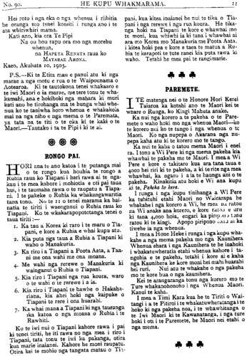 HE KUPU WHAKAMARAMA. Hei roto i nga eka o nga whenua i riihitia he oranga mo tenei komiti i runga ano i te ata whiriwhiri mama. Kati ano, kia ora Te Pipi Na ou hou rapu ora mo nga morehu whenua, na HAPETA RENATA raua ko MATARAE ARONA. Kaeo, Akuhata 10, 1905. P.S.—Ki te Etita mau e panui atu ki nga marae a nga motu e rua o te Waipounamu o Aotearoa. Ki te tautokona tenei whakaaro e te iwi Maori o ia marae, me tere tonu te wha- kamahi, ana e hokihoki nga mahara ki muri kati ano he tirohanga ma te hunga whai whe- nua ko te taniwha horo whenua e whakakoia mai na nga niho e nga mema o te Paremata, ya tata na te titi o te oka ki te kaki o te Maori.—Tautako i ta te Pipi i ki te ai. RONGO PAI. HORI ana te ano katoa i te putanga mai o te rongo kua houhia te rongo a Ruhia raua ko Tiapani i hari rawa ai te nga- kau i te mea kahore i mohiotia e oti pai taua hui, i te taumaha rawa o te raupatu a Tiapa- ni. I te pakeke o Ruhia ka whakangawaritia1 tana tono. No te 11 o tenei marama ka hai- natia te tiriti i waenganui o Ruhia raua ko Tiapani. Ko te wkakarapopototanga tenei o taua tiriti:— 1. Ka tau a Korea ki raro i te maru o Tia- pani, e kore a Ruhia e whai kupu atu. 2. Kia puta nga taua a Ruhia a Tiapani ki waho o Manakuria. 3. Ka riro i a Tiapani a Poota Aata, a Taani me ona wahi me ona moana. 4. Me wahi nga rerewe o Manakuria ki wainganui o Ruhia o Tiapani. 5. Kia riro i Tiapani nga rua koura, waro o te wahi o te rerewe i a ia. 6. Kia riro i Tiapani te hawhe o Hakaha- riana, kia ahei hoki nga kaipuke o Tiapani te rere i ona huarahi. 7. Ka whai mana a Tiapani ki nga tauranga ka katoa o nga moana o Ruhia i te Rawhiti. Ko te iwi nui o Tiapani kahore rawa i pai ki tenei tiriti, he iti rawa no nga mea i riro i Tiapani, tata tonu te iwi ka pakanga, otira kua marie inaianei. Kahore he moni raupatu. Otira kei te mohio nga tangata matau o Tia- pani, kua kitea inaianei he nui te tika o Tia- pani i nga rerewe i nga rua koura. He tika- nga hoki na Tiapani te kore e whawhai mo te moni, kua whiwhi ia ki tana i whawhai ai ara mo Korea mo Manakuria me Poota Aata, i kitea hoki pea e kore e taea te matua a Ru- hia te karapoti te tute ranei kia puta rawa ki waho. Tetahi he mea pai te rangimarie. PAREMETE. ITE matenga nei o te Honore Hori Kerei Taiaroa ka kotahi ano te Maori kei te whare o Runga, ko Kingi Mahuta anake. Ka nui nga korero a te pakeha o te Pare- mete o waho hoki mo nga whenua Maori—ko te korero nui ko te tango i nga whenua o te Maori. Ko nga nupepa o Akarana nga nu- pepa kaha atu ki te korero mo te tango. Ka nui te kaha o tatou mema Maori i enei ra. I tono a Wi Pere ki nga mema pakeha kia whawhai te pakeha me te Maori. I mea a Wi Pere e kore e takitaro kua ara tana taua e 4000 hei riri ki te pakeha, a ki te rite nga mea whawhai, ka ngaro i a ia te haunga ahi o te pakeha. Kinakitia atu hoki e Wi ana kupu ki te, Pakeha ko hera. 1 runga i nga kupu tinihanga a Wi Pere ka tuhituhi etahi Maori no Wairarapa he whakahei nga korero a Wi, he mea na ratou na Wi anake ana korero, e kore ratou e uru ki tana 4,000 hoia, engari ka piripono tonu ratou ki te kingi. Apopo piripono tonu ai ka tiwehe ia nga whenua. I mea a Hone Heke i runga i nga kupu wha- kahe a nga mema pakeha mo nga Kaunihera Whenua ehara i nga Kaunihera te he inahoki i whakatuwheratia etahi whenua kahore i ta- ngohia e te pakeha, tetahi i kore ai e kaha nga Kaunihera ke kore moni hei mahi huarahi hei ruri. Nui atu te whakahe o nga pakeha mo te kore hua o nga kaunihera. Kei te arangaranga tonu nga korero mo te Ture whakanohonoho i nga Whenua Maori. Kanui te kaha. I mea a Timi Kara kua he te Tiriti o Wai- tangi i a te Pitiroi i te whakatuwheratanga i te hoko ki nga pakeha noa, i te whawhitanga o te Iwi Maori ki te Kawanatanga, i nga ture hoki i oti i te Paremete, he Maori nei etahi o nga mema.