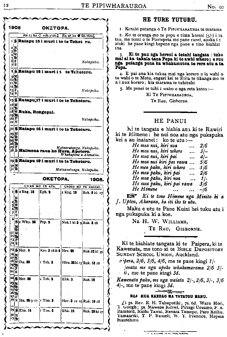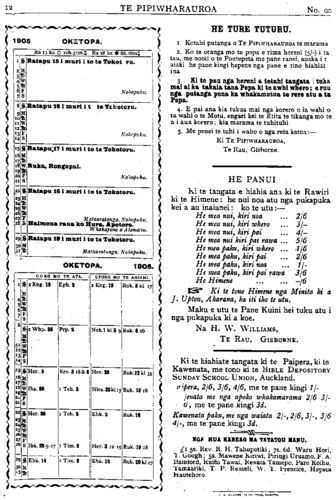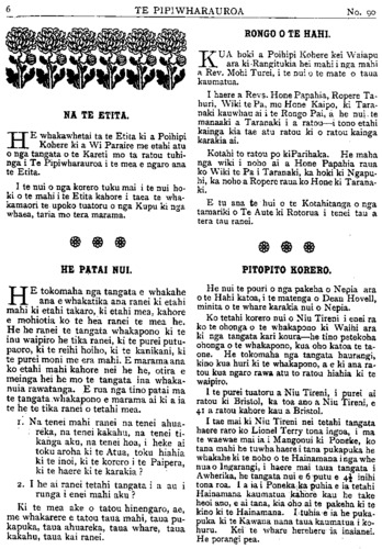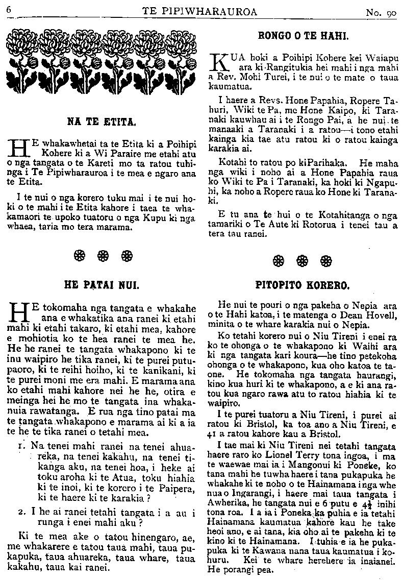 TE PIPIWHARAUROA NA TE ETITA. HE whakawhetai ta te Etita ki a Poihipi Kohere ki a Wi Paraire me etahi atu o nga tangata o te Kareti mo ta ratou tuhi- nga i Te Pipiwharauroa i te mea e ngaro ana te Etita. I te nui o nga korero tuku mai i te nui ho- ki o te mahi i te Etita kahore i taea te wha- kamaori te upoko tuatoru o nga Kupu ki nga whaea, taria mo tera marama. HE PATAI NUI. HE tokomaha nga tangata e whakahe ana e whakatika ana ranei ki. etahi mahi ki etahi takaro, ki etahi mea, kahore e mohiotia ko te hea ranei te mea he. He he ranei te tangata whakapono ki te inu waipiro he tika ranei, ki te purei putu- paoro, ki te reihi hoiho, ki te kanikani, ki te purei moni me era mahi. E marama ana ko etahi mahi kahore nei he he, otira e meinga hei he mo te tangata ina whaka- nuia rawatanga. E rua nga tino patai ma te tangata whakapono e marama ai ki a ia te he te tika ranei o tetahi mea. 1. Na tenei mahi ranei na tenei ahua- reka, na tenei kakahu, na tenei ti- kanga aku, na tenei hoa, i heke ai toku aroha ki te Atua, toku hiahia ki te inoi, ki te korero i te Paipera, ki te haere ki te karakia ? 2. I he ai ranei tetahi tangata i a au i runga i enei mahi aku ? Ki te mea ake o tatou hinengaro, ae, me whakarere e tatou taua mahi, taua pu- kapuka, taua ahuareka, taua whare, taua kakahu, taua kai ranei. RONGO O TE HAHI. KUA hoki a Poihipi Kohere kei Waiapu ara ki hei mahi i nga mahi a Rev. Mohi Turei, i te nui o te mate o taua kaumatua. I haere a Revs. Hone Papahia, Ropere Ta- huri, Wiki te Pa, me Hone Kaipo, ki Tara- naki kauwhau ai i te Rongo Pai, a he nui te manaaki a Taranaki i a ratou—i tono etahi kainga kia tae atu ratou ki o ratou kainga karakia ai. Kotahi to ratou po ki He maha nga wiki i noho ai a Hone Papania raua ko Wiki te Pa i Taranaki, ka hoki ki Ngapu- hi, ka noho a Ropere raua ko Hone ki Tarana- ki. E tu ana te hui o te Kotahitanga o nga tamariki o Te Aute ki Rotorua i tenei tau a tera tau ranei. PITOPITO KORERO. He nui te pouri o nga pakeha o Nepia ara o te Hahi katoa, i te matenga o Dean Hovell, minita o te whare karakia nui o Nepia. Ko tetahi korero nui o Niu Tireni i enei ra ko te ohonga o te whakapono ki Waihi ara ki nga tangata kari koura—he tino petekoha ohonga o te whakapono, kua oho katoa te ta- one. He tokomaha nga tangata haurangi, kino kua huri ki te whakapono, a e ki ana ra- tou kua ngaro rawa atu to ratou hiahia ki te waipiro. I te purei tuatoru a Niu Tireni, i purei ai ratou ki Bristol, ka toa ano a Niu Tireni, e 41 a ratou kahore kau a Bristol. I tae mai ki Niu Tireni nei tetahi tangata haere raro ko Lionel Terry tona ingoa, i ma te waewae mai ia i Mangonui ki Poneke, ko tana mahi he tuwha haere i tana pukapuka he whakahe ki te noho o te Hainamana i nga whe nua o Ingarangi, i haere mai taua tangata i Awherika, he tangata nui e 6 putu e 4 1/2 inihi tona roa. I a ia i Poneka puhia e ia tetahi Hainamana kaumatua kahore kau he take heoi ano, e ai tana, kia oho ai te pakeha ki te kino ki te Hainamana. I. tuhia ia he puka- puka ki te Kawana nana taua kaumatua i ko- huru. Kei te whare herehere ia inaianei. He porangi pea.