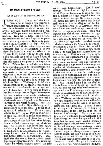 TE PIPIWHARAUROA TE KOTAHITANGA MAORI. Ki TE ETITA O TE PIPIWHARAUROA. TENA KOE. Utaina atu aku kupu ruarua nei ki runga i nga parirau o te Pipi, mana e hari atu ki nga wahi ka- toa o te motu nei e tae atu ai, ki oku hoa aroha i nga wahi katoa o nga motu e rua nei; o te Waipounamu me Aotearoa Tena koutou. Kati ko te take i tono ai taku ngakau kia tuhi au i enei kupu na te pono me te kite o nga kanohi. Kati ko te pono ko te kupu a te Etita i Te Pipi, No. 88, penei te kupu, i ki ake nei au he pono me whakaara ano te Kotahitanga o te iwi Maori hei huarahi e whakapuakina ai te reo nui, te reo kotahi o te iwi Maori. Kati e aku hoa koia tonu nei te kupu i tono ai toku ngakau kia tuhi i tenei reta, ara, he kite iho naku i te pono o te kupu te Etita. Kahore ke atu he kaha mo tatou ki te whawhai atu ki te kawanatanga mo nga take e hiahiatia ana e te iwi Maori o nga motu e- rua nei i runga i te huarahi whawhai a ture atu ki te kawanatanga. Kati me tohu ake e au te pono o tenei ta- ke—tuatahi i te tau 1891 ka tu te hui tua- tahi ki te Tiriti o Waitangi ko te take kia whakakotahitia te iwi Maori o nga motu e rua nei kati whakaaetia ana e nga iwi i poto ki taua hui. I reira tonu ka tonoa e nga iwi o runga ara e Ngati-Kahungunu kia riro i a ratou te hui mo te whakakota- hitanga i nga iwi o nga motu e rua nei a whakaaetia ana e Ngapuhi e te Rarawa, e te.Aupouri me Ngatiwhatua. Kati i te tau 1892 ka riro i a Ngati-Kahungunu ki Heretaunga ka mutu tena. I te tau 1893, ka tu ano ki reira te hui. Ka mutu tena katahi ka riro i a Wi Pere ki Pakirikiri i te tau 1894 katahi ka tu ko au te mema o te Rarawa i tae mai ki taua hui. Hoi i taku taenga ki taua hui kua ahua hianga haere te whakahaere a nga kai whakaha- ere. Ko te take ko nga moni kua ngaro etahi erangi ko nga iwi i tino kaha ki te ki kia kaha ki te whakahaere i te Kotahi- tanga kia oti. Kati i tena tau kua kite au kua ngaue katoa te kawanatanga. Wai- hoki kua kite ano au kua ra rototia tetahi tikanga a te kawanatanga i nga rangatira Maori hei whakararuraru haere i taua take kei oti taua Kotahitanga. Kati i muri hitanga. Kaati i te tau 1898 ka tu ano te hui ki Papawai tae atu au ki taua hui kua kite a tinana au i nga rangatira kua riro katoa i te kawanatanga. Kote mere i o ra- tou ringa hei. patu i o ratou hoa Maori mai i tena hui i te tau 1895 ka riro te hui mo te Kotahitanga i a Te Arawa ki Roto- rua a. ko au ano tetahi o nga mema i reira. Kati he nui nga rarurarutanga i taua tau engari i tino nui ai nga raruraru no nga kai whakahaere tonu o te Kotahitanga ki- hai i poto mai ki taua hui no reira kihai i tino takoto pai nga mahi o taua hui, erangi i whakaae katoa a Te Arawa ki te whaka- kotahitanga o nga iwi Maori hei hapai i te reo kotahi o nga iwi Maori o nga motu e rua a i te uaua kua tino ngaue rawa te kawanatanga. Kati ka mau tonu te raru- raru o nga kai whakahaere o te Kotahita- nga mo nga moni i ngaro. I motinitia e au i reira kia tukua mai nga pukapuka whakapaunga o nga moni i kohia enga ra- ngatira hei whakahaere i nga mahi o te Kotahitanga, a kihai i takoto mai i runga i taku motini ko te take ko etahi o nga minita ko te mutunga atu ano i te hui ki Pakirikiri no reira ngaro tonu atu te wha- kapaunga o nga moni tae noa mai ki tenei ra. Kati i muri i tena i te tau 1896 ka riro te hui o te Kotahitanga ki Taupo no tera hui kua rua nga take whakararuraru i nga mahi a te Kotahitanga ara ma- hi a te kawanatanga me te mana rangatira- tanga Maori. Ko taua take i tipu ake i roto o Waikato i ra rototia mai i roto e eta- hi o nga rangitira whakahaere o te Kotahi- tanga no reira kaore he take a te Kotahi- tanga i oti pai i taua hui. I muri i tena ka karangatia ki Wairarapa te hui a te Kotahitanga i te tau 1897 ka tu te hui ki Papawai i Wairarapa. Te tunga ki reira kahore ano i poto nga kai whakahaere o te Kotahitanga no reira ko nga take i oti i taua hui he mea mahi noaiho i runga i etahi tikanga i whakahaerea e matau i rei- ra, he nui ano nga rarurarutanga i reira me taku mohio kua ra rototia mai ano e te kawanatanga he tikanga mana i nga ra- ngatira Maori hei take e hinga ai te Kota- hitanga o te iwi Maori. Kati i tenei ra kua tahuri mai te kawanatanga ki te wha- katautau i tetahi tikanga e hiahiatia atu ai e etahi o nga rangatira o roto i te Kota-