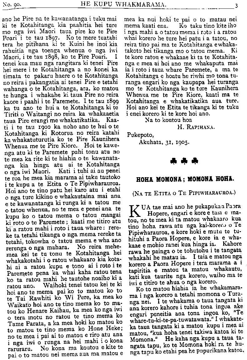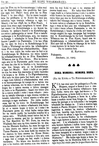 HE KUPU WHAKAMARAMA ano he Pire na te kawanatanga i tuku mai ki te Kotahitanga kia paahitia hei ture mo nga iwi Maori taua pire ko te Pire Poari i te tau 1897. Ko te mere tuatahi tera he pitihana ki te Kuini he inoi kia rahuitia nga toenga whenua o nga iwi Maori, i te tau 1898, ko te Pire Poari. I tenei kua mau nga rangitara ki tenei Pire hei mere i te Kotahitanga a no konei ka timata te pakaru haere o te Kotahitanga no reira i pakangatia ai tenei Pire e tetahi wahanga o te Kotahitanga, ara, ko matou te hunga i whakahe ki taua Pire no reira kaore i paahi i te Paremete. I te tau 1899 ka tu ano te hui a te Kotahitanga ki te Tiriti o Waitangi no reira ka whakaaetia taua Pire erangi me whakatikatika. Kaa- ti i te tau 1900 ka noho ano te hui o te Kotahitanga ki Rotorua no reira katahi ka whakatuturutia ko te Pire Kaunihera Whenua me te Pire Kiore. Hoi te kawe- nga atu ki te Paremete pahi tonu atu no te mea ka rite ki te hiahia o te kawanata- nga kia hinga atu ai te Kotahitanga o nga iwi Maori. Kati i tuhi ai au pene te roa he mea kia marama ai taku tautoko i te kupu a te Etita o Te Pipiwharauroa Hoi ano te tino patu hei karo atu i etahi o nga ture kikino e whakautaina mai ana e te kawanatanga ki runga ki a tatou me o tatou whenua, no te mea e penei ana te kupu ko o tatou mema o tatou manga ki roto o te Paremete; kaati me titiro ati ki a ratou mahi i roto i taua whare: rere ke ta tetahi tikanga o nga mema rereke ta tetahi, tokowha o tatou mema e wha ano rerenga o nga mahara. No reira mehe mea kei te tu tonu te Kotahitanga he whakakotahi i o ratou whakaaro kia kota hi ai a ratou kupu e tono ai i roto i te Paremete pena ka whai kaha ratou tena ko ta ratou mahi he tautohe noaiho ki a ratou ano. Waihoki tenei tatou kei te ki hoi ano te mema pai ko to matou ko to te Tai Rawhiti ko Wi Pere, ka mea Waikato hoi ano te tino mema ko to ma tou ko Henare Kaihau, ka mea ko nga iwi o tera motu no ratou te tino mema ko Tame Parata, a ka mea hoki ko matou ko to matou te tino mema ko Hone Heke no te mea i pai ai to matou e riro atu ana i nga iwi o runga na hei mahi i o kona raruraru. No kona ma koutou e kite te pai o to matou nei mema aua ma matou e ————————————————————-———————————————————\_\_\_\_\_\_\_\_\_\_\_\_\_\_\_\_\_\_\_\_\_\_\_\_\_\_\_\_\_\_\_\_ mea ka nui hoki te pai o to matau nei mema kaati ena. Ko taku tino kite iho i nga mahi a o tatou mema i roto i a ratou whai korero he ture hei patu i a tatou, no reira tino pai ma te Kotahitanga e whaka- takoto hei tikanga mo o tatou mema. Ki te kore ratou e whakaae ki ta te Kotahita- nga e mea ai hoi ano me whakaputa mai ia i roto i taua whare Paremete, a ma te Kotahitanga e hoatu he riwhi mo tona tu- ranga engari ko nga kaupapa hei turanga mo te Kotahitanga ko te ture Kaunihera Whenua me te Pire Kiore, kaati ma te Kotahitanga e whakatikatika aua ture. Hoi ano kei te Etita te tikanga ki te tuku i enei korero ki te kore hoi ano. Na to koutou hoa H. RAPIHANA. Pukepoto, Akuhata, 31, 1905. HOHA MOMONA; MOMONI HOHA. (NA TE ETITA O TE PIPIWHARAUROA.) KUA tae mai ano he pukapuka a Paora Hopere, engari e kore e taia e ma- tou, no te mea ki ta matou whakaaro kua tino hoha rawa atu nga kaikorero o Te Pipiwharauroa, e kore hoki e mutu te tu- hituhi a Paora Hopere, e kore ia e wha- kaae e mohio ranei kua hinga ia. Kahore rawa he painga o te tohutohu i te tangata whakahi he matau ia. I taia e matou nga korero a Paora Hopere i tera marama a i tapiritia e matou ta matou whakautu, kati kua taurite nga korero, waiho ma te iwi e titiro te ahua o nga korero. Ko to matou hiahia ia he whakamara- ma i nga korero a tetahi momona o Tura- nga nei. I te whakama o taua tangata ki ana korero kahore i tuhia tona ingoa ake engari peneitia ana tona ingoa ko, "Te whare-tu-ki-te-pa•tuwatawata.'< I whakate ka taua tangata ki a matou kupu i mea ai matou, "kua hoha tenei takiwa katoa ki te Momona." He kaha nga kupu a taua ta- ngata tapu, ko te Momona hoki ra te hu- nga tapu ko etahi pea he pupurikana katoa,