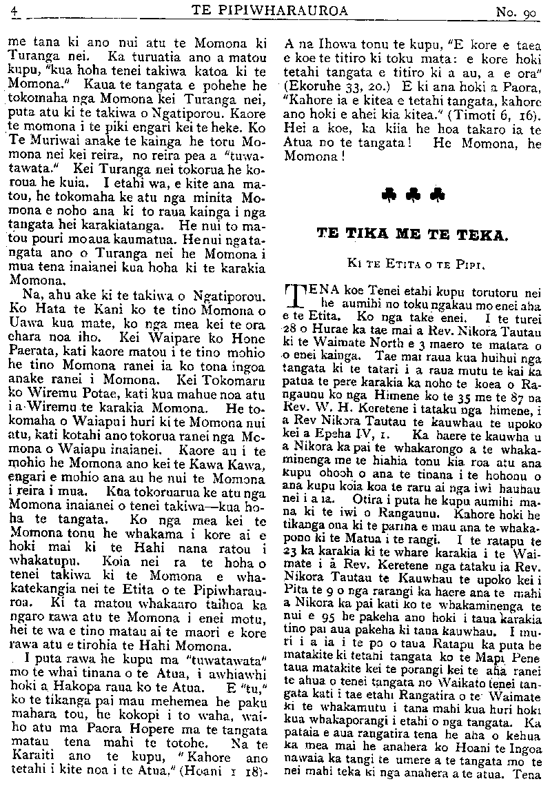 TE PIPIWHARAUROA me tana ki ano nui atu te Momona ki Turanga nei. Ka turuatia ano a matou kupu, "kua hoha tenei takiwa katoa ki te Momona." Kaua te tangata e pohehe he tokomaha nga Momona kei Turanga nei, puta atu ki te takiwa o Ngatiporou. Kaore te momona i te piki engari kei te heke. Ko Te Muriwai anake te kainga he toru Mo- mona nei kei reira, no reira pea a "tuwa- tawata." Kei Turanga nei tokorua he ko- roua he kuia. I etahi wa, e kite ana ma- tou, he tokomaha ke atu nga minita Mo- mona e noho ana ki to raua kainga i nga tangata hei karakiatanga. He nui to ma- tou pouri mo kaumatua. Henui ngata ngata ano o Turanga nei he Momona i mua tena inaianei kua hoha ki te karakia Momona. Na, ahu ake ki te takiwa o Ngatiporou. Ko Hata te Kani ko te tino Momona o Uawa kua mate, ko nga mea kei te ora ehara noa iho. Kei Waipare ko Hone Paerata, kati kaore matou i te tino mohio he tino Momona ranei ia ko tona ingoa anake ranei i Momona. Kei Tokomaru ko Wiremu Potae, kati kua mahue noa atu i i a Wiremu te karakia Momona. He to- komaha o Waiapui huri ki te Momona nui atu, kati kotahi ano tokorua ranei nga Mo- mona o Waiapu inaianei. Kaore au i te mohio he Momona ano kei te Kawa Kawa, engari e mohio ana au he nui te Momona i reira i mua. Kua tokoruarua ke atu nga Momona inaianei o tenei takiwa—kua ho- ha te tangata. Ko nga mea kei te Momona tonu he whakama i kore ai e hoki mai ki te Hahi nana ratou i whakatupu. Koia nei ra te hoha o tenei takiwa ki te Momona e wha- katekangia nei te Etita o te Pipiwharau- roa. Ki ta matou whakaaro taihoa ka ngaro rawa atu te Momona i enei motu, hei te wa e tino matau ai te maori e kore rawa atu e tirohia te Hahi Momona. I puta rawa he kupu ma "tuwatawata" mo te whai tinana o te Atua, i awhiawhi hoki a Hakopa raua ko te Atua. E "tu," ko te tikanga pai mau mehemea he paku mahara tou, he kokopi i to waha, wai- ho atu ma Paora Hopere ma te tangata matau tena mahi te totohe. Na te Karaiti ano te kupu, " Kahore ano tetahi i kite noa i te Atua," (Hoani 1 18)- A na Ihowa tonu te kupu, "E kore e taea e koe te titiro ki toku mata: e kore hoki tetahi tangata e titiro ki a au, a e ora" (Ekoruhe 33,20.) E ki ana hoki a Paora, "Kahore ia e kitea e tetahi tangata, kahore ano hoki e ahei kia kitea." (Timoti 6, 16). Hei a koe, ka kiia he hoa takaro ia te Atua no te tangata! He Momona, he Momona! TE TIKA ME TE TEKA. Ki TE ETITA O TE PIPI. TENA koe Tenei etahi kupu torutoru nei he aumihi no toku ngakau mo enei aha e te Etita. Ko nga take enei. I te turei 28 o Hurae ka tae mai a Rev. Nikora Tautau ki te Waimate North e 3 maero te matara o o enei kainga. Tae mai raua kua huihui nga tangata ki te tatari i a raua mutu te kai ka patua te pere karakia ka noho te koea o Rangaunu ko nga Himene ko te 35 me te 87 na Rev. W. H. Keretene i tataku nga himene, i a Rev Nikora Tautau te kauwhau te upoko kei a Epeha IV, haere te kauwhau a Nikora ka pai te whakarongo a te whaka- minenga me te hiahia tonu kia roa atu ana kupu ohooho o ana te tinana i te hohonu o ana kupu koia koa te raru ai nga iwi hauhau nei i a iwi. Otira i puta he kupu aumihi ma- na ki te iwi o Rangaunu. Kahore hoki he tikanga ona ki te pariha e mau ana te whaka- pono ki te Matua i te rangi. I te ratapu te 23 ka karakia ki te whare karakia i te Wai- mate i a Rev. Keretene nga tataku ia Rev. Nikora Tautau te Kauwhau te upoko kei i Pita te 9 o nga rarangi ka haere ana te mahi a Nikora ka pai kati ko te whakaminenga te nui e 95 he pakeha ano hoki i taua karakia tino pai aua pakeha ki tana kauwhau. I mu- ri i a ia i te po o taua Ratapu ka puta he matakite ki tetahi tangata ko te Mapi Pene taua matakite kei te porangi kei te aha ranei te ahua o tenei tangata no Waikato tenei tan- gata kati i tae etahi Rangatira o te Waimate ki te whakamutu i tana mahi kua huri hoki kua whakaporangi i etahi o nga tangata. Ka pataia e aua rangatira tena he aha o kehua ka mea mai he anahera ko Hoani te Ingoa nawaia ka tangi te umere a te tangata mo te nei mahi teka ki nga anahera a te atua. Tena