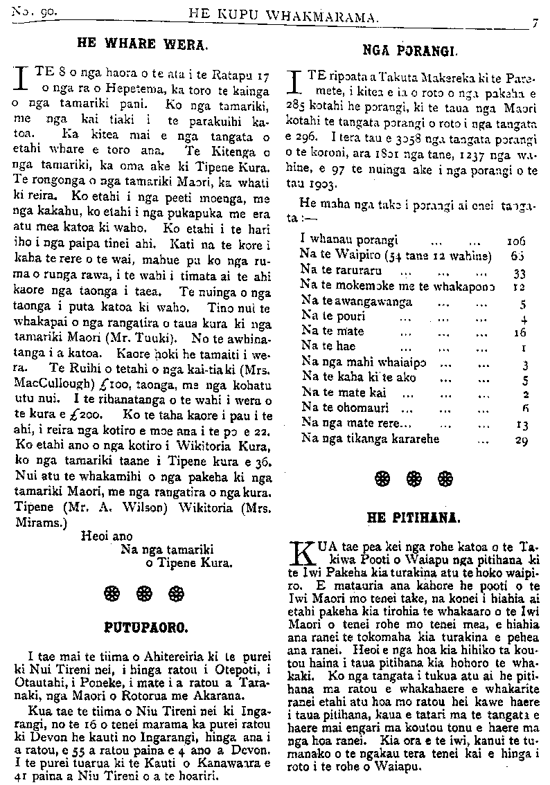 HE KUPU WHAKAMARAMA. HE WHARE WERA. ITE 8 o nga haora o te ata i te Ratapu 17 o nga ra o Hepetema, ka toro te kainga o nga tamariki pani. Ko nga tamariki, me nga kai tiaki i te parakuihi ka- toa. Ka kitea mai e nga tangata o etahi whare e toro ana. Te Kitenga o nga tamariki, ka oma ake ki Tipene Kura, Te rongonga o nga tamariki Maori, ka whati ki reira. Ko etahi i nga peeti moenga, me nga kakahu, ko etahi i nga pukapuka me era atu mea katoa ki waho. Ko etahi i te hari iho i nga paipa tinei ahi. Kati na te kore i kaha te rere o te wai, mahue pa ko nga ru ma o runga rawa, i te wahi i timata ai te ahi kaore nga taonga i taea. Te nuinga o nga taonga i puta katoa ki waho. Tino nui te whakapai o nga rangatira o taua kura ki nga tamariki Maori (Mr. Tuuki). No te awhina tanga i a katoa. Kaore hoki he tamaiti i we ra. Te Ruihi o tetahi o nga kaitiaki (Mrs. MacCullough) £100, taonga, me nga kohatu utu nui. I te rihanatanga o te wahi i wera o te kura e £200. Ko te taha kaore i pau i te ahi, i reira nga kotiro e moe ana i te po e 22 Ko etahi ano o nga kotiro i Wikitoria Kura ko nga tamariki taane i Tipene kura e 36 Nui atu te whakamihi o nga pakeha ki nga tamariki Maori, me nga rangatira o nga kura Tipene (Mr. A. Wilson) Wikitoria (Mrs Mirams.) Heoi ano Na nga tamariki o Tipene Kura. PUTUPAORO. I tae mai te tuma o Ahitereiria ki te purei ki Nui Tireni nei, i hinga ratou i Otepoti, Otautahi, i Poneke, i mate i a ratou a Tara naki, nga Maori o Rotorua me Akarana. Kua tae te tuma o Niu Tireni nei ki Inga rangi, no te 160 tenei marama ka purei ratou ki Devon he kauti no Ingarangi, hinga ana a ratou, e 55 a ratou paina e 4 ano a Devon. I te purei tuarua ki te Kauti o Kanawaara e 41 paina a Niu Tireni o a te hoariri. NGA PORANGI. ITE ripoata a Takuta Makereka ki te Pare- mete, i kitea e ia o roto o nga pakeha e 285 kotahi he porangi, ki te taua nga Maori kotahi te tangata porangi o roto i nga tangata e 296. I tera tau e 3058 nga tangata porangi o te koroni, ara 1801 nga tane, 1237 nga wa- hine, e 97 te nuinga ake i nga porangi o te tau 1903- He maha nga take i porangi ai enei tanga- ra :— I whanau porangi ... ... 106 Na te Waipiro (54 tane 12 wahine) 65 Na te raruraru ... ... ... 33 Na te mokemoke me te whakapono 12 Na te awangawanga ... ... 5 Na te pouri ... . ... ... 4 Na te mate ... ... ... 16 Na te hae ... ... ... 1 Na nga mahi whaiaipo ... ... 3 Na te kaha kite ako ... ... 5 Na te mate kai ... ... ... 2 Na te ohomauri ... ... ... 6 Na nga mate rere... ... ... 13 Na nga tikanga kararehe ... 29 HE PITIHANA. KUA tae pea kei nga rohe katoa o te Ta- kiwa Pooti o Waiapu nga pitihana ki te Iwi Pakeha kia turakina atu te hoko waipiro ro. E matauria ana kahore he pooti o te Iwi Maori mo tenei take, na konei i hiahia a etahi pakeha kia tirohia te whakaaro o te Iwi Maori o tenei rohe mo tenei mea, e hiahia ana ranei te tokomaha kia turakina e pehea ana ranei. Heoi e nga hoa kia hihiko ta kou tou haina i taua pitihana kia hohoro te wha kaki. Ko nga tangata i tukua atu ai he piti hana ma ratou e whakahaere e whakarite ranei etahi atu hoa mo ratou hei kawe haere i taua pitihana, kaua e tatari ma te tangata e haere mai engari ma koutou tonu e haere ma; nga hoa ranei. Kia ora e te iwi, kanui te tu manako o te ngakau tera tenei kai e hinga e roto i te rohe o Waiapu.