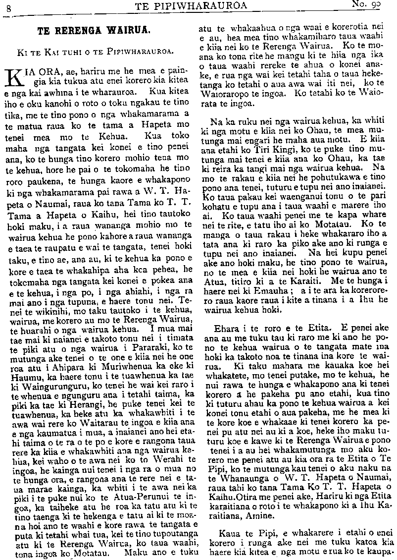 TE PIPIWHARAUROA TE RERENGA WAIRUA. Ki TE KAI TUHI O TE PIPIWHARAUROA. KIA ORA, ae, hariru me he mea e pain- gia kia tukua atu enei korero kia kitea e nga kai awhina i te wharauroa. Kua kitea iho e oku kanohi o roto o toku ngakau te tino tika, me te tino pono o nga whakamarama a te matua raua ko te tama a Hapeta mo tenei mea mo te Kehua. Kua toko maha nga tangata kei konei e tino penei ana, ko te hunga tino korero mohio tena mo te kehua, hore he pai o te tokomaha he tino roro paukena, te hunga kaore e whakapono ki nga whakamarama pai rawa a W. T. Ha- peta o Naumai, raua ko tana Tama ko T. T. Tama a Hapeta o Kaihu, hei tino tautoko hoki maku, i a raua wananga mohio mo te wairua kehua he pono kahore a raua wananga e taea te raupatu e wai te tangata, tenei hoki taku, e tino ae, ana au, ki te kehua ka pono e kore e taea te whakahipa aha koa pehea, he tokomaha nga tangata kei konei e pokea ana e te kehua, i nga po, i nga ahiahi, i nga ra mai ano i nga tupuna, e haere tonu nei. Te- nei te wikinihi mo taku tautoko i te kehua, wairua, me korero au mo te Rerenga Wairua, te huarahi o nga wairua kehua. I mua mai tae mai ki naianei e takoto tonu nei i timata te piki atu o nga wairua i Pararaki, ko te mutunga ake tenei o te one e kiia nei he one roa atu i Ahipara ki Muriwhenua ka eke ki Haumu, ka haere tonu i te tuawhenua ka tae ki Waingurunguru, ko tenei he wai kei raro i te whenua e ngunguru ana i tetahi taima, ka piki ka tae ki Herangi, he puke tenei kei te tuawhenua, ka heke atu ka whakawhiti i te awa wai rere ko Waitarau te ingoa e kiia ana e nga kaumatua i mua, a inaianei ano hei eta- hi taima o te ra o te po e kore e rangona taua rere ka kiia e whakawhiti ana nga wairua ke- hua, kei waho o te awa nei ko to Werahi te ingoa, he kainga nui tenei i nga ra o mua no te hunga ora, e rangona ana te rere nei e ta- ua marae kainga, ka whiti i te awa nei ka piki i te puke nui ko te Atua-Perunui te in- goa, ka taiheke atu he roa ka tatu atu ki te tino taenga ki te hekenga e tatu ai ki te moa- na hoi ano te waahi e kore rawa te tangata e puta ki tetahi whai tua, kei te tino tupoutanga atu ki te Rerenga Wairua, ko taua waahi, tona ingoa ko Motatau. Maku ano e tuku atu te whakaahua o nga waai e korerotia nei e au, hea mea tino whakamiharo taua waahi e kiia nei ko te Rerenga Wairua. Ko te mo- ana ko tona rite he mangu ki te hiia nga ika o taua waahi rereke te ahua o konei ana- ke, e rua nga wai kei tetahi taha o taua heke- tanga ko tetahi o aua awa wai iti nei, ko te Waioraropo te ingoa. Ko tetahi ko te Waiorata te ingoa. Na ka ruku nei nga wairua kehua, ka whiti ki nga motu e kiia nei ko Ohau, te mea mu- tunga mai engari he maha aua motu. E kiia ana etahi ko Tiri Kingi, ko te puke tino mu- tunga mai tenei e kiia ana ko Ohau, ka tae ki reira ka tangi mai nga wairua kehua. Na mo te rakau e kiia nei he pohutukawa e tino pono ana tenei, tuturu e tupu nei ano inaianei. Ko taua pakau kei waenganui tonu o te pari kohatu e tupu ana i taua waahi e marere iho ai. Ko taua waahi penei me te kapa whare nei te rite, e tatu iho ai ko Motatau. Ko te manga o taua rakau i heke whakararo iho a tata ana ki raro ka piko ake ano ki runga e tupu nei ano inaianei. Na hei kupu penei ake ano hoki maku, he tino pono te wairua, no te mea e kiia nei hoki he wairua ano te Atua, titiro ki a te Karaiti. Me te hunga i haere nei ki E mauha; a i te ara ka korerore- ro raua kaore raua i kite a tinana i a Ihu he wairua kehua hoki. Ehara i te roro e te Etita. E penei ake ana au me tuku tau ki raro me ki ano he po- no te kehua wairua o te tangata mate ma hoki ka takoto noa te tinana ina kore te wai- rua. Ki taku mahara me kauaka koe hei whakatete, mo tenei putake, mo te kehua, he nui rawa te hunga e whakapono ana ki tenei korero a he pakeha pu ano etahi, kua tino ki tuturu ahau ka pono te kehua wairua a kei konei tonu etahi o aua pakeha, me he mea ki te kore koe e whakaae ki tenei korero ka pe- nei pu atu nei au ki a koe, heke iho maku tu- turu koe e kawe ki te Rerenga Wairua e pono tenei i a au hei whakamutunga mo aku ko- rero me penei atu au kia ora ra te Etita o Te Pipi, ko te mutunga kau tenei o aku naku na te Whanaunga o W. T. Hapeta o Naumai, raua tahi ko tana Tama Ko T. T. Hapeta o Kaihu Otira me penei ake, Hariru ki nga Etita karaitiana o roto i te whakapono ki a ihu Ka- raitiana, Amine. Kaua te Pipi, e whakarere i etahi o enei korero i runga ake nei me tuku katoa kia haere kia kitea e nga motu e rua ko te kaupa-