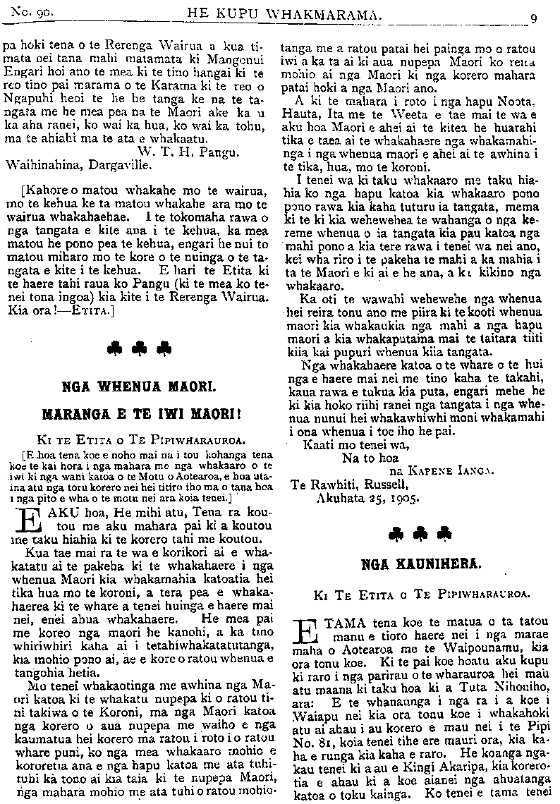 HE KUPU WHAKAMARAMA pa hoki tena o te Rerenga Wairua a kua ti- mata nei tana mahi matamata ki Mangonui Engari hoi ano te mea ki te tino hangai ki te reo tino pai marama o te Karama ki te reo o Ngapuhi heoi te he he tanga ke na te ta- ngata me he mea pea na te Maori ake ka u ka aha ranei, ko wai ka hua, ko wai ka tohu, ma te ahiahi ma te ata e whakaatu. W. T. H. Pangu. Waihinahina, Dargaville. [Kahore o matou whakahe mo te wairua, mo te kehua ke ta matou whakahe ara mo te wairua whakahaehae. I te tokomaha rawa o nga tangata e kite ana i te kehua, ka mea matou he pono pea te kehua, engari he nui to matou miharo mo te kore o te nuinga o te ta- ngata e kite i te kehua. E hari te Etita ki te haere tahi raua ko Pangu (ki te mea ko te- nei tona ingoa) kia kite i te Rerenga Wairua. Kia ora!—ETITA.] NGA WHENUA MAORI. MARANGA E TE IWI MAORI! Ki TE ETITA O TE PIPIWHARAUROA. [E hoa tena koe e noho mai na i tou kohanga tena koe te kai hora i nga mahara me nga whakaaro o te •iwi ki nga wahi katoa o te Motu o Aotearoa, e hoa uta ina atu nga toru korero nei hei titiro iho ma o taua hoi i nga pito e wha o te motu nei ara koia tenei.] E aku hoa, He mihi atu, Tena ra kou tou me aku mahara pai ki a koutou me taku hiahia ki te korero tahi me koutou. Kua tae mai ra te wa e korikori ai e wha Katatu ai te pakeha ki te whakahaere i nga whenua Maori kia whakamahia katoatia he tika hua mo te koroni, a tera pea e whaka haerea ki te whare a tenei huinga e haere ma nei, enei ahua whakahaere. He mea pai me koreo nga maori he kanohi, a ka tino whiriwhiri kaha ai i tetahiwhakatatutanga kia mohio pono ai, ae e kore o ratou whenua e tangohia hetia. Mo tenei whakaotinga me awhina nga Ma ori katoa ki te whakatu nupepa ki o ratou ti no takiwa o te Koroni, ma nga Maori kato, nga korero o aua nupepa me waiho e nga kaumatua hei korero ma ratou i roto i o ratou whare puni, ko nga mea whakaaro mohio korerotia ana e nga hapu katoa me ata tuhi tuhi ka tono ai kia taia ki te nupepa Maori nga mahara mohio me ata tuhi o ratou mohio tanga me a ratou patai hei painga mo o ratou iwi a ka ta ai ki aua nupepa Maori ko rena mohio ai nga Maori ki nga korero mahara patai hoki a nga Maori ano. A ki te mahara i roto i nga hapu Noota, Hauta, Ita me te Weeta e tae mai te wa e aku hoa Maori e ahei ai te kitea he huarahi tika e taea ai te whakahaere nga whakamahi- nga i nga whenua maori e ahei ai te awhina i te tika, hua, mo te koroni. I tenei wa ki taku whakaaro me taku hia- hia ko nga hapu katoa kia whakaaro pono pono rawa kia kaha tuturu ia tangata, mema ki te ki kia wehewehea te wahanga o nga ke- reme whenua o ia tangata kia pau katoa nga mahi pono a kia tere rawa i tenei wa nei ano, kei wha riro i te pakeha te mahi a ka mahia i ta te Maori e ki ai e he ana, aki kikino nga whakaaro. Ka oti te wawahi wehewehe nga whenua hei reira tonu ano me piira ki te kooti whenua maori kia whakaukia nga mahi a nga hapu maori a kia whakaputaina mai te taitara tiiti kiia kai pupuri whenua kiia tangata. Nga whakahaere katoa o te whare o te hui nga e haere mai nei me tino kaha te takahi, kaua rawa e tukua kia puta, engari mehe he ki kia hoko nihi ranei nga tangata i nga whe- nua nunui hei whakawhiwhi moni whakamahi i ona whenua i toe iho he pai. Kaati mo tenei wa, Na to hoa na KAPENE IANGA. Te Rawhiti, Russell, Akuhata 25,1905' NGA KAUNIHERA. Ki TE ETITA o TE PIPIWHARAUROA. E Tama tena koe te matua o ta tatou manu e tioro haere nei i nga marae maha o Aotearoa me te Waipounamu, kia ora tonu koe. Ki te pai koe hoatu aku kupu ki raro i nga parirau o te wharauroa hei mau atu maana ki taku hoa ki a Tuta Nihoniho, ara: E te whanaunga i nga ra i a koe i Waiapu nei kia ora tonu koe i whakahoki atu ai ahau i au korero e mau nei i te Pipi No. 81, koia tenei tihe ere mauri ora, kia ka- ha e runga kia kaha e raro. He koanga nga- kau tenei ki a au e Kingi Akaripa, kia korero- tia e ahau ki a koe aianei nga ahuatanga katoa o toku kainga. Ko tenei e tama tenei