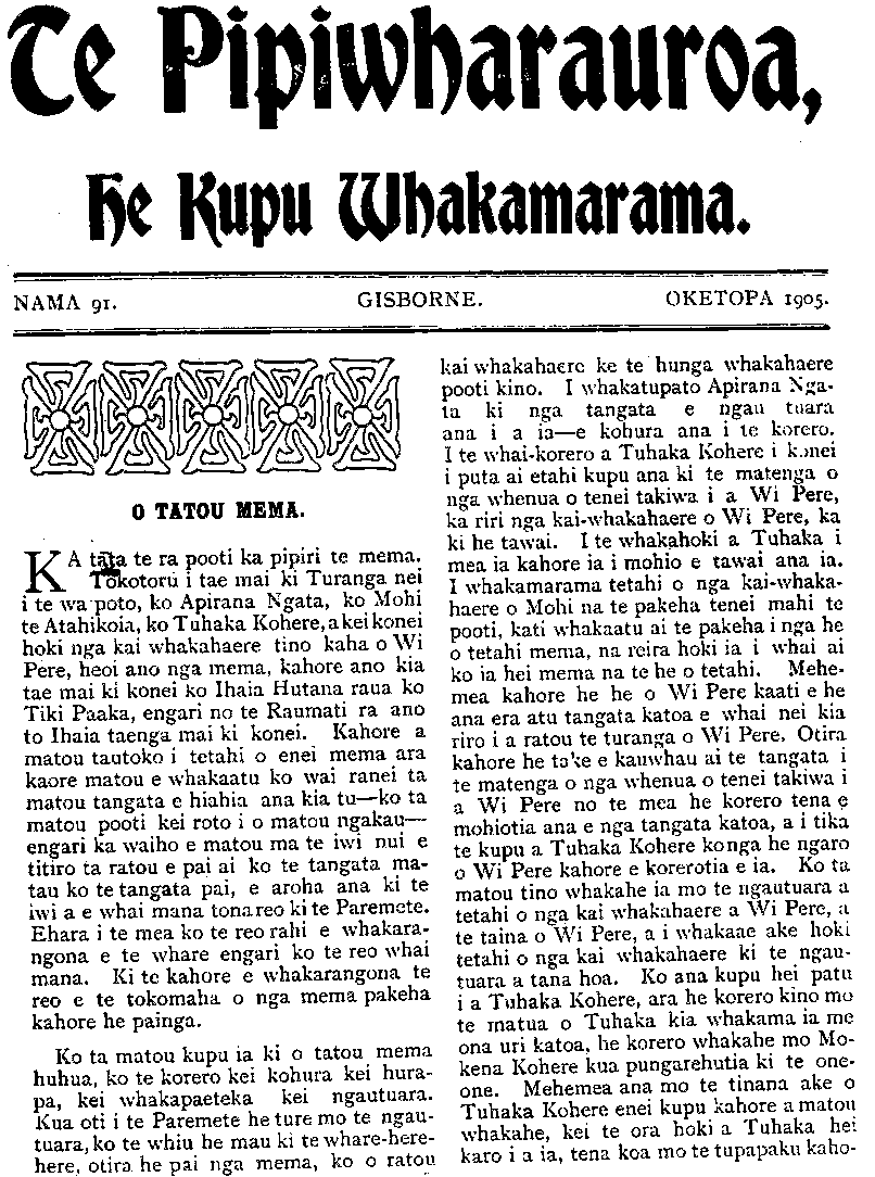 Te Pipiwharauroa, he Kupu Whakamarama. NAMA 91 OKETOPA 1905. O TATOU MEMA. KA tata te ra pooti ka pipiri te mema. Tokotoru i tae mai ki Turanga nei i te wa poto, ko Apirana Ngata, ko Mohi te Atahikoia, ko Tuhaka Kohere, a kei konei hoki nga kai whakahaere tino kaha o Wi Pere, heoi ano nga mema, kahore ano kia tae mai ki konei ko Ihaia Hutana raua ko Tiki Paaka, engari no te Raumati ra ano to Ihaia taenga mai ki konei. Kahore a matou tautoko i tetahi o enei mema ara kaore matou e whakaatu ko wai ranei ta matou tangata e hiahia ana kia tu—ko ta matou pooti kei roto i o matou ngakau— engari ka waiho e matou ma te iwi nui e titiro ta ratou e pai ai ko te tangata ma- tau ko te tangata pai, e aroha ana ki te iwi a e whai mana tona reo ki te Paremete. Ehara i te mea ko te reo rahi e wharara- ngona e te whare engari ko te reo whai mana. Ki te kahore e whakarangona te reo e te tokomaha o nga mema pakeha kahore he painga. Ko ta matou kupu ia ki o tatou mema huhua, ko te korero kei kohura kei hura- pa, kei whakapaeteka kei ngautuara. Kua oti i te Paremete he ture mo te ngau- tuara, ko te whiu he mau ki te wharehere- here, otira he pai nga mema, ko o ratou kai whakahaere ke te hunga whakahaere pooti kino. I whakatupato Apirana Nga- ta ki nga tangata e ngau tuara ana i a ia—e kohura ana i te korero. I te whaikorero a Tuhaka Kohere i konei i puta ai etahi kupu ana ki te matenga o nga whenua o tenei takiwa i a Wi Pere, ka riri nga kaiwhakahaere o Wi Pere, ka ki he tawai. I te whakahoki a Tuhaka i mea ia kahore ia i mohio e tawai ana ia. I whakamarama tetahi o nga kaiwhaka- haere o Mohi na te pakeha tenei mahi te pooti, kati whakaatu ai te pakeha i nga he o tetahi mema, na reira hoki ia i whai ai ko ia hei mema na te he o tetahi. Mehe- mea kahore he he o Wi Pere kaati e he ana era atu tangata katoa e whai nei kia riro i a ratou te turanga o Wi Pere. Otira kahore he take e kauwhau ai te tangata i te matenga o nga whenua o tenei takiwa i a Wi Pere no te mea he korero tena e mohiotia ana e nga tangata katoa, a i tika te kupu a Tuhaka Kohere konga he ngaro o Wi Pere kahore e korerotia e ia. Ko ta matou tino whakahe ia mo te ngautuara a tetahi o nga kai whakahaere a Wi Pere, a te taina o Wi Pere, a i whakaae ake hoki tetahi o nga kai whakahaere ki te ngau- tuara a tana hoa. Ko ana kupu hei patu i a Tuhaka Kohere, ara he korero kino mo te matua o Tuhaka kia whakama ia me ona uri katoa, he korero whakahe mo Mo- kena Kohere kua pungarehutia ki te one- one. Mehemea ana mo te tinana ake o Tuhaka Kohere enei kupu kahore a matou whakahe, kei te ora hoki a Tuhaka hei karo i a ia, tena koa mo te tupapaku kaho-