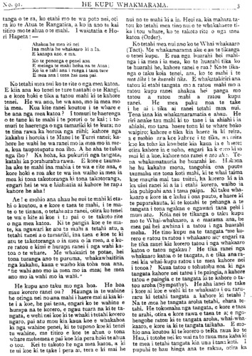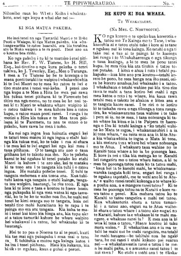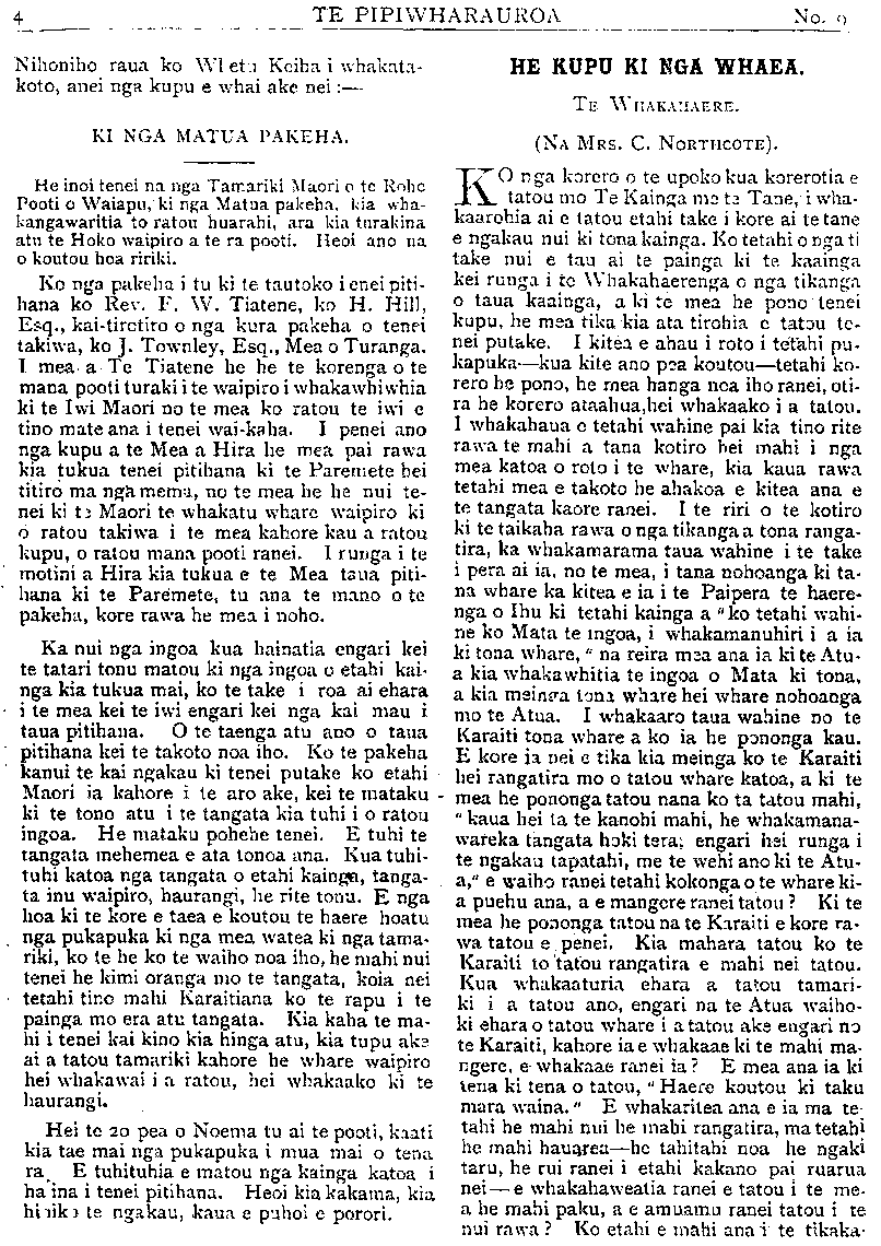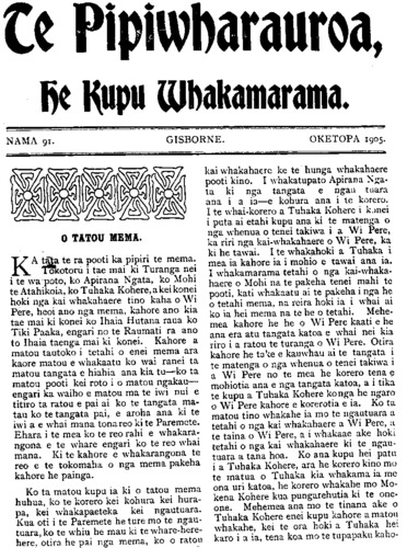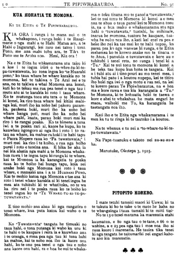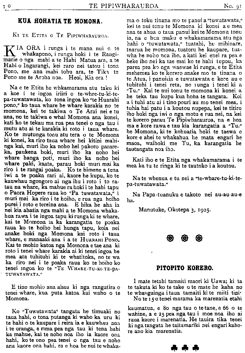 TE PIPIWHARAUROA KUA HOHATIA TE MOMONA. Ki TE ETITA O TE PIPIWHARAUROA. KIA ORA i runga i te mana nui o te whakapono, i runga hoki i te Rangi- marie o nga mahi a te Hahi Matua ara, a te Hahi o Ingarangi, kei raro nei tatou i tona Pono, me ana mahi tohu ara, te Tika te Pono me te Aroha noa. Heoi, Kia ora ! Na e te Etita he whakamarama atu taku ki a koe i te ingoa iriiri o te whare tu ki te patuwatawata, ko tona ingoa ko "te Huarahi pono," ko taua whare he whare karakia no te momona, kei te takiwa o Te Arai nei e tu ana, no te takiwa e whai Momona ana konei, kati ko te tekau ma rua pea tenei o nga tau i mutu atu ai te karakia ki roto i taua whare. Ko te mutunga tonu atu tera o te Momona ki konei, ka riro taua whare hei kitini mahi- nga kai, muri iho ka noho hei pakoro parare- ka, paukena hoki, muri iho ka noho hei whare hanga poti, muri iho ka noho hei whare paki, kaata, parau hoki muri mai ka riro i te rangai poaka. Ko te himene a tena iwi a te poaka rari ai, kaore he kupu, ko te kauwhau ngongoro ai nga ihu i roto i to ra- tau na whare, ka mahue ra hoki i te hahi tapu o Paora Hopere raua ko "Pa tuwatawata," i muri mai ka riro i te hoiho, e rua nga hoiho purei i roto e tereina ana. E hika he aha ia nei kia ahatia nga mahi a te Momona whaka- hua rawa i te ingoa tapu ki runga ki te whare, kai te Momona ia ka karangatia te poaka raua ko te hoiho hei hunga tapu, koia nei anake hoki nga Momona kai roto i taua whare, e manaaki ana i a te HUARAHI PONO. Kai te mohio katoa nga Momona e tae ana ki roto i tenei whare karakia ai ki tenei ingoa he mea ata tuhituhi ki te whatitoka, no te wa ka riro nei i te poaka raua ko te hoiho ko tenei ingoa ko te "TE WHARE-Tu-KI•TE-pA- TUWATAWATA." E tino mohio ana ahau ki nga rangatira o tenei whare, kua puta katoa kai waho o te Momona. Ko "Tuwatawata" tangata he timuaki no taua hahi, o tona putanga ki waho ka uru ki te hahi o te kaupare i reira ia e kauwhau ana i te oranga, e rima pea nga tau ki tena hahi ka mahue, kai te noho noa iho ia kaore ona hahi, ko te ono pea tenei o nga tau e noho ana kaore ona hahi, ra e hoa he nui te whaka- ma o toku tinana mo te panui a "tuwatawata," kei te nui tonu te Momona ki konei a e mea ana te ahua o taua panui kei te Momona tonu ia, na e hoa maku e whakamarama atu nga hahi o "tuwatawata," tuatahi, he mihinare, tuarua he momona, tuatoru he kaupare, tua- wha he noho noa iho, a kati kei enei ra pea e heke iho nei ka tae mai ko te hahi tupou, ka parea pea ko nga waewae ki runga, e te Etita mehemea ko te korero anake mo te tinana o te Atua, i panuitia e tuwatawata e kore au e tuhituhi i tenei reta, no runga i tenei ki a "Tu." Kai te nui tonu te momona ki konei a he teka tau kupu kua hoha te tangata. Koi a i tuhi atu ai i tino pouri au mo tenei mea, i tuhia hai patu i a koutou nupepa, kei te titiro iho hoki nga iwi o nga motu e rua nei, na kei te korero parau Te Pipiwharauroa, na e hoa ma e kore rawa e tau kia karangatia a "Tu." he Momona, ki te kohuatia hoki te taewa e kore e ahei te whakahua he mata engari he maoa, waihoki me Tu, ka karangatia he tautangata noa iho. Kati iho e te Etita nga whakamarama i te mea ka tu te ringa ki te tautoko i a koutou. Na te whenua e tu nei a "te•whare-tu-ki-te- pa•tuwatawata." Na Papatuanuku e takoto nei auau-aue ha. Manutuke Okotepa 3, 1905. PITOPITO KORERO. I mate tetahi tamaiti maori ki Uawa; ki ta te takuta ki ko te take o te mate he kaha no te whangainga i taua tamaiti ki te miki tini No te 15 o tenei marama ka marenatia etahi kaumatua, e 80 nga tau o te tane, e 66 o te wahine, a e 25 pea nga tau i moe noa iho ai raua kaore i marenatia, He tauira tika tenei ki nga tangata he taitamariki nei engari kaho- re ano kia marenatia.