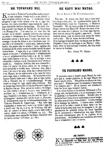 HE KUPU WHAKAMARAMA HE TUPAPAKU NUI. Kua mate aTakuta Panato (Barnado),tetahi o nga tangata rongo nui o te ao, tetahi o nga tangata nunui o te ao. I mohiotia tenei tangata e nga wahi katoa o te ao e nga iwi katoa, mo tana atawhai i nga tamariki pani i nga tamariki kahore he kainga. Ko tana hia- hia tuatahi he haere ki Haina ki te kauwhau i te Rongo Pai. I te mea ka 21 ona tau ka tutaki ia ki tetahi tamaiti kahore ona kainga na tenei i whakaatu ki a Takuta Panato he to- komaha ratou e moe ana i waho, no tona ha- erenga i te po ka kitea e ia e tawheta aua to- na tini o te tamariki i waho noa, kahore he ka- kahu, ka pupu ake te aroha i tona ngakau, ka huaina e ia he mahi mana he tiaki tamariki pani rawa-kore. I nga tau e 40 i mahi ai tenei ta- ngata e 60,000 i whakatupuria i whakaakona e ia a i whakawhiwhia hoki e ia ki te mahi i nga wahi katoa o te ao. Ko te nuinga o ana tamariki i tukua e ia ki Kanata ki tera whenua mahi ai. Ahakoa i hikitia ake ana tamariki i roto i te paru i te kino, otira ko te nuinga o ana tamariki e totika ana, tokorua ano pea o roto i te 100 e he ana, tena ko o tatou kura ko o te Maori, ko te tokomaha e he ana he toru- toru nga mea e totika ana. Ki ta matou wha- kaaro tetahi take nui i tika i pai ai nga tama- riki a Panato na te whakaakoranga ki nga mahi a ringa ki nga mahi ahu-whenua. Kei te tangi nga tamariki a Takuta Panato i nga wa hi katoa o te ao. Kia penei te mate o te tanga- ta, kia waiho i te ao e 60,000 ana tamariki i awhina ai, i whakatupu ai, i whakaora ai i nga huarahi o te hara, nui ke atu te hari i to te tangata i mahue iho nei ki te ao e £60,000. E whakaturia ana he whakamaharatanga mo Takuta Panato ki Ingarangi. " Ka hari nga tupapaku e mate nei i roto i te Ariki i nga wa a muri nei: Ae ra, e ai ta te Wairua, kia oki- oki ai ratou i a ratou mahi, e aru tahi hoki a ratou mahi i a ratou," (Whkite 14 13). " Ka whakatika ana tamariki he kupu manaaki ano ta ratou mona" (Whtau. 31 28.) HE KAPU WAI MATAO. Ki TE ETITA O TE PIPIWHARAUROA. Kia ora. E manu me hari atu e koe enei toru kupu aku, ara, he whakawhetai naku ki a Mahauwhero raua ko Tarawau, o Rahotu Taranaki. Mo to raua aroha ki te homai ma- hinga taewa ma Maria H. Kaipo me tana wha- nau, na raua ano i parau, na raua nga taewa, heoi ano ta maua he ngaki i nga taru. Kaati ahakoa aitua noa te taewa kua puta ke tenei aroha nui. Ma te Atua korua e awhina. Kua kainga te kapeti hou na maua ano ko Rev Papania i huri te mahinga a na Mana i wha- kato, heoi ra kua kainga inaianei, ka tata hoki te taewa te kainga. Rev. Hone W. Kaipo. TE POUNAMU MAORI. E panuitia ana e tetahi pepa Maori he wai- piro pai a tetahi pakeha, a, ko nga Maori me haere atu ki reira. He pehea te ahua o te wai- piro pai ? Kahore ranei te tangata e haurangi i te waipiro pai ? Ki ta matou nei whakaaro hoki he kino nga waipiro katoa. I te whaikorero a te minita Mihinare o Tu- ranga nei, ka korerotia e ia te matenga o teta- hi pakeha i te karaihe kotahi. Kotahi ano te karaihe huri tonu atu te mahunga o taua tanga- ta, taka ana ki raro i tona hoiho. I tona taenga ki te kainga ka takoto. I haere tana wahine ki te ui ki te take i mate ai tana tane i te ka- raihe kotahi, mea mai ana te tangata o te pa- parakauta he pohehe nona, ko taua karaihe no te pounamu i whakaritea ma nga Maori. He mea whakananu pea ki te tupeka ki te purutoone. Awhekaihe ma turakina atu tenei kai e whakakuri nei i a tatou.