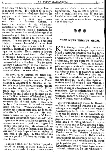 TE PIPIWHARAUROA re nei ona reo hei karo i nga kupu kino a te tangata mona. He tikanga tutua rawa tenei, a ki ta matou whakaaro kahore he painga o enei korero mo te pooti o Wi Pere. I te mea kua hemo noa atu a- Mokena Kohere, e tono ana matou kia ata whakama ramatia e te teina o Wi Pere tana kupu na Mokena Kohere i hoko a Patutahi, no te mea he korero hou tenei, kia rongo ai te tokomaha ki te tika ki te teka ranei o enei korero, inahoki kahore i te marama ki a matou. He mea pehea i taea ai e Mokena Kohere te hoko a Patutahi ehara nei hoki i a ia ? Ki ta matou whakaaro hoki i ta- ngohia a Patutahi e te Kawanatanga i ru- nga i te raupatu. Ko ta matou Ia i rongo ai, a he korero whanui tenei, i whai kupu a Mokena Kohere ki a Rongowhakaata me te Aitanga a Mahaki kia kaua e uru, e tautoko hoki i te Hauhau. Na to ratou korenga e whakarongo ka mate ratou me o ratou whenua i runga i te tikanga o te whawhai ehara i te mea tahae. He tawai ta te tangata mo tenei kau- matua he whakahonore ta matou. He korero whanui e tangohia ana e te Kawa- natanga a Waiapu na te Mokena ka ora, ko tana kupu ki te Kawanatanga, "Ehara i te pakeha taku riri, naku tonu." E ha- tepea ana te Hauhau i Te Pito na Te Mokena ka ora, i tohe a te Mokena kia ka- ua a Te Kooti e tukua ki Wharekauri, me i whakarongo te pakeha kua kore e pa he raruraru nui ki tenei motu, i mea a te Mokena kia tahuna ki te ahi te whare kooti whenua i Waiomatatini, i tona mohio hei huarahi mate tera mo te Maori, a he tika hoki ta taua koroua. He wha- kamanamana na nga uri a te Mokena i mate parukore atu nga ringaringa o to ratou tupuna no te mea rawa ka pungarehu ki te oneone ka timata te pani a te tangata kia pango tona ingoa ma. He whakatauki na te pakeha, "Waiho te hunga mate kia oki oki ana," ko nga kupu whakahe utaina ki nga mea e ora ana. E tino mohio ana matou e pouri a Wi Pere ina rongo ia ki enei korero. I kitea e etahi kuri he raiona tupapaku katahi ka timata ta ratou hohoni i taua raiona, ka tu etahi i runga i tana tinana; ngengere whakahi ai me te mea nei he nui Io ratou toa. Na, ko tetahi pokiha i ta- whiti e matakitaki ana mai ki aua kuri, katahi ka rere mai Iana kupu, "Na te mea ano ra ka mate a nehe tane, i ngengere noa ai koutou." TURE MURU WHENUA MAORI. KO te tikanga o tenei pire i tona wha kaaringa ai he tango i nga whenua Maori o Aotearoa e takoto noa ana kahore i te whakamahia, he tango ma etahi Poari e whakahaere, e tuku ki te reti, e mokete, e whakapai, ko nga Poari ma te Kawana- tanga e whiriwhiri. Otira na te Komiti i patu meinga ana kia whai mana tenei ture ki nga whenua anake o te Tai Rawhiti me nga whenua hoki ki te hauraro o Akarana ara ki te Tokerau. Kahore e riro ma te iwi kainga e whakaae, engari ka murua mo nga tau e 50. E ahei nga Poari ki te mokete moni ki runga i aua whenua, a mehemea e araia ana te mokete e ahei te Minita Maori te whakakore i te ture arai i te mokete. Ko te rehitatanga o nga whe- nua i waho i enei takiwa ma nga Poari e whakaae, kahore he tikanga e riro ai ma te Kooti Whenua Maori e rehita. No te whakahokinga mai a te Komiti i te Pire ki te whare ka whaoria e te Kawa- natanga he rarangi hou ara e whai mana te Kawanatanga ki te hoko whenua Maori, ko te utu kei runga i ta te Kawanatanga wariu, me titiro hoki te Kawanatanga me- hemea e whai whenua ana nga Maori e hoko ana i to ratou whenua, ki te kore whenua ratou ma te Kawanatanga e hoa- tu he whenua Karauna hei whakawhiti, engari e kore tenei rarangi e pa ki te Tai- Rawhiti me te Tai-Tokerau. I runga i te whakahe a Wi Pere raua ko Heke ka wha- katarewangia tenei rarangi mo nga tau e rua, hei te tau 1908 whakahaere ai, engari kei te pohehe pea o tatou mema, kei te Kawanatanga tonu te mana hoko whenua inaianei, kahore ano he ture whakakore. a