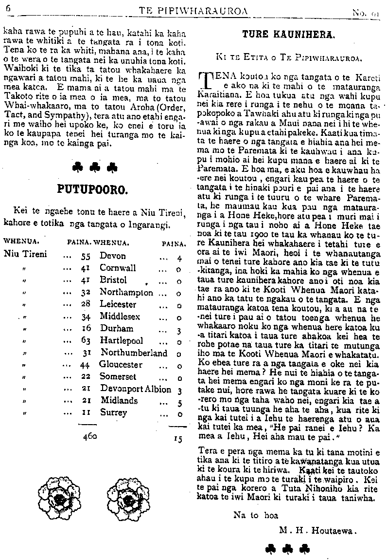 HE KUPU WHAKAMARAMA. I tono a Apirana Ngata kia whakaurua he rarangi tuku moni ki nga komiti Maori hei whakapai i o ratou whenua ko te nui o te moni hei tuku kaua e eke rawa ki te utu o te whenua, me hanga hoki he tika- nga e kore ai e maumauria e nga Maori nga moni mokete. Ko tenei rawa te rarangi pai o te ture nei no te mea heoi ano te mea e kore ai e murua nga whenua Maori ko te whakama- hia. E ki ana a Apirama kahore he pai o te whakawhirinaki ki nga ture ki nga kupu ranei a te Kawanatanga, he ture, he kupu pahekeheke, heoi ano te tino ture ko te ahuwhenua. Inakoa kua whakatarewatia te hoko mo nga tau e rua, huri rawa ake aua tau kua roroa nga niho, kua piango te puku, ka hohoni ana ki te whenua e kore e rikarika. E tino takahi ana tenei ture i te Tiriti o Waitangi, a kua puta te whakaaro ki te kitea te taumaha o tenei ture me haere ki Ingarangi ki te whakaatu ki te whenua matua kua takahia te Tiriti o Waitangi. Te take i hanga ai tenei ture muru he kaha no te kowhete o nga pakeha mo te herenga o nga whenua Maori e te Ture Kaunihera, he hua tenei ture no taua ture ano engari hoki ka turakina nga Kaunihera ka whakaturia he Poari hei whakakapi, engari hoki kaore e riro ma te Maori e pooti nga mema o aua Poari heoi ano ma te Kawanatanga e whakatu, kotahi ano te Maori o te Poari kotahi. He ana te manawa ! Ko nga iwi e mate ko Ngatiporou kei te takoto noa iho nga whenua, ara i Waiapu awa ki Taumata-o- Apanui, ko te Whanau-a-Apanui, ko Tuhoe ko Ngapuhi. Maumau noa te tautoko o tatou mema i te Kawanatanga na te Ka- wanatanga ano tenei Pire engari te Apiti- hana ara a te Mahi, tumuaki o te Apitiha- na, a Hereni mema mo Pei o Pereti, a Tianene mema mo Taranaki, i whakahe ki nga rarangi muru e tenei ture. Ko te Maori ko Hone Heke i whakaae ki te tikanga muru no muri mai ka rere ke hoki ana kupu. E mea ana matou he pai ke atu pea me pakeha he mema mo tatou. Taria te ahatanga, te ahatanga ranei o tenei ture engari whakapaua te uaua ki te whakapai i o tatou whenua inaianei. Kia ora e te Iwi, i a tato e pehia kinotia nei e te pakeha. HE INOI KI TE IWI PAKEHA. I TETAHI hui nui a te pakeha i tu ki Turanga nei ka whakatakotoria te Piti- hana a nga Maori o te Rohe Pooti o Waiapu ki nga pakeha, anei te pitihana e whai ake nei: HE INOI NA NGA MAORI O TE ROHE POOTI O WAIAPU KI NGA PAKEHA WHAI POOTI. Ki te Iwi Pakeha whai pooti o te Takiwa o Waiapu. E nga hoa i raro i te maru kotahi o to tatou Kingi atawhai, Tena koutou, kia ora ! He panga mai no te mauri ki te ngakau i toko ake ai te wha- kaaro kia tuku inoi atu ki a koutou, ki te hunga whai mana, whai reo, whai ringaringa, kua wha- kawhiwhia e te Ture, kia puta te aroha i o koutou ngakau ki o koutou teina, kahore nei he reo, kua tutakina nei nga mangai e te ringaringa maro o te Ture, ara kia turakina atu e koutou te hoko waipiro i nga rohe katoa o Waiapu a tenei pooti- tanga e tu mai nei. Kahore i rua o matou wha- kaaro mo tenei kai mo te waipiro, kotahi ano te whakaaro, ara, he kai kino rawa, he mea whaka- pohehe i nga whakaaro o te tangata, he mea wha- karawakore,whakamatautau i te tangata ki nga huarahi katoa o te kino. E tino mohio ana ma- tou ki te kahore he waipiro ka piki nga mahi me te tangata. Na koutou matou i whakaako ki te- nei wai kaha, ahakoa e matauria ana tona kino, otira e matauria ana ano hoki tona kaha nui ki te to inga hiahia o te tangata. He maha nga takiwa he tokomaha rawa nei nga Maori i nga pakeha e tu ana he whare hoko waipiro, otira ko nga Maori ko te hunga tokomaha kahore he pooti, ko nga pake- ha ko te hunga tokoiti e whai pooti ana. Na ko- nei matou, e nga hoa pakeha matou e noho tahi nei ite whenua kotahi, e hapai nei ite mana kota- hi, e koropiko nei ki te Atua kotahi, ka inoi atu ki a koutou kia tipia atu tenei taru kino i o tatou marae kia mahi noa ai te tane, kia haere noa ai te wahine, kia takaro noa ai te tamariki, kahore he mea hei whakawehi. Whakamana tenei inoi, a o koutou teina o te kiri mangu. Heoi ano, na:— Na Reweti Kohere i uaki te pitihana, ko ona hoa ko nga taitamariki o Te Rau Kareti me etahi atu e noho ana i te taone. I muri iho ka uakina ko ta nga tamariki na Hariata