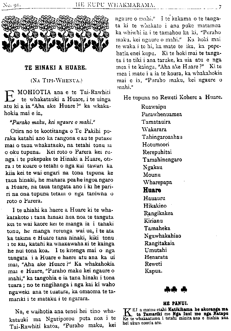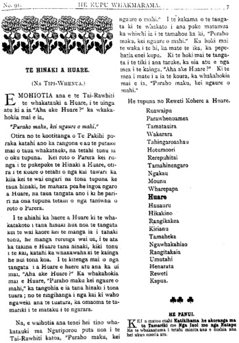 HE KUPU WHAKAMARAMA. TE HINAKI A HUARE. (NA TIPIWHENUA.) E MOHIOTIA ana e te Tairawhiti te whakatauki a Huare, i te uinga atu ki a ia "Aha ake Huare?" ka whaka- hokia mai e ia, "Puraho maku, kei ngaure o mahi." Otira no te kootitanga o Te Pakihi po- raka katahi ano ka rangona e au te putake mai o taua whakatauki, na tetahi tonu ia o oku tupuna. Kei roto o Parera kei ru- nga i te pukepuke te Hinaki a Huare, oti- ra i te kuare o tetahi o nga kai tawari ka kiia kei te wai engari na tona tupuna ke taua hinaki, he mahara pea he ingoa ngaro a Huare, na taua tangata ano i ki he pari- ri na ona tupuna tetahi o nga taniwha o roto o Parera. I te ahiahi ka haere a Huare ki te wha- katakoto i tana hinaki hua noa te tangata kei te wai kaore kei te manga ia i tahaki tonu, he manga rerenga wai ua, i te ata ka takina e Huare tana hinaki, kiki tonu i te kai, katahi ka whakawaha ki te kainga he nui tona koa. I te kitenga mai o nga tangata i a Huare e haere atu ana ka ui mai, "Aha ake Huare?" Ka whakahokia mai e Huare, "Puraho maku kei ngaure o mahi," ka tangohia e ia tana hinaki i tona tuara; no te ringihanga i nga kai ki waho ngaweki ana te tuatara, ka omaoma te ta- mariki i te mataku i te ngarara. Na, e waihotia ana tenei hei tino wha- katauki ma Ngatiporou puta noa i te TaiRawhiti katoa, "Puraho maku. kei • ngaure o mahi." I te kakama o te tanga- ta ki te whakato i ana puke matamua ka whiwhi ia i te tamahou ka ki, "Puraho maka, kei ngaure o mahi." Ka hoki mai te waka i te hi, ka mate te ika, ka pepe- hatia enei kupu. Ki te hoki mai te tanga- ta i te tiki i ana tarake, ka uia atu e nga mea i te kainga, "Aha ake Haare?" Ki te mea i mate i a ia te koura, ka whakahokia mai e ia, "Puraho maku, kei ngaure o mahi." He tupuna no Reweti Kohere a Huare. Ruawaipu Parawhenuamea T amatauira Wakarara Tahingaroaahau Hotumoori Rerepuhitai Tamahinengaro Ngakau Mounu Wharepapa Huare Hauauru Hikakino Rangikakea Kirianu Tamaiheka NgawhakahiaoNgawhakahiao Rangitakaia Umutahi Henarata Reweti Kapua. - HE PANUI. Kei a matou etahi Katikihama he akoranga ma» te Tamariki me Nga Inoi mo nga Ratapu Ke te whakaatuma i tetahi minita ana e hiahia ana hei ukuu nootia atu.