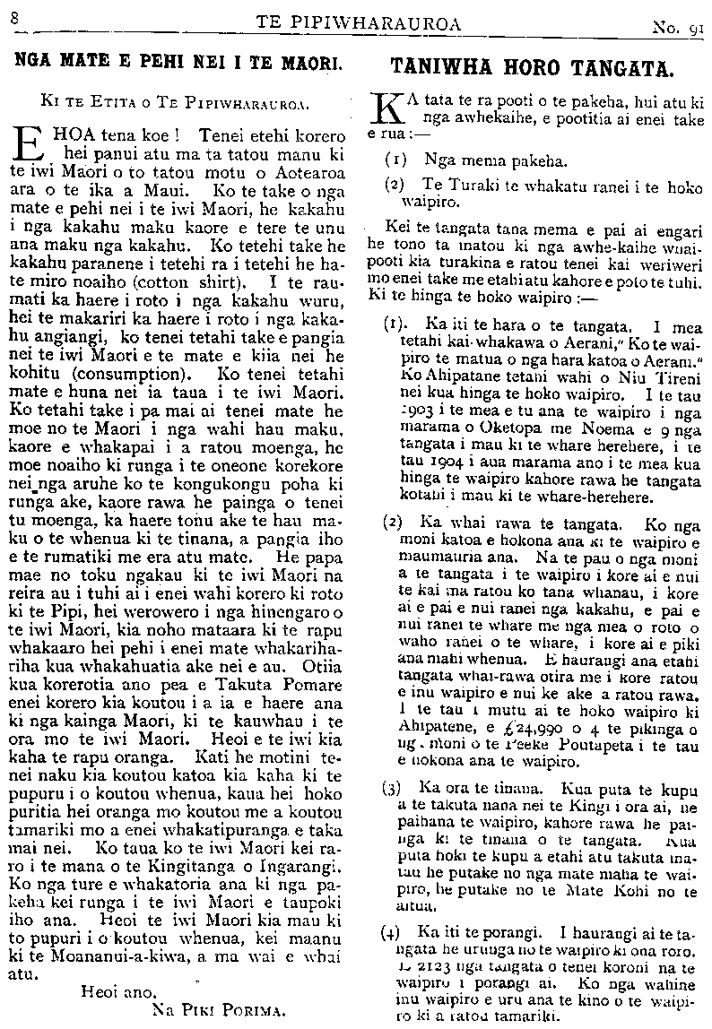TE PIPIWHARAUROA NGA MATE E PEHI NEI I TE MAORI. Ki TE ETITA O TE PIPIWHARAUROA. EHOA tena koe! Tenei etehi korero hei panui atu ma ta tatou manu ki te iwi Maori o to tatou motu o Aotearoa ara o te ika a Maui. Ko te take o nga mate e pehi nei i te iwi Maori, he kakahu i nga kakahu maku kaore e tere te unu ana maku nga kakahu. Ko tetehi take he kakahu paranene i tetehi ra i tetehi he ha- te miro noaiho (cotton shirt). I te rau- mati ka haere i roto i nga kakahu wuru, hei te makariri ka haere i roto i nga kaka- hu angiangi, ko tenei tetahi take e pangia nei te iwi Maori e te mate e kiia nei he kohitu (consumption). Ko tenei tetahi mate e huna nei ia taua i te iwi Maori. Ko tetahi take i pa mai ai tenei mate he moe no te Maori i nga wahi hau maku, kaore e whakapai i a ratou moenga, he moe noaiho ki runga i te oneone korekore nei nga aruhe ko te kongukongu poha ki runga ake, kaore rawa he painga o tenei tu moenga, ka haere tonu ake te hau ma- ku o te whenua ki te tinana, a pangia iho e te rumatiki me era atu mate. He papa mae no toku ngakau ki te iwi Maori na reira au i tuhi ai i enei wahi korero ki roto ki te Pipi, hei werowero i nga hinengaro o te iwi Maori, kia noho mataara ki te rapu whakaaro hei pehi i enei mate whakariha- riha kua whakahuatia ake nei e au. Otiia kua korerotia ano pea e Takuta Pomare enei korero kia koutou i a ia e haere ana ki nga kainga Maori, ki te kauwhau i te ora mo te iwi Maori. Heoi e te iwi kia kaha te rapu oranga. Kati he motini te- nei naku kia koutou katoa kia kaha ki te pupuru i o koutou whenua, kaua hei hoko puritia hei oranga mo koutou me a koutou tamariki mo a enei whakatipuranga e taka mai nei. Ko taua ko te iwi Maori kei ra- ro i te mana o te Kingitanga o Ingarangi. Ko nga ture e whakatoria ana ki nga pa- keha kei runga i te iwi Maori e taupoki iho ana. Heoi te iwi Maori kia mau ki to pupuri i o koutou whenua, kei maanu ki te Moananui a kiwa, a ma wai e whai atu. Heoi ano. Na PIKI PORIMA. TANIWHA HORO TANGATA. KA tata te ra pooti o te pakeha, hui atu ki nga awhekaihe,, e pootitia ai enei take e rua:— (1) Nga mema pakeha. (2) Te Turaki te whakatu ranei i te hoko waipiro. Kei te tangata tana mema e pai ai engari he tono ta matou ki nga awhekaihe whai- pooti kia turakina e ratou tenei kai weriweri mo enei take me etahi atu kahore e poto te tuhi. Ki te hinga te hoko waipiro:— (1). Ka iti te hara o te tangata. I mea tetahi kaiwhakawa o Aerani," Kote wai- piro te matua o nga hara katoa o Aerani." Ko Ahipatane tetahi wahi o Niu Tireni nei kua hinga te hoko waipiro. I te tau -903 i te mea e tu ana te waipiro i nga marama o Oketopa me Noema e 9 nga tangata i mau ki te whare herehere, i te tau 1904 i aua marama ano i te mea kua hinga te waipiro kahore rawa he tangata kotahi i mau ki te whare-herehere. (2) Ka whai rawa te tangata. Ko nga moni katoa e hokona ana KI te waipiro e maumauria ana. Na te pau o nga moni a te tangata i te waipiro i kore ai e nui te kai ma ratou ko tana whanau, i kore ai e pai e nui ranei nga kakahu, e pai e nui ranei te whare me nga mea o roto o waho ranei o te whare, i kore ai e piki ana matai whenua. E haurangi ana etahi tangata whairawa otira me i Kore ratou e inu waipiro e nui ke ake a ratou rawa. 1 te tau i mutu ai te hoko waipiro ki Ahipatene, e £24, 990 o 4 te pikinga o nga moni o te Peeke Poutapeta i te tau e Hokona ana te waipiro. (3) Ka ora te tinana. Kua puta te kupu a te takuta nana nei te Kingi i ora ai, ne paihana te waipiro, kahore rawa he pai- nga ki te tinana o te tangata. Kua puia hoki te kupu a etahi atu takuta ma- tau he putake no nga mate maha te wai- piro, he putake no te Mate Kohi no te aitua. (4) Ka iti te porangi. I haurangi ai te ta- ngata he urunga no te waipiro ki ona roro. i 2123 nga t>, tangata o tenei koroni na te waipiro i porangi ai. Ko nga wahine inu waipiro e uru ana te kino o te waipi- ro ki a ratou tamariki.