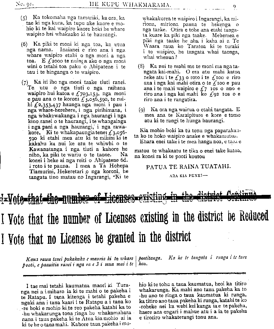 HE KUPU -WHAKAMARAMA. (5) Ka tokomaha nga tamariki, ka ora, ka tae ki nga kura, ka tupu ake kaore e mo- hio ki te kai waipiro kaore hoki he whare waipiro hei whakaako ki te haurangi. (6) Ka piki te moni ki nga toa, ka utua nga nama. Inaianei e riro ana i nga whare waipiro etahi o nga moni a nga toa. E £2000 te nuinga ake o nga moni wini o tetahi toa paku o Ahipatene i te tau i te hinganga o te waipiro. (7) Ka iti iho nga moni taake tiuti ranei. Te utu o nga tiuti o nga raihana waipiro hui katoa e £703, 153, nga moni e pau ana o te koroni £3, 056,, 590, te rui- hi £2, 353.437 haunga nga moni i pau i nga whare-herehere, i nga pirihimana, i nga whakawakanga i nga haurangi i nga kino ranei o te haurangi, i te whangainga i nga pani a nga haurangi, i nga rawa- kore Kite whakapaungia tenei £3, 056- 590 ki etahi mea atu ki te mihini ki te kakahu ka nui ke atu te whiwhi o te Kawanatanga i nga tiuti a kahore he niho, ka piki te wariu o te taone. Na konei i heke ai nga reiti o Ahipatene 6d. i roto i te pauna. I mea a Ta Hohepa Tiamurini, Hekeretari o nga koroni, he tangata tino matau no Ingarangi, "Ki te whakakorea te waipiro i Ingarangi, ka mi- riona, miriona pauna te hekenga o nga taake. Otira e tohe ana etahi tanga- ta kuare ka piki nga taake. Mehemea e piki nga taake he aha i kaha ai a Te Waara raua ko Taratoa ki te turaki i te waipiro, he tangata whai taonga, whai whenua? (8) Ka nui te mahi me te moni ma nga ta- ngata kaimahi. O era atu mahi katoa neke atu i te £33 o roto i te £100 e riro ana i nga kai mahi otira o te £100 e pau ana i te mahi waipiro e £7 105 o ano e riro ana i nga kai mahi ko £92 103 o e riro ana i te rangatira. (9) Ka ora nga wairua o etahi tangata. E mea ana te Karaipiture e kore e tomo atu ki te rangi te hunga haurangi. Kia mohio hoki ka tu tonu nga paparakau- ta ko te hoko waipiro anake e whakamutua. Ehara enei take i te mea hanganoa, e taea e matou te whakaatu te tika o enei take katoa, na konei ra ki te pooti koutou PATUA TE RAINA TUATAHI. ARA KIA PENEI— Vote that the number of Licenses existing in the district be Reduced Vote that no Licenses be granted in the district Kaua rawa tenei pukapuka e mauria ki te whare pooti, e panuitia ranei i nga ra e mua mai i te pootitanga. Ka he te tangata i runga i te ture hou. I tae mai tetahi kaumatua maori ki Tura- nga nei a i miharo ia ki te mahi o te pakeha i te Ratapu. I tana kitenga i tetahi pakeha e ngaki ana i tana kaari i te Ratapu a i tana ko -re hoki e mohio ki te reo pakeha katahi ka to -hu whakarunga tona ringa hu whakamahara nana i taua pakeha ki te Atua kia mohio ai ia ki te he o tana mahi. Kahore taua pakeha i mo- hio ki te tohu a taua kaumatua, heoi ka titiro whakarunga. Ka mahi ano taua pakeha ka to -hu ano te ringa o taua kaumatua ki runga, ka titiro ano taua pakeha ki runga, katahi te ko -roheke nei ka wehi kei kanga ia e te pakeha, haere ana engari i mahue atu i a ia te pakeha e tirotiro whakaterangi tonu ana.