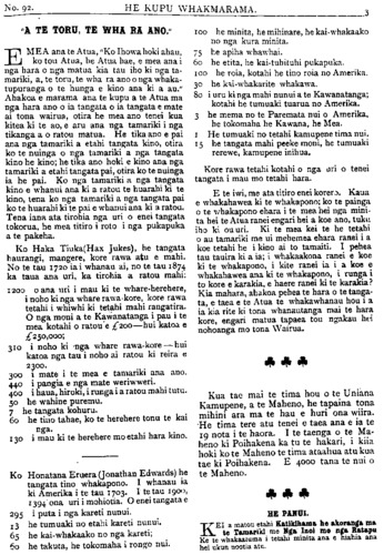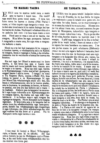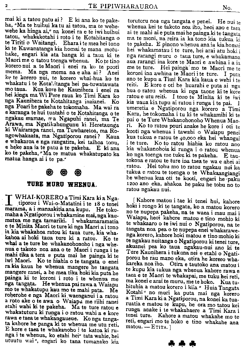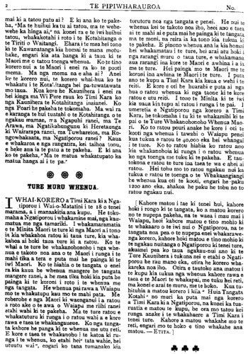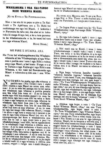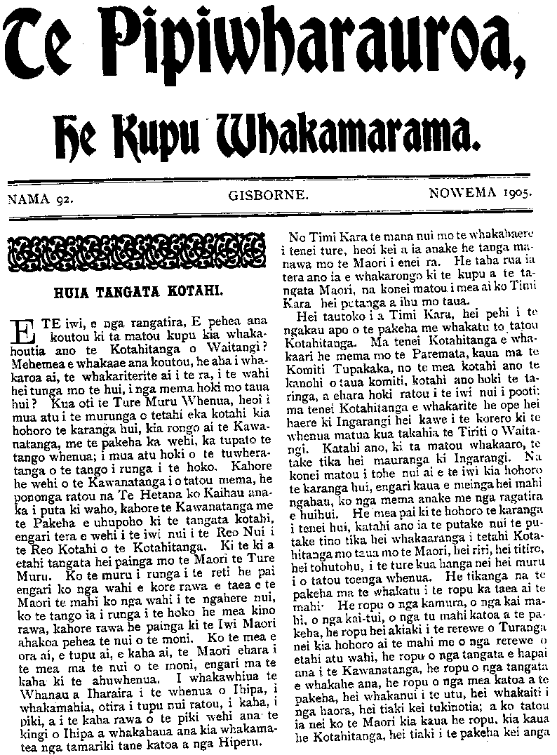 Te Pipiwharauroa, he Kupu Whakamarama NAMA 92. NOWEMA 1905. HUIA TANGATA KOTAHI. ETE iwi, e nga rangatira, E pehea ana koutou ki ta matou kupu kia whaka- houtia ano te Kotahitanga o Waitangi? Mehemea e whakaae ana koutou, he aha i wha- karoa ai, te whakariterite ai i te ra, i te wahi hei tunga mo te hui, i nga mema hoki mo taua hui? Kua oti te Ture Muru Whenua, heoi i mua atu i te murunga o tetahi eka kotahi kia hohoro te karanga hui, kia rongo ai te Kawa- natanga, me te pakeha ka wehi, ka tupato te tango whenua; i mua atu hoki o te tuwhera- tanga o te tango i runga i te hoko. Kahore he wehi o te Kawanatanga i o tatou mema, he pononga ratou na Te Hetana ko Kaihau ana ka i puta ki waho, kahore te Kawanatanga me te Pakeha e uhupoho ki te tangata kotahi, engari tera e wehi i te iwi nui i te Reo Nui i te Reo Kotahi o te Kotahitanga. Ki te ki a etahi tangata hei painga mo te Maori te Ture Muru. Ko te muru i runga i te reti he pai engari ko nga wahi e kore rawa e taea e te Maori te mahi ko nga wahi i te ngahere nui, ko te tango ia i runga i te hoko he mea kino rawa, kahore rawa he painga ki te Iwi Maori ahakoa pehea te nui o te moni. Ko te mea e ora ai, e tupu ai, e kaha ai, te Maori ehara i te mea ma te nui o te moni, engari ma te kaha ki te ahuwhenua. I whakawhiua te Whanaua Iharaira i te whenua o Ihipa, i whakamahia, otira i tupu nui ratou, i kaha, i piki, a i te kaha rawa o te piki wehi ana te kingi o Ihipa a whakahaua ana kia whakama- tea nga tamariki tane katoa a nga Hiperu. No Timi Kara te mana nui mo te whakahaere i tenei ture, heoi kei a ia anake he tanga ma- nawa mo te Maori i enei ra. He taha rua ia tera ano ia e whakarongo ki te kupu a te ta- ngata Maori, na konei matou i mea ai ko Timi Kara hei putanga a ihu mo taua. Hei tautoko i a Timi Kara, hei pehi i te ngakau apo o te pakeha me whakatu to tatou Kotahitanga. Ma tenei Kotahitanga e wha- kaari he mema mo te Paremata, kaua ma te Komiti Tupakaka, no te mea kotahi ano te kanohi o taua komiti, kotahi ano hoki te ta- ringa, a ehara hoki ratou i te iwi nui i pooti; ma tenei Kotahitanga e whakarite he ope hei haere ki Ingarangi hei kawe i te korero ki te whenua matua kua takahia te Tiriti o Waita- ngi. Katahi ano, ki ta matou whakaaro, te take tika hei mauranga ki Ingarangi. Na konei matou i tohe nui ai e te iwi kia hohoro te karanga hui, engari kaua e meinga hei mahi ngahau, ko nga mema anake me nga rangatira e huihui. He mea pai ki te hohoro te karanga i tenei hui, katahi ano ia te putake nui te pu- take tino tika hei whakaaranga i tetahi Kota- hitanga mo taua mo te Maori, hei riri, hei titiro, hei tohutohu, i te ture kua hanga nei hei muru i o tatou toenga whenua. He tikanga na te pakeha ma te whakatu i te ropu ka taea ai te mahi He ropu o nga kamura, o nga kai ma- hi, o nga kaitui, o nga tu mahi katoa a te pa- keha, he ropu hei akiaki i te rerewe o Turanga nei kia hohoro ai te mahi me o nga rerewe o etahi atu wahi, he ropu o nga tangata e hapai ana i te Kawanatanga, he ropu o nga tangata e whakahe ana, he ropu o nga mea katoa a te pakeha, hei whakanui i te utu, hei whakaiti i nga haora, hei tiaki kei tukinotia; a ko tatou ia nei ko te Maori kia kaua he ropu, kia kaua he Kotahitanga, hei tiaki i te pakeha kei anga