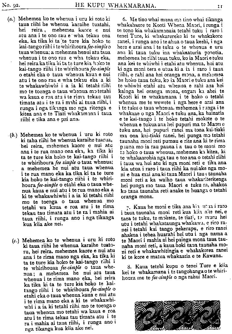 HE KUPU WHAKAMARAMA. (a.) Mehemea ko te whenua i uru ki roto ki taua nihi he whenua karaihe tuatahi, hei reira, mehemea kaore e nui atu ana i te ono rau e wha tekau ona eka, ka tika ki ta te ture kia hoko te kaitango nihi i te whirihoura fee simple o taua whenua; a mehemea he nui atu taua whenua i ta ono rau e wha tekau eka, hei reira ka tika ki ta te ture kia hoko te kaitango nihi i te whirihoura fee simple o etahi eka o taua whenua kaua e nui atu i te ono rau e wha tekau eka a ki te whakawhiwhi i a ia ki tetahi nihi mo te toenga o taua whenua mo tetahi wa kaua e roa atu i te rima tekau tau timata atu i te ra i mahi ai taua nihi, i runga i nga tikanga me nga ritenga e kitea ana e te Tiati whakamana i taua nihi e tika ana e pai ana. (b.) Mehemea ko te whenua i uru ki roto ki taha nihi he whenua karaihe tuarua, hei reira, mehemea kaore e nui atu ana i te rua mano ona eka, ka tika ki ta te ture kia hoko te kaitango nihi i te whirihoura fee simple o taua whenua; a mehemea he nui atu taua whenua i te rua mano eka ka tika ki ta te ture kia hoko te kaitango nihi i te whiri- houra fee simple o etahi eka o taua whe- nua kaua e nui atu i te rua mano eka a ki te whakawhiwhi i a ia ki tetahi nihi mo te toenga o taua whenua mo tetahi wa kaua e roa atu i te rima tekau tau timata atu i te ra i mahia ai taua nihi, i runga ano i nga tikanga kua kiia ake nei. (c.) Mehemea ko te whenua i uru ki roto ki taua nihi he whenua karaihe tuato- ru, hei reira, mehemea kaore e nui atu ana i te rima mano nga eka, ka tika ki ta te ture kia hoko te kaitango riihi i te whirihoura fee simple o taua whe- nua; a mehemea he nui atu taua whenua i te rima mano eka, hei reira ka tika ki ta te ture kia hoko te kai- tango nihi i te whirihoura fee simple o etahi eka o taua whenua kaua e nui atu i te rima mano eka a ki te whakawhi- whi i a ia ki tetahi nihi mo te toenga o taua whenua mo tetahi wa kaua e roa atu i te rima tekau tau timata atu i te ra i mahia ai taua nihi, i runga ano i nga tikanga kua kiia ake nei. 6. Me tino whai mana me tino whai tikanga whakahaere te Kooti Whena Maori, i runga i te tono kia whakamanaia tetahi tuku i raro i tenei Ture, ki whakarereke ki te whakakore ranei, i runga ano i te ahua o taua keehi, i nga here e arai ana i te tuku o te whenua e uru ana ki taua tuku ina whakaaturia ponotia, mehemea he nihi taua tuku, ko ia Maori e tuku ana kei te whiwhi i etahi atu whenua, hui atu ki nga moni tera e utua ki a ia i raro i taua nihi, e rahi ana hei oranga mona, a mehemea he hoko taua tuku, ko ia Maori e tuku ana kei te whiwhi etahi atu whenua e rahi ana hei kainga hei oranga mona, engari ka ahei te Kooti ki te whakamana i te hoko o tetahi whenua me te wewete i nga here e arai ana i te tuku o taua whenua, mehemea i runga i te whakaae o nga Maori e tuku ana, ka hainatia e te kaitango i te hoko tetahi mokete o te whenua e tukua hei pupuri ma te Maori e tuku ana, hei pupuri ranei ma tona kaitiaki ma ona kaitiaki ranei, hei punga mo tetahi taunaha moni reti pumau e rite ana ki te rima pauna mo ia rau pauna i a tau o te moni mo te hoko o taua whenua, mehemea ka kitea, ki te whakaarohia nga tau e toe ana o tetahi nihi i taua wa hui atu ki nga moni reti e tika ana kia utua i raro i taua nihi ka nui ake nga mo- ni e hua mai ana ki taua Maori i tau i taunaha moni reti a ka waiho taua whakariteritenga hei punga mo taua Maori e tuku ra, ahakoa ko taua taunaha reti anake te huanga o tetahi oranga mona. 7. Kaua he moni e tika ana kia utua i raro i taua taunaha moni reti kua kiia ake nei, e taea te tuku, te mokete, te tiati te muru hei utu i tetahi whakataunga whakawa, e riro ra- nei i tetahi kai tango pekerapu, e riro ranei ahakoa i tehea huarahi hei utu i nga nama a te Maori i mahia ai hei painga mona taua tau- naha moni reti, a kaua hoki taua taunaha mo- ni reti e whakawhitingia e whakakorea ranei ki te kore e matua whakaatia e te Kawana. 8. Kaua tetehi kupu o tenei Ture e kiia kei te whakamana i te tangohanga o te whiri- houra me te fee simple o nga rahui Maori.