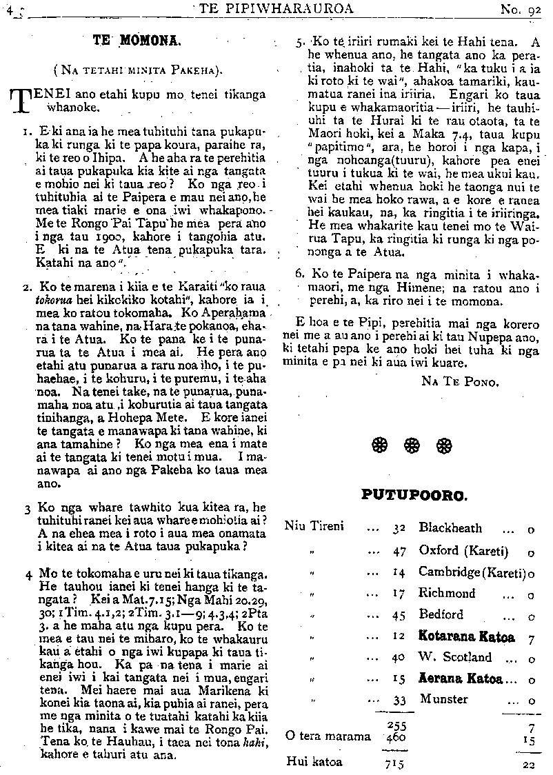 TE PIPIWHARAUROA No. 92 TE MOMONA. ( NA TETAHI MINITA PAKEHA). Tenei ano etahi kupu mo. tenei tikanga whanoke. ... 1. E ki ana ia he mea tuhituhi tana pukapu- ka ki runga ki te papa koura, paraihe ra, ki te reo o Ihipa. A he aha ra te perehitia ai taua pukapuka kia kite ai nga tangata e mohio nei ki taua reo? Ko nga reoi tuhituhia ai te Paipera e mau nei ano, he mea tiaki marie e ona iwi whakapono. - Me te Rongo Pai Tapu mea pera ano i nga tau 1900, kahore i tangohia atu. E ki na te Atua tena pukapuka tara. Katahi na ano". • 2. Ko te marena i kiia e te Karaiti "ko raua tokorua hei kikokiko kotahi", kahore ia i. mea ko ratou tokomaha. Ko Aperahama na tana wahine, na Hara te pokanoa, eha- ra i te Atua. Ko te pana ke i te puna- rua ta te Atua i mea ai. He pera ano etahi atu punarua a raru noa iho, i te pu- haehae, i te kohuru, i te puremu, i te aha noa. Na tenei take, na te punarua, puna- maha noa atu, i kohurutia ai taua tangata tinihanga, a Hohepa Mete. E kore ianei te tangata e manawapa ki tana wahine, ki ana tamahine? Ko nga mea ena i mate ai te tangata ki tenei motu i mua. I ma- nawapa ai ano nga Pakeha ko taua mea ano. 3 Ko nga whare tawhito kua kitea ra, he tuhituhi ranei kei aua whare e mohiotia ai? A na ehea mea i roto i aua mea onamata i kitea ai na te Atua taua pukapuka? 4 Mo te tokomaha e uru nei ki taua tikanga. He tauhou ianei ki tenei hanga ki te ta- ngata? Kei a Ma.7.15; Nga Mahi 20.29, 30;1Tim. 4.1,2;Tim. 3.1—9; 4.3,4;2Pta 3. a he maha atu nga kupu pera. Ko te mea e tau nei te miharo, ko te whakauru kau a etahi o nga iwi kupapa ki taua ti- kanga hou. Ka pa na tena i marie ai enei iwi i kai tangata nei i mua, engari tena. Mei haere mai aua Marikena ki konei kia taona ai, kia puhia ai ranei, pera me nga minita o te tuatahi katahi ka kiia he tika, nana i kawe mai te Rongo Pai. Tena ko. te Hauhau, i taea nei tona hahi, kahore e tahuri atu ana. 5. Ko te. iriiri rumaki kei te Hahi tena. A he whenua ano, he tangata ano ka pera- tia, inahoki ta te Hahi, " ka tuku i a ia ki roto ki te wai", ahakoa tamariki, kau- matua ranei ina iriiria. Engari ko taua kupu e whakamaoritia — iriiri, he tauhi- uhi ta te Hurai ki te rau otaota, ta te Maori hoki, kei a Maka 7 •4,taua kupu " papitimo", ara, he horoi i nga kapa, i nga nohoanga (tuuru), kahore pea enei tuuru i tukua ki te wai, he mea ukui kau. Kei etahi whenua hoki he taonga nui te wai he mea hoko rawa, a e kore e ranea hei kaukau, na, ka ringitia i te iriiringa. He mea whakarite kau tenei mo te Wai- rua Tapu, ka ringitia ki runga ki nga po- nonga a te Atua. 6. Ko te Paipera na nga minita i whaka- maori, me nga Himene; na ratou ano i perehi, a, ka riro nei i te momona. E hoa e te Pipi, perehitia mai nga korero nei me a au ano i perehi ai ki tau Nupepa ano, ki tetahi pepa ke ano hoki hei tuha ki nga minita e pa nei ki aua iwi kuare. NA TE PONO. PUTUPOORO. Niu Tireni ... 32 Blackheath ... o ... 47 Oxford (Kareti) o ... 14 Cambridge (Kareti) o " ... 17 Richmond ( ... O "... 45 Bedford ...0 " ... 12 Kotarana Katoa ... 7 ... 40 W. Scotland ... 15 Aerana Katoa ... o ... 33 Munster ... O 255 O tera marama 460 Hui katoa 715 15 22