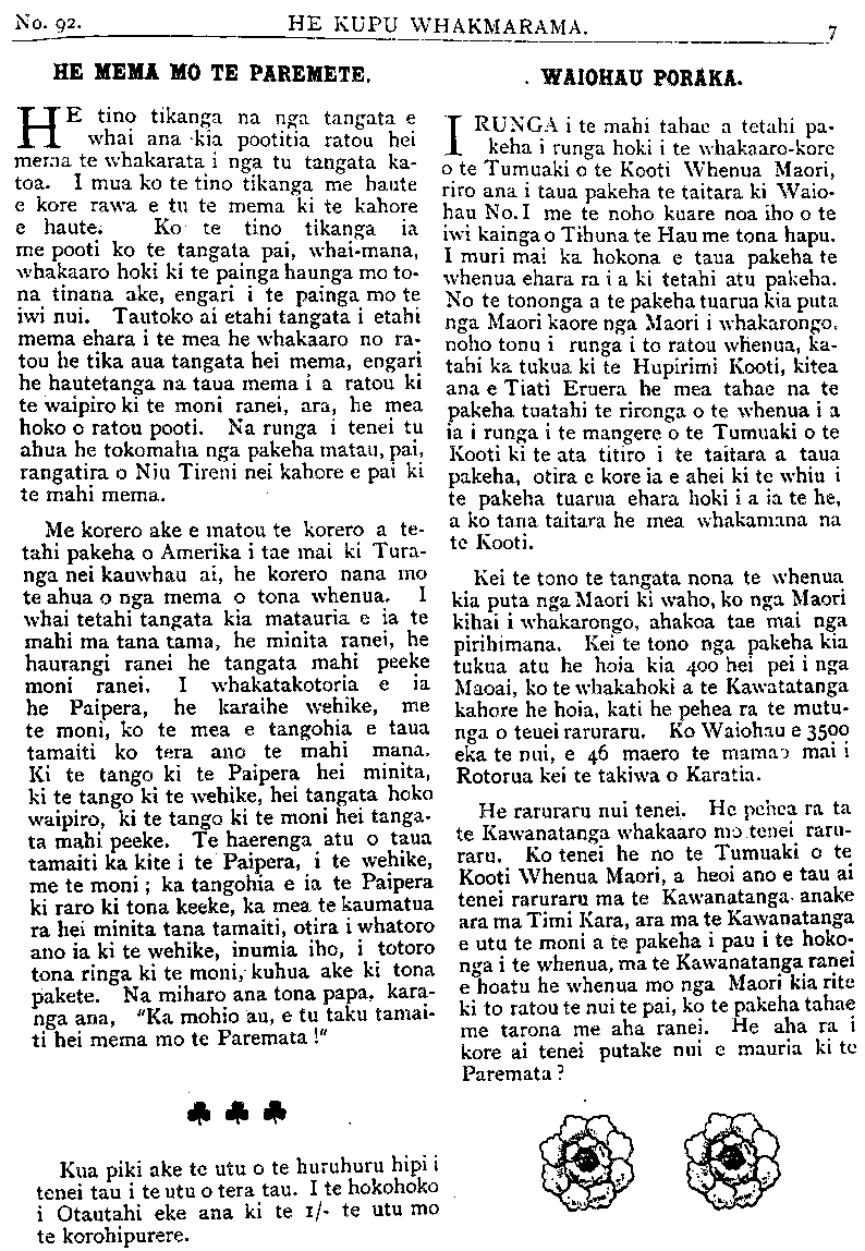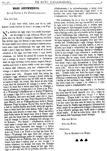 No. 92. HE KUPU WHAKAMARAMA. MAHI AHUWHENUA. Ki TE ETITA O TE PIPIWHARAUROA. Kia ora koe. A kia tino whai kaha koe ki te tuhi katoa i enei korero ki roto i te pepa o te Pipi. Na matou na nga ropu kua mahi kamupe- ne ki runga ki nga whenua Maori kua puta nei i te Kooti i runga o Akarana, kia kite kia mohio nga iwi katoa o nga motu e rua nei ki tenei mahi mo o tatou whenua e takoto raru- raru ana i nga kootitanga, me nga tini moni hoki i pau i nga tau katoa i timata ai te kooti whenua e hia nga miriona moni i nga kooti whenua, no konei he penei ki a tatou ki nga iwi o runga o raro o waenganui o Aotearoa kati ra nga miriona moni mana engari kia pe- neitia ano hoki e tatou etahi moni mo runga i o tatou ake whenua, ara hei whakamahi ki runga i o tatou whenua i roto i nga tau katoa e haere mai nei. Engari hoki kia kaua he mokete i nga whenua i runga i tenei mahi ka tino tika, engari rawa ma te ruhi ma te mahi a uaua e rapu he moni, kia kaua ai ano hoki e pa mai he raruraru ki runga i o tatou whe. aua i te mea kei a tatou ano hoki te ritenga o tatou whenua, i runga ano i te Ture o te Tiri. ti o Waitangi i hipokina nei e Kuini Wikitoria ki runga i nga iwi e rua ki te iwi Maori me te iwi Pakeha, kei raro nei hoki enei iwi e rua i tona mana, ara me nga Ture Kaunihera Whe- nua Maori, me te Pukapuka ano hoki a Hemi Henare Popi te ingoa, Ko te Ora mo te Maori, a kei te mohio katoa ano hoki tatou ki nga ko- rero o enei ture kei roto katoa hoki i nga pu- kapuka ona koiero e mau ana. Kati me titiro ano hoki tatou ki tenei ture hou e haere mai nei, ara ko taua ture he whakanohonoho teki- ona ki runga i o tatou whenua hei oranga mo te Koroni. No konei i whakaaroa nuitia ai enei take i runga ake nei hei arai atu i tenei ture kino tino taimaha mo runga i o tatou whenua, hore kau nei ano hoki tatou i takahi noa i te Ture o te Tiriti e tu mai na tona Ko- hatu i Waitangi me nga ture kei runga hei whakamaharatanga pono ki runga i nga iwi e rua Maori me te Pakeha, hoi he aha ano hoki tenei ture kino i tukua mai ai mo runga i o tatou whenua, no konei me rapu he tikanga nui he tikanga tino pai, kaua ia hei nga tika- nga e ahu atu ana ki te pohehe, kia tika ai hei whakamama i te taimahatanga o tenei ture kino, ara me tango tonu atu i nga mahi a te komiti me tona ropu mahi ahuwhenua, ka whakaaturia i raro iho nei. Me whakaatu he ra e hui ai nga tangata katoa tane, wahine, me nga i tamariki i uru nei ki nga wahi o nga whenua, ara e wehea ana ki nga hapu ki nga tangata ranei, me nga whe- nua hoki a te tokomaha o roto i te rohe potae o ratou kainga noho, ka whiriwhiri ai he tangata e tenei huihuinga kia tokorima, me tapa he ingoa mo aua tangata he komiti, engari hoki ko aua tangata hei nga tangata tino pai tino mohio hei whakahaere i nga ritenga katoa o nga whenua e tukua ana kia mahia, a ma te komiti ano hoki e whiriwhiri he ropu tangata mona hei mai i ana tikanga katoa e whakata- koto ai mo runga i nga whenua e mahia ana. Ko te ritenga o tenei ropu me tapa he ingoa mo ratou, Ko te ropu mahi ahuwhenua a te komiti. Me timata tonu te ahua o nga tangata mo tenei ropu i nga kaumatua e whai kaha ana me nga tamariki hoki kua whai kaha ki te mau toki. Ko te tini o nga tangata mo tenei mahi kia rua tekau ahu atu ki runga ka tino pai. Tetahi hoki me kohi he moni e nga ta- ngata katoa e whai paanga ana ki runga i nga whenua e mahia ana, ko te ritenga o tenei moni i kohia ai hei awhina i nga mahi a te komiti me tona ropu mo runga i te whenua, i nga whenua ranei e whakamahia ana. Ko nga korero enei mo tenei hui. ara he tu- ku tonu atu ki tenei komiti me tona ropu te whakahaere me te mahi mo runga i o tatou whenua. Ehara hoki i te mea he tionga hou tenei, kua whakahaerea noatia atu tenei mahi i te tau 1900 tae noa mai ki tenei ra, otira ko Kuao raua ko Kaka nga tangata i timataria ai tenei mahi ki te takiwa ki runga o Akarana nei a kua whiwhi painga ano hoki raua o runga i tenei mahi. A kei te tohe tonu raua ki nga iwi katoa kia hapainga tenei taonga. Kia ora KUAO, Kia ora KAKA, Heoi ano, Na te Komiti o te Ropu.