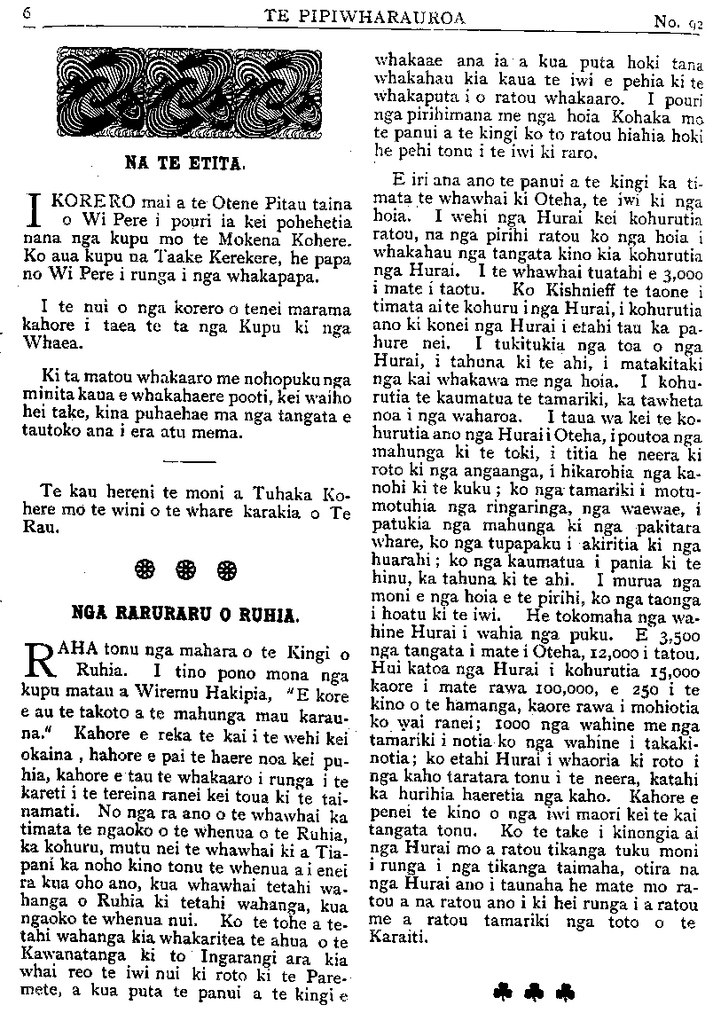 6 TE PIPIWHARAUROA No. 92 NA TE ETITA. I KORE RO mai a te Otene Pitau taina o Wi Pere i pouri ia kei pohehetia nana nga kupu mo te Mokena Kohere. Ko aua kupu na Taake Kerekere, he papa no Wi Pere i runga i nga whakapapa. I te nui o nga korero o tenei marama kahore i taea te ta nga Kupu ki nga Whaea. Ki ta matou whakaaro me nohopuku nga minita kaua e whakahaere pooti, kei waiho hei take, kina puhaehae ma nga tangata e tautoko ana i era atu mema. Te kau hereni te moni a Tuhaka Ko- here mo te wini o te whare karakia o Te Rau. NGA RARURARU O RUHIA. RAHA tonu nga mahara o te Kingi o Ruhia. I tino pono mona nga kupu matau a Wiremu Hakipia, "E kore e au te takoto a te mahunga mau karau- na." Kahore e reka te kai i te wehi kei okaina, hahore e pai te haere noa kei pu- hia, kahore e tau te whakaaro i runga i te kareti i te tereina ranei kei toua ki te tai-namati. No nga ra ano o te whawhai ka timata te ngaoko o te whenua o te Ruhia, ka kohuru, mutu nei te whawhai ki a Tia- pani ka noho kino tonu te whenua a i enei ra kua oho ano, kua whawhai tetahi wa- hanga o Ruhia ki tetahi wahanga, kua ngaoko te whenua nui. Ko te tohe a te- tahi wahanga kia whakaritea te ahua o te Kawanatanga ki to Ingarangi ara kia whai reo te iwi nui ki roto ki te Pare- mete, a kua puta te panui a te kingi e whakaae ana ia a kua puta hoki tana whakahau kia kaua te iwi e pehia ki te whakaputa i o ratou whakaaro. I pouri nga pirihimana me nga hoia Kohaka mo te panui a te kingi ko to ratou hiahia hoki he pehi tonu i te iwi ki raro. E iri ana ano te panui a te kingi ka ti- mata te whawhai ki Oteha, te iwi ki nga hoia. I wehi nga Hurai kei kohurutia ratou, na nga pirihi ratou ko nga hoia i whakahau nga tangata kino kia kohurutia nga Hurai. I te whawhai tuatahi e 3, 000 i mate i taotu. Ko Kishnieff te taone i timata ai te kohuru inga Hurai, i kohurutia ano ki konei nga Hurai i etahi tau ka pa- hure nei. I tukitukia nga toa o nga Hurai, i tahuna ki te ahi, i matakitaki nga kai whakawa me nga hoia. I kohu- rutia te kaumatua te tamariki, ka tawheta noa i nga waharoa. I taua wa kei te ko- hurutia ano nga Huraii Oteha, i poutoa nga mahunga ki te toki, i titia he neera ki roto ki nga angaanga, i hikarohia nga ka- nohi ki te kuku; ko nga tamariki i motu- motuhia nga ringaringa, nga waewae, i patukia nga mahunga ki nga pakitara whare, ko nga tupapaku i akiritia ki nga huarahi; ko nga kaumatua i pama ki te hinu, ka tahuna ki te ahi. I murua nga moni e nga hoia e te pirihi, ko nga taonga i hoatu ki te iwi. He tokomaha nga wa- hine Hurai i wahia nga puku. E 3,500 nga tangata i mate i Oteha, 12, 000 i tatou. Hui katoa nga Hurai i kohurutia 15, 000 kaore i mate rawa 100, 000, e 250 i te kino o te hamanga, kaore rawa i mohiotia ko wai ranei; 1000 nga wahine me nga tamariki i notia ko nga wahine i takaki- notia; ko etahi Hurai i whaoria ki roto i nga kaho taratara tonu i te neera, katahi ka hurihia haeretia nga kaho. Kahore e penei te kino o nga iwi maori kei te kai tangata tonu. Ko te take i kinongia ai nga Hurai mo a ratou tikanga tuku moni i runga i nga tikanga taimaha, otira na nga Hurai ano i taunaha he mate mo ra- tou a na ratou ano i ki hei runga i a ratou me a ratou tamariki nga toto o te Karaiti.