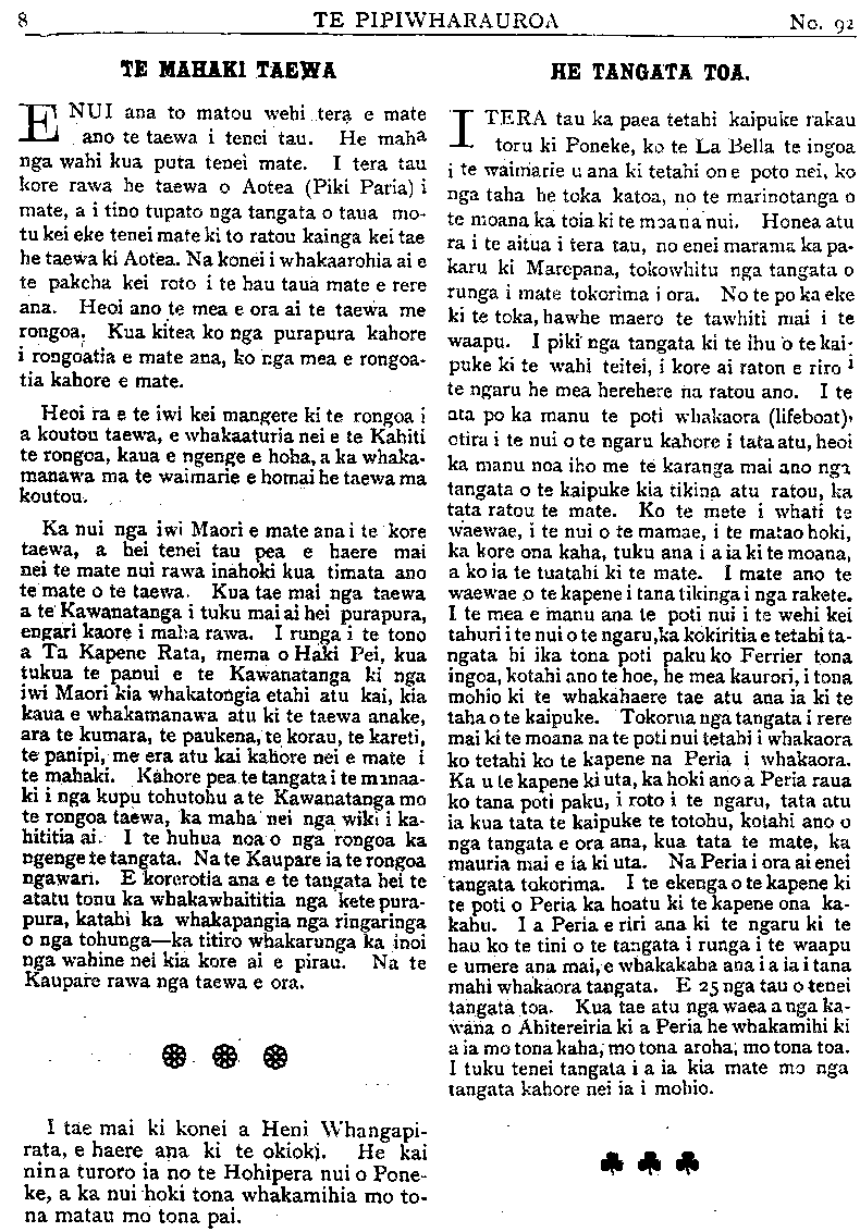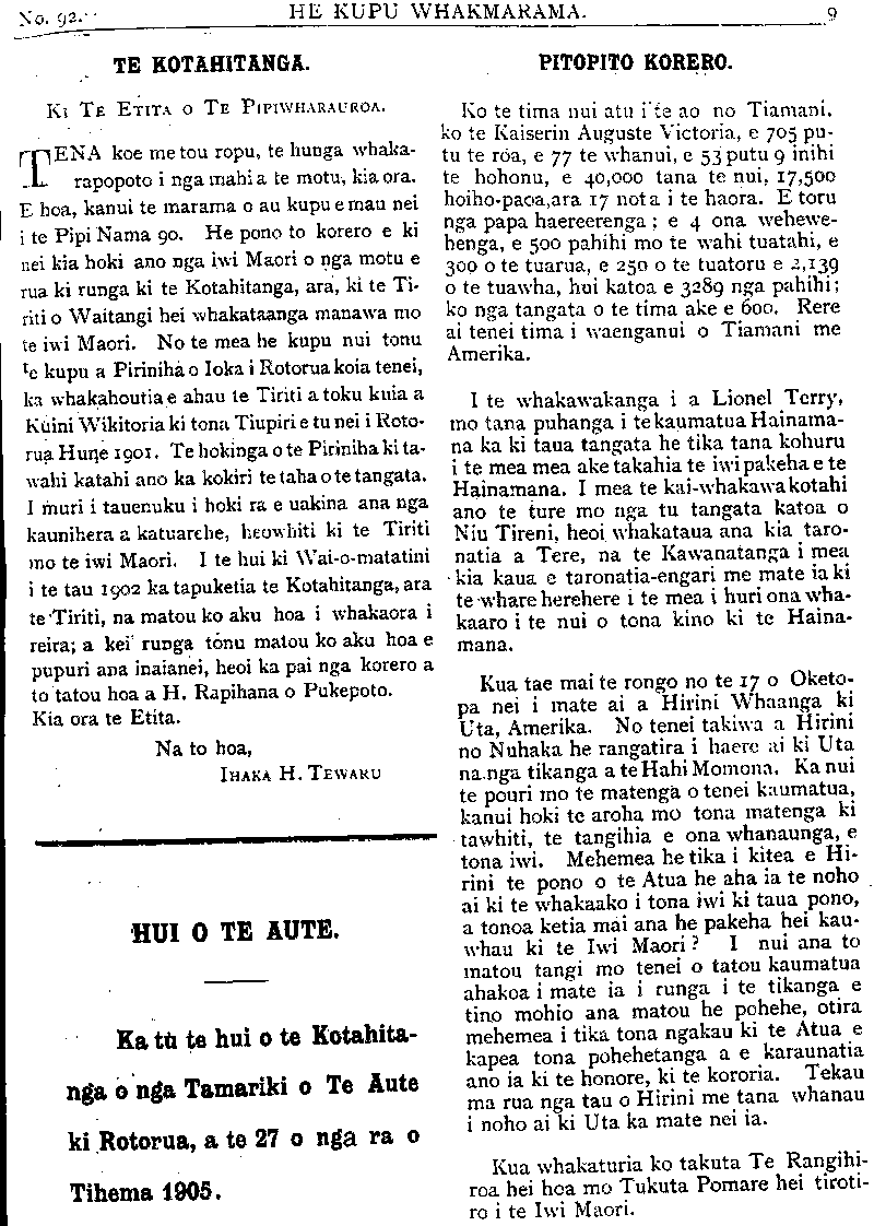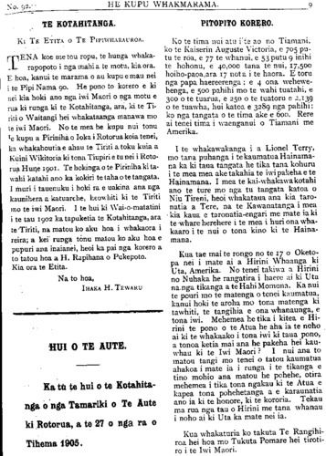No. 92 HE KUPU WHAKAMARAMA. 9 TE KOTAHITANGA. Ki TE ETITA o TE PIPIWHARAUROA. TENA koe me tou ropu, te hunga whaka- rapopoto i nga mahi a te motu, kia ora. E hoa, kanui te marama o au kupu e mau nei i te Pipi Nama 90. He pono to korero e ki nei kia hoki ano nga iwi Maori o nga motu e rua ki runga ki te Kotahitanga, ara, ki te Ti- riti o Waitangi hei whakataanga manawa mo te iwi Maori. No te mea he kupu nui tonu kupu a Piriniha o Ioka i Rotorua koia tenei, ka whakahoutia e ahau te Tiriti a toku kuia a Kuini Wikitoria ki tona Tiupiri e tu nei i Roto- rua Hune 1901 Te hokinga o te Piriniha ki ta- wahi katahi ano ka kokiri te taha o te tangata. I muri i tauenuku i hoki ra e uakina ana nga kaunihera a katuarehe, heowhiti ki te Tiriti mo te iwi Maori. I te hui ki Wai o matatini i te tau 1902 ka tapuketia te Kotahitanga, ara te Tiriti, na matou ko aku hoa i whakaora i reira; a kei runga tonu matou ko aku hoa e pupuri ana inaianei, heoi ka pai nga korero a to tatou hoa a H. Rapihana o Pukepoto. Kia ora te Etita. Na to hoa, IHAKA H. TEWARU HUI O TE AUTE. Ka tu te hui o te Kotahita- nga o nga Tamariki o Te Aute ki Rotorua, a te 27 o nga ra o Tihema 1905. PITOPITO KORERO. Ko te tima nui atu i te ao no Tiamani,. ko te Kaiserin Auguste Victoria, e 705 pu- tu te roa, e 77 te whanui, e 53 putu 9 inihi te hohonu, e 40,000 tana te nui, 17, 500 hoiho-paoa, ara 17 no te i te haora. E toru nga papa haereerenga; e 4 ona wehewe- henga, e 500 pahihi mo te wahi tuatahi, e 300 o te tuarua, e 250 o te tuatoru e 2, 139 o te tuawha, hui katoa e 3289 nga pahihi; ko nga tangata o te tima ake e 600. Rere ai tenei tima i waenganui o Tiamani, me Amerika. I te whakawakanga i a Lionel Terry, mo tana puhanga i te kaumatua Hainama- na ka ki taua tangata he tika tana kohuru i te mea mea ake takahia te iwi pakeha e te Hainamana. I mea te kaiwhakawa kotahi ano te ture mo nga tu tangata katoa o Niu Tireni, heoi. whakataua ana kia taro- natia a Tere, na te Kawatatanga i mea • kia kaua e taro natia engari me mate ia ki te whare herehere i te mea i huri ona wha- kaaro i te nui o tona kino ki te Haina- mana. Kua tae mai te rongo no te 17 o Oketo- pa nei i mate ai a Hirini Whaanga ki Uta, Amerika. No tenei takiwa a Hirini no Nuhaka he rangatira i haere ai ki Uta na nga tikanga a te Hahi Momona. Ka nui te pouri mo te matenga o tenei kaumatua, kanui hoki te aroha mo tona matenga ki tawhiti, te tangihia e ona whanaunga, e tona iwi. Mehemea he tika i kitea e Hi- rini te pono o te Atua he aha ia te noho ai ki te whakaako i tona iwi ki taua pono, a tonoa ketia mai ana he pakeha hei kau- whau ki te Iwi Maori? I nui ana to matou tangi mo tenei o tatou kaumatua ahakoa i mate ia i runga i te tikanga e tino mohio ana matou he pohehe, otira mehemea i tika tona ngakau ki te Atua e kapea tona pohehetanga a e karaunatia ano ia ki te honore, ki te kororia. Tekau ma rua nga tau o Hirini me tana whanau i noho ai ki Uta ka mate nei ia. Kua whakaturia ko takuta Te Rangihi- roa hei hoa mo Tukuta Pomare hei tiroti- ro i te Iwi Maori.
