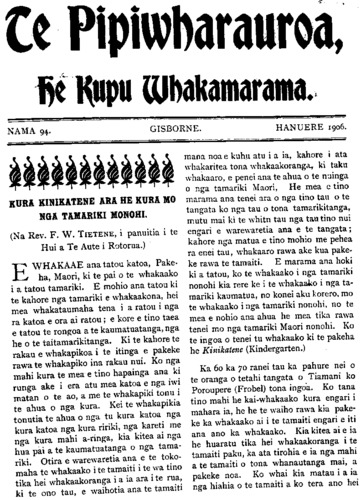 Te Pipiwharauroa he Kupu Whakamarama. NAMA 94- HANUERE 1906. KURA KINIKATENE ARA HE KURA MO NGA TAMARIKI MONOHI. (Na Rev. F. W TIATENE, i panuitia i te Hui a Te Aute i Rotorua.) E WHAKAAE ana tatou katoa, Pake- ha, Maori, ki te pai o te whakaako i a tatou tamariki. E mohio ana tatou ki te kahore nga tamariki e whakaakona, hei mea whakataumata tena i a matou i nga ra katoa e ora ai matou; e kore e tino taea e tatou te rongoa a te kaumatuatanga, nga he o te taitamarikitanga. Ki te kahore te rakau e whakapikoa i te itinga e pakeke rawa te whakapiko ina rakau nui. Ko nga mahi kura te mea e tino hapainga ana ki runga ake i era atu mea katoa e nga iwi matau o te ao, a me te whakapiki tonu i te ahua o nga kura. Kei te whakapikia tonutia te ahua o nga tu kura katoa nga kura katoa nga kura ririki, nga kareti me nga kura mahi a-ringa, kia kitea ai nga hua pai a te kaumatuatanga o nga tama riki. Otira e warewaretia ana e te toko- maha te whakaako i te tamaiti i te wa tino tika hei whakaakoranga i a ia ara i te rua, ki te ono tau, e waihotia ana te tamaiti mana noa e kuhu atu i a ia, kahore i ata whakaritea tona whakaakoranga, ki taku whakaaro, e penei ana te ahua o te nuinga o nga tamariki Maori, He mea e tino marama ana tenei ara o nga tino tau o te tangata ko nga tau o tona tamarikitanga, mutu mai ki te whitu tau nga tau tino nui engari e warewaretia ana e te tangata; kahore nga matua e tino mohio me pehea ra enei tau, whakaaro rawa ake kua pake- ke rawa te tamaiti. E marama ana hoki ki a tatou, ko te whakaako i nga tamariki nonohi kia rere ke i te whakaako i nga tamariki kaumatua, no konei aku korero, mo te whakaako i nga tamariki nonohi, no te mea e nohoia ana ahua he mea tika rawa tenei mo nga tamariki Maori nonohi. Ko te ingoa o tenei tu whakaako ki te pakeha he Kinikatene (Kindergarten.) Ka 60 ka 70 ranei tau ka pahure nei o te oranga o tetahi tangata o Tiamana ko Poroupere (Frobel) tona ingoa. Ko tana tino mahi he kai kaiwhakaako kura engari i mahara ia, he he te waiho rawa kia pake- ke ka whakaako ai i te tamaiti engari e iti ana ano ka whakaako. Kia kitea ai e ia he huaratu tika hei whakaakoranga i te tamaiti paku, ka ata tirohia e ia nga mahi a te tamaiti o tona whanautanga mai, a pakeke noa. Ko whai kia matau i a ia nga hiahia o te tamaiti a ko tera ano hei