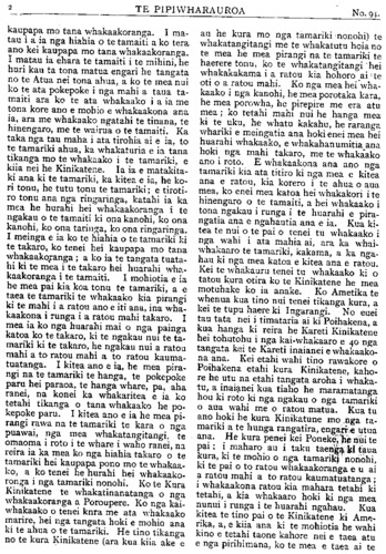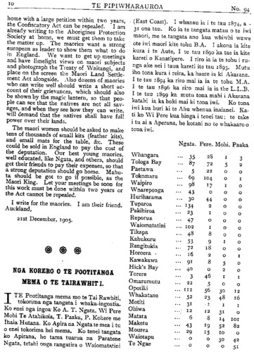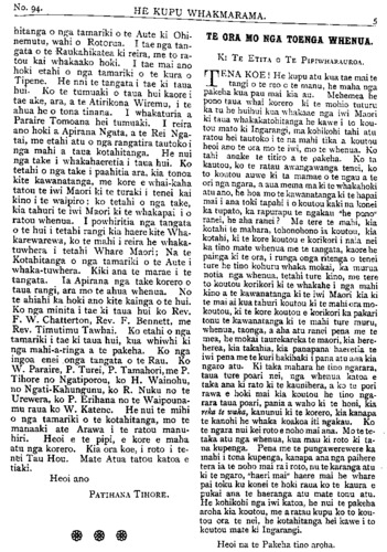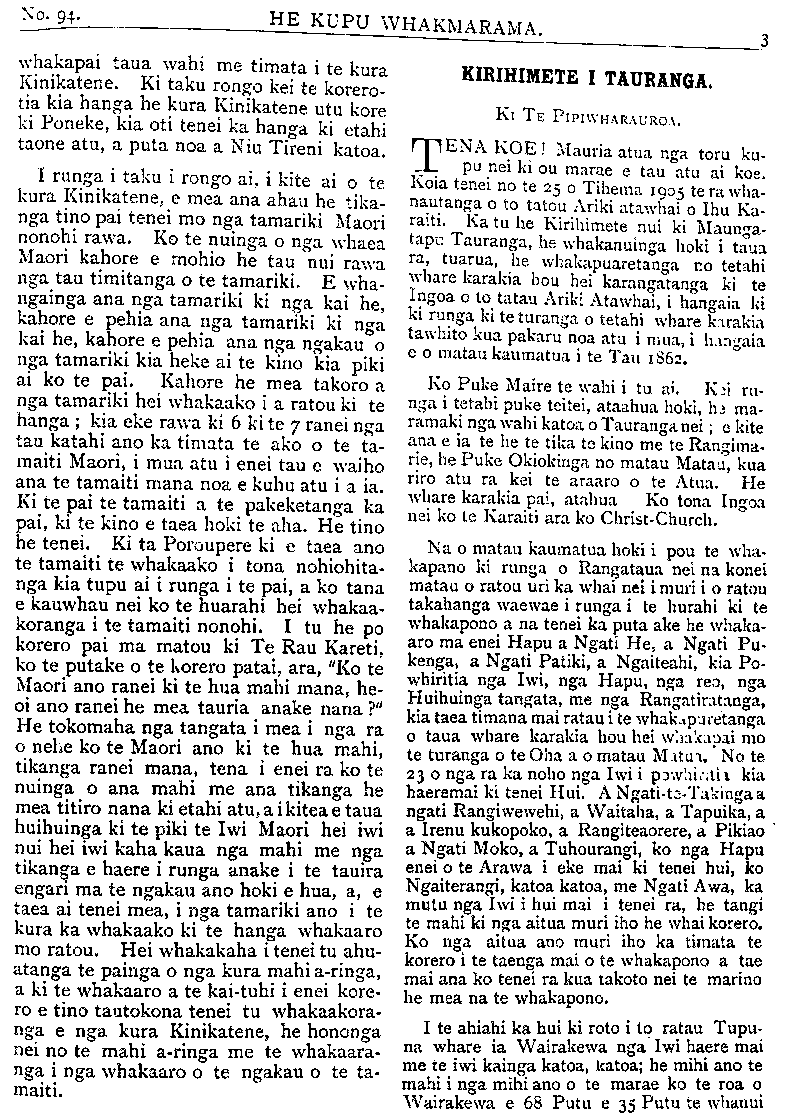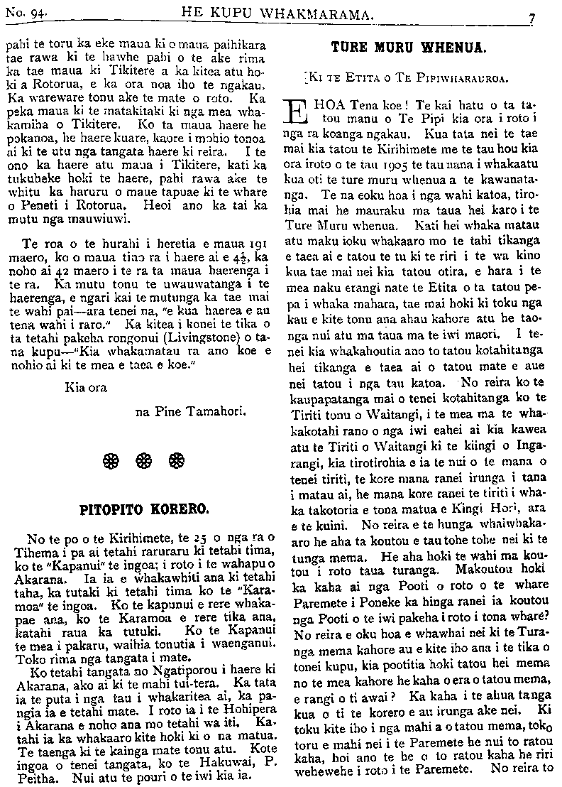 TE PIPIWHARAUROA ratou he, e rangi ahakoa koutou te hunga e whawhai nei kia ana tuianga ko to koutou ahua tera e kore e rereke, e rangi mehemea he tino rapu i te tahi ora mo tatou, tahuri mai tatou kite whakaaro tikanga kia whaka- houtia to tatou kotahitanga. Waiho atu o tatou hoa i te Paremete, me kaha hoki tatou ki te hapai i tenei tikanga a tatou, he awhina- atu ia ratou i roto i te Paremete, kia whaika- ha ai ratou i te aroaro o te Paremete, haunga ano te whakawhitiki i nga ringa. E rua enei take pai katoa mo te kotahitanga o nga iwi Maori ki te hapai i te kupu kotahi a nga iwi o nga motu e rua nei pera ano mete tutu nga- rahu kotahi ano kupu o te hari e whakahua ai ahakoa 500 tangata kotahi ano takotoranga nga o nga kupu. Ki te rangirua nga kupu o te ngarahu kua he katoa te hapai o nga wae- wae. No reira hoki e hoa ma ki te kotahi o tatou reo ki te whiu i te kupu ki te Paremete ka rawe, ki te rangirua nga reo o te iwi Maori ka kino Kaore e reka ki te whakarongo a te iwi matauranga a te pakeha, no reira e aku hoa aroha i roto i te ariki, tena whakanui- huia mai o tatou whakaaro kia kotahi. Wha karerea atu te mauahara, te whakapehapeha, to whakai, te hae, te kohuru, te totohe TITI, te wehewehenga, he kai kohuru tikanga hoki enei. E rangi kakahuria iho ko te ngakau tohu tangata, ko te nga kau mahaki, ko te manawanui, hei kakahu mo tatou kia takatu ai to tatou kotahitanga i te wa kiano nga pakiaka o te ture muru i o tatou whenua e tupu noa ki roto i o tatou oneone e toe nei kia tatou inaianei. Kati e hoa ma ko tenei take he tino take taimaha, kati ko te mea e mama ai me whakaiti te timatanga o tenei take, kati tera atu taku kupu mo tenei takekei mu- ri atu i tenei Panuiaku. Kati kia ora tatou katoa mo nga mahi pai mo tatou mo nga iwi Maori e noho nei i tenei ao kino e ai ko ta te Karaipiture. Mehemea he ku pu kei roto o enei korero e kaka ai te ngakau o nga kai korero me unu atu te kupu e pena ai te ahua o tatou ngakau. Hoi ano Na HEREPETE RAPIHANA. Pukepoto, Mongonui, Tihema 18, 1905. HE RETA MAI NO TARANAKI. Ki TE ETITA O TE PIPIWHARAUROA. E MANU tena koe, te kai ami mai i nga korero o te ao, a te kai tiri atu hoki i nga korero ki nga wahi e tae ai koe, ki a ora. E manu, tenei hoki enei kupu ruarua nei hei mau atu mau ki nga marae e tae ai koe, he kupu tikanga kore, engari, he mea tauhou ki tenei tangata i a au nei. I te 30 o Noema nei 1905 ara te ra e karangatia nei ko te ra o Anaru. Ka haere ahau ki tetahi kainga e kiia nei tona ingoa ko Stoney River, ki te Maori ko Whangatahua, Taranaki. Ko te take o taku haere ki taua kainga, he haere ki te karakia, ko te rua tenei o aku toenga ki taua kainga, ko taku taenga, kua mau ki te Puapua ki te whakangungu rakau, ara ki te hoari a te Wairua a tae atu au e ono nga tangata o taua kainga, tokotoru nga kauma- tua, tokotoru nga tamariki, nga mea kauma- tua nei. Kotahi he kaumatua rawa, e mate ana, ko te mate he hitu e kore e haereere, ko tona nohanga kei te Pirana tonu o te whare, ko tetahi he taikuia nei, ko tetahi he mea ahua tamariki, tenei taima a e tata ana hoki ka po, a i te ahiahi ka maoa mai te kai, ka kara- ngatia mai te manuhiri nei ki te kai. Ka mutu te taha ki te kai, ka huri ki roto i nga whare, ka noho ko maua ko te tangata ahua tamariki he whare ke, ko te kaumatua me te taikuia me nga tamariki he whare ke, he roa te taima i korero noa iho ai maua ka ki mai te tangata ra ki a au kei te hiahia te kauma- tua ra ki a koe hei hoa korero mona i nga mea o tona kainga, kaiahi ahua ka ki atu ki a i a e pai ana me haere tatou ki reira karakia ai, mehemea ra e pai ki te karakia a ka ki mai te tangata ra e pai ana, katahi maua ka haere, a, ia maua hoki ka timata te haere atu ka karanga mai te kaumatua ra kia haere atu maua, tae atu maua e tika ana te noho, ano e rite ana mo te karakia a kua koa hoki ahau, e 5 pea meneti. Katahi ahau ka ki atu, me karakia tatou mehemea ra e pai, i enei kupu ano, kua ki mai te kaumatua ra. E hoa, kia ora, na whakarongo mai ki taku kupu, hoi ano taku pirangi kia koe. (i) Ko to tinana,. (2) Ko to tauhoutanga. (3) Ko to Maorita-