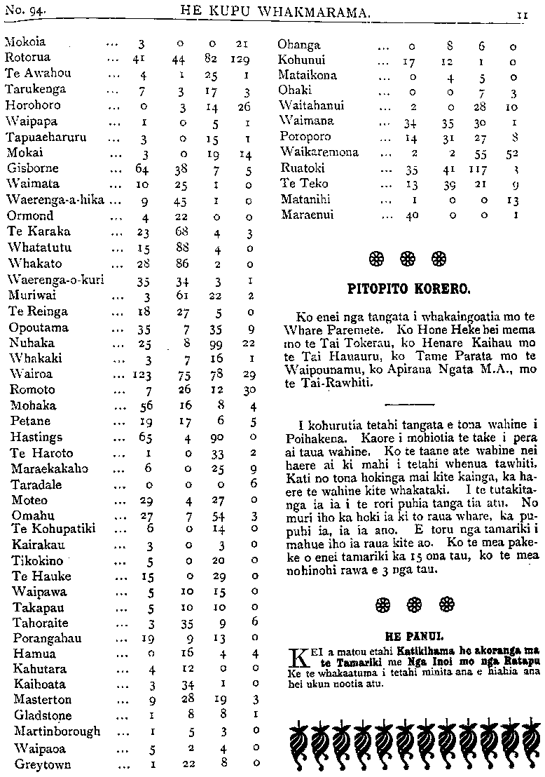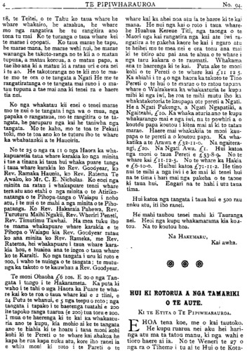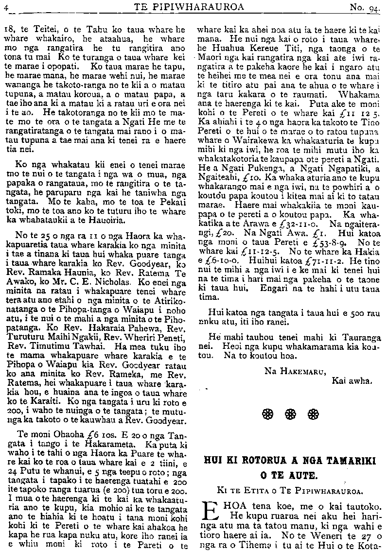 TE PIPIWHARAUROA 18, te Teitei, o te Tahu ko taua whare he whare whakairo, he ataahua, he whare mo nga rangatira he tu rangatira ano tona tu mai Ko te turanga o taua whare kei te marae i opopoti, Ko taua marae he tapu, he marae mana, he marae wehi nui, he marae wananga he takotoranga no te kii a o matau tupuna, a matau koroua, a o matau papa, a tae iho ana ki a matau ki a ratau uri e ora nei i te ao. He takotoranga no te kii mo te ma- te mo te ora o te tangata a Ngati He me te rangatiratanga o te tangata mai rano i o ma- tau tupuna a tae mai ana ki tenei ra e haere tia nei. Ko nga whakatau kii enei o tenei marae mo te nui o te tangata i nga wa o mua, nga papaka o rangataua, mo te rangitira o te ta- ngata, he paruparu nga kai he taniwha nga tangata. Mo te kaha, mo te toa te Pekaii toki, mo te toa ano ko te tuturu iho te whare ka whakatauki! a te Hauoiria. No te 25 o nga ra 11 o nga Haora ka wha- kapuaretia taua whare karakia ko nga minita i tae a tinana ki taua hui whaka puare tanga i taua whare karakia ko Rev. Goodvear, ko Rev. Ramaka Haunia, ko Rev. Ratema Te Awako, ko Mr. C. E. Nicholas. Ko enei nga minita na ratau i whakapuare tenei whare tera atu ano etahi o nga minita o te Atiriko- natanga o te Pihopa-tanga o Waiapu i noho atu, i te nui o te mahi a nga minita o te Piho- patanga. Ko Rev. Hakaraia Pahewa, Rev. Turuturu Maihi Ngakii, Rev. Wheriri Peneti, Rev. Timutimu Tawhai. Ha mea tuku iho te mama whakapuare whare karakia e te Pihopa o Waiapu kia Rev. Goodyear ratau ko ana minita ko Rev. Rameka, me Rev. Ratema, hei whakapuare i taua whare kara- kia hou, e huaina ana te ingoa o taua whare ko te Karaiti. Ko nga tangata i uru ki roto e 200, i waho te nuinga o te tangata; te mutu- nga ka takoto o te kauwhau a Rev. Goodyear, Te moni Ohaoha Ł6 105. E 20 o nga Tan- gata i tango i te Hakarameta. Ka puta ki waho i te tahi o nga Haora ka Puare te wha- re kai ko te roa o taua whare kai e 2 timi, e 24 Putu te whanui, e 5 nga teepu o roto; nga tangata i tapako i te haerenga tuatahi e 200 ite tapoko ranga tuarua (e 200) tua toru e 200. I mua o te haerenga ki te kai ka whakaatu- ria ano te kupu, kia mohio ai ke te tangata ano te hiahia ki te hoatu i tana moni kohi kohi ki te Pereti o te whare kai ahakoa he kapa he rua kapa nuku atu, kore iho ranei ia e whiu moni ki roto i te Pareti o te whare kai ka ahei noa atu ia te haere ki te kai mana. He nui nga kai o roto i taua whare he Huahua Kereue Titi, nga taonga o te Maori nga kai rangatira nga kai ate iwi ra ngatira a te pakeha kaore he kai i ngaro atu te heihei me te mea nei e ora tonu ana mai ki te titiro atu pai ana te ahua o te whare i nga taru kakara o te raumati. Whakama ana te haerenga ki te kai. Puta ake te moni kohi o te Pereti o te whare kai Ł11 12 5. Ka ahiahi ite ao nga haora ka takoto te Tino Pereti o te hui o te marae o to ratou tupuna whare o Wairakewa ka whakaaturia te kukupu u mihi ki nga iwi, he roa te mihi mutu iho ka whakatakotoria te kaupapa ote pereti a Ngati. He a Ngati Pukenga, a Ngati Ngapatiki, a Ngaiteahi, Ł10. Ka whaka aturia ano te kupu whakarango mai e nga iwi, na ta powhiri a o koutou papa koutou i kitea mai ai ki to tatau marae. Haere mai whakakiia te moni kau- papa o te pereti a o koutou papa. Ka wha- katika ate Arawa e Ł32-11-0. Na ngaitera- ngi, Ł20. Na Ngati Awa. Ł1. Hui katoa nga moni o taua Pereti e Ł53-8-9 No te whare kai Ł11-12-5. No te whare ka Hakia e Ł6-10-0. Huihui katoa Ł71-11-2. He tino nui te mihi a nga iwi i e ke mai ki tenei hui na te tima i hari mai nga pakeha o te taone ki taua hui. Engari na te hahi i utu taua tima. Hui katoa nga tangata i taua hui e 500 rau nuku atu, iti iho ranei. He mahi tauhou tenei mahi ki Tauranga nei. Heoi nga kupu whakamarama kia kou- tou. Na to koutou hoa. Na HAKEMARU, Kai awha. HUI KI ROTORUA A NGA TAMARIKI O TE AUTE. Ki TE ETITA O TE PIPIWHARAUROA. EHOA tena koe, me o kai tautoko. He kupu ruarua nei aku hei hari atu ma ta tatou manu, ki nga wahi e tioro haere ai ia. No te Weneri te 27 o nga ra o Tihema i tu ai te Hui o te Kota-