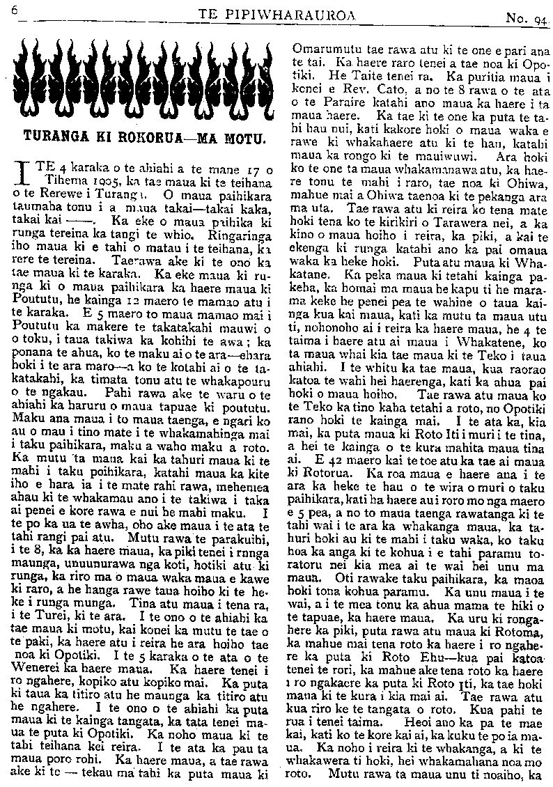 TE PIPIWHARAUROA TURANGA KI ROTORUA—MA MOTU. ITE 4 karaka o te ahiahi a te mane 170 Tihema 1905 ka tae maua ki te teihana o te Rerewe i Turanga. O maua paihikara taumaha tonu i a maua takai—takai kaka, takai kai ——. Ka eke o maua paihika ki runga tereina ka tangi te whio. Ringaringa iho maua ki e tahi o matau i te teihana, ki rere te tereina. Taerawa ake ki te ono ka tae maua ki te kiaraka. Ka eke maua ki ru- nga ki o maua paihikara ka haere maua ki Poututu, he kainga 12 maero te mamao atu i te karaka. E 5 maero to maua mamao mai i Poututu ka makere te takatakahi mauwi o o toku, i taua takiwa ka kohihi te awa; ka ponana te ahua, ko te maku ai o te ara—ehera hoki i te ara maro—a ko te kotahi ai o te ta- katakahi, ka timata tonu atu te whakapouru o te ngakau. Pahi rawa ake te waru o te ahiahi ka haruru o maua tapuae ki poututu. Maku ana maua i to maua taenga, e ngari ko au o mau i tino mate i te whakamahunga mai i taku paihikara, maku a waho maku a roto. Ka mutu ta maua kai ka tahuri maua ki te mahi i taku paihikara, katahi maua ka kite iho e hara ia i te mate rahi rawa, mehemea ahau ki te whakamau ano i te takiwa i taka ai penei e kore rawa e nui he mahi maku. I te po ka ua te awha, oho ake maua i te ata te tahi rangi pai atu. Mutu rawa te parakuihi, i te 8, ka ka haere maua, ka piki tenei i runga maunga, unuunurawa nga koti, hotiki atu ki runga, ka riro ma 6 maua waka maua e kawe ki raro, a he hanga rawe taua hoiho ki te he- ke i runga munga. Tina atu maua i tena ra, i te Turei, ki te ara. I te ono o te ahiahi ka tae maua ki motu, kai konei ka mutu te tae o te paki, ka haere atu i reira he ara, hoiho tae noa ki Opotiki. I te 5 karaka o te ata o te Wenerei ka haere maua. Ka haere tenei i ro ngahare, kopiko atu kopiko mai. Ka puta ki taua ka titiro atu he maunga ka titiro atu he ngahere. I te ono o te ahiahi ka puta maua ki te kainga tangata, ka tata tenei ma- ua te puta ki Opotiki. Ka noho maua ki te tahi teihana kei reira. I te ata ka pau ta maua poro rohi. Ka haere maua, a tae rawa ake ki te — tekau ma tahi ka puta maua ki Omarumutu tae rawa atu ki te one e pari ana te tai. Ka haere raro tenei a tae noa ki Opo- tiki. He Taite tenei ra. Ka puritia maua i konei e Rev. Cato, a no te 8 rawa o te ata o te Paraire katahi ano maua ka haere i ta maua haere. Ka tae ki te one ka puta te ta- hi hau nui, kati kakore hoki o maua waka e rawe ki whakahaere atu ki te hau, katahi maua ka rongo ki te mauiui. Ara hoki ko te one ta maua whakamanawa atu, ka hae- re tonu te mahi i raro, tae noa ki Ohiwa, mahue mai a Ohiwa taenoa ki te pekanga ara ma uta. Tae rawa atu ki reira ko tena mate hoki tena ko te kirikiri o Tarawera nei, a ka kino o maua hoiho i reira, ka piki, a kai te ekenga ki runga katahi ano ka pai omaua waka ka heke hoki. Puta atu maua ki Wha- katane. Ka peka maua ki tetahi kainga pa- keha, ka homai ma maua he kapu ti he mara- ma keke he penei pea te wahine o taua kai- nga kua kai maua, kati ka mutu ta maua utu ti, nohonoho ai i reira ka haere maua, he 4 te taima i haere atu ai maua i Whakatene, ko ta maua whai kia tae maua ki te Teko i ta ua ahiahi. I te whitu ka tae maua, kua raorao katoa te wahi hei haerenga, kati ka ahua pai hoki o maua hoiho. Tae rawa atu maua ko te Teko ka tino kaha tetahi a roto, no Opotiki rano hoki te kainga mai. I te ata ka, kia mai, ka puta maua ki Roto Iti i muri te tina, a hei te kainga o te kura mahita maua tina ai. E 42 maero kai te toe atu ka tae ai maua ki Rotorua. Ka roa maua e haere ana i te ara ka heke te hau o te wira o muri o taku paihikara, kati ha haere au i TOTO mo nga maero e 5 pea, a no to maua taenga rawatanga ki te tahi wai i te ara ka whakanga maua, ka ta- huri hoki au ki te mahi i taku waka, ko taku hoa ka anga ki te kohua i e tahi paramu to- rutoru nei kia mea ai te wai hei unu ma maua. Oti rawake taku paihikara, ka maoa hoki tona kohua paramu. Ka unu maua i te wai, a i te mea tonu ka ahua mama te hiki o te tapuae, ka haere maua. Ka UTU ki ronga- hore ka piki, puta rawa atu maua ki Rotorua, ka mahue mai tena roto ka haere i ro ngaha- re ka puta ki Roto Ehu—kua pai katoa tenei te rori, ka mahue ake tena roto ka haere i ro ngakaere ka puta ki Roto iti, ka tae hoki maua ki te kura i kia mai ai. Tae rawa atu kua riro ke te tangata o roto. Kua pahi te rua i tenei taima. Heoi ano ka pa te mae kai, kati ko te kore kai ai, ka kuku te po ia ma- ua. Ka noho i reira ki te whakanga, a ki te whakawera ti hoki, hei whakamahana noa mo roto. Mutu rawa ta maua unu ti noaiho, ka