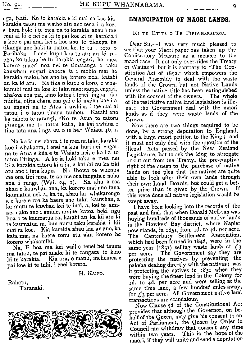 HE KUPU WHAKAMARAMA. nga, Kati. Ko to karakia e ki mai na koe kia karakia tatou me waiho atu ano tena i a koe, e hara hoki i te mea na to karakia ahau i tae mai ai ki e nei ra ki te pai koe ki te karakia i a koe e pai ana, kei a koe ano te tikanga he tikanga ano hoki ta matou kei te tu i Toto o Parihaka. I enei kupu kua tu atu au ki ru- nga, ko taku he tu karakia engari, he mea korero maori noa nei te timatanga o taku kauwhau, engari kahore ia i mohio mai he karakia maku, hoi ano he korero noa, katahi au ka ki atu. Ka tika o kupu e koro, e wha- kamihi mai na koe ki taku maoritanga engari, ahakoa ena pai, kino katoa i tenei ingoa oku minita, otira ehara ena pai e ki maina koa i a au engari na te Atua i awhina i tae mai ai tatou i o tatou tinana tauhou. Katahi ano ka takoto te rarangi, "Ko te Atua to tatoru pirangi me to tatou kaha, he kai awhina e tino tata ana i nga wa o te he." Waiata 46, i. Na ko ia nei ehara i te mea na taku karakia koe i whakaora, i enei ra kua huri nei, engari na te Atua e kiia e te Waiata nei, e ko i a to tatou Piringa. A ko ia hoki taku e mea nei ki a karakia tatoru ki a ia, a katahi au ka tiki atu ano i tera kupu. No Ihowa te whenua me ona tini mea, te ao me ona tangata e noho ana i runga (Wai. 24, i). Ka ahu a roa ahau e kauwhau ana, ka korero mai ano taua kaumatua nei, a, ka tu, ahau ka whakarango a e kore e roa ka haere ano taku kauwhau, a ka mutu te kawhau kei te inoi, a, kei te ami- ne, naku ano i amine, amine katoa hoki nga hoa o te kaumatua ra, katahi au ka kii atu ki te kaumatua ra, kua mutu taku karakia i kii mai ra koe. Kia karakia ahau kia au ano, ka kata mai, na haere tonu atu aku korero he korero whakamihi. Na, E hoa ma kei waiho tenei hei tauira ma tatou, te pai anake ki te tangata te kino ki te karakia. Kia ora, e manu, mehemea e pai koe ki te tuhi, i enei korero. H. KAIPO. Rohotu, Taranaki. EMANCIPATION OF MAORI LANDS. KI TE ETITA O TE PIPIWHARAUROA. Dear Sir-I was very much pleased to see that your Maori paper has taken up the Confiscatory Measure as a menace to the maori race. It not only over-rides the Treaty of Waitangi but it is contrary to The Con- stitution Act of 1852, which empowers the General Assembly to deal with the waste unless the native titile has been extinguished with the consent of the owners. The whole of the restrictive native land legislation is ille- gal; the Government deal with the maori lands as if they were waste lands of the Crown. Now there are two things required to be done, by a strong deputation to England, with a large maori petition to the King and it must not only deal with the question of the illegal Acts passed by the New Zealand Legislature, but to ask the king to abrogate or cut out from the Treaty, the pre-emptive right of the quueen to the purchase of native lands on the plea that the natives are quite able to look after their own lands through their own Land Boards, but could get a bet ter price than is given by the Crown. If this were done all native legislation would be swept away. I have been looking into the records of the past and find, that when Donald McLean was buying hundreds of thousands of native lands in the Hawkes Bay district where Napier now stands, in 1851, from Id to 4d. per acre, The Canterbury Settlement Association, which had been formed in 1848, were in the same year (1851) selling waste lands at $3 per acre. The Government say they are protecting the natives by preventing the pakeha dealing directly with the natives, was it protecting the natives in 1851 when they were buying the finest land in the Colony for 1d to 4d per acre and were selling at the same time land, a few hundred miles away, for $3 per acre. All Government native land transactions are scandalous. Now clause 58 of the Constitutional Act provides that although the Governor, on be half of the queen, may give his consent to an Act of Parliament, the Queen by Order in Council can withdraw that consent any time within two years. This is the hope of the maori, if they will unite and a deputation