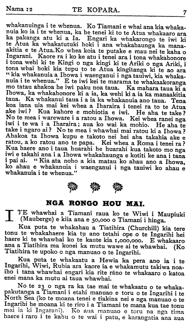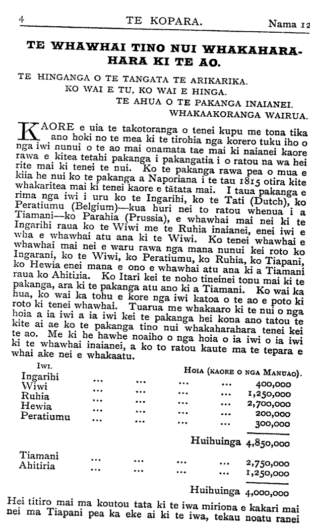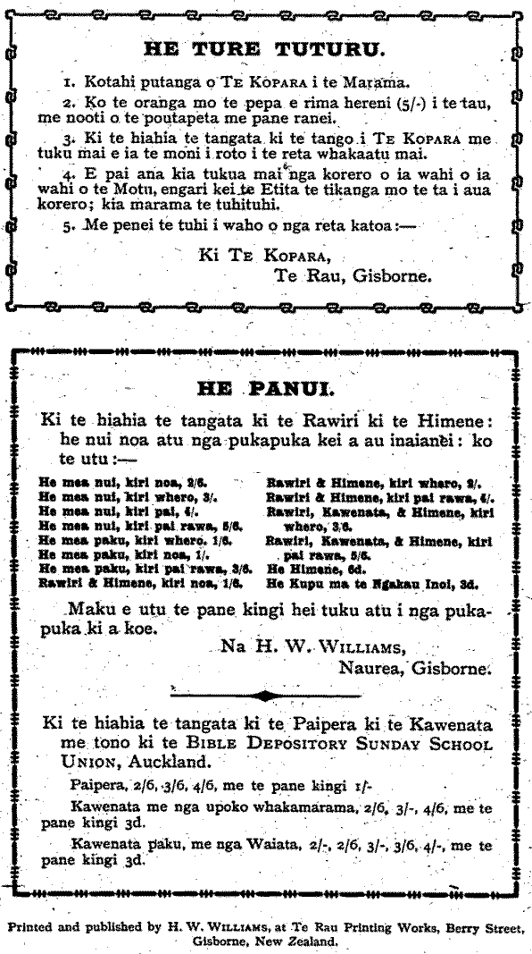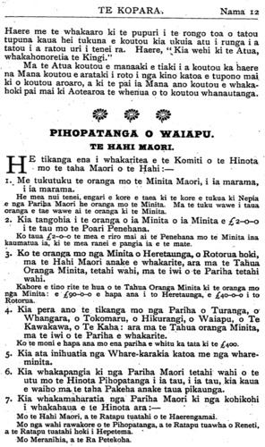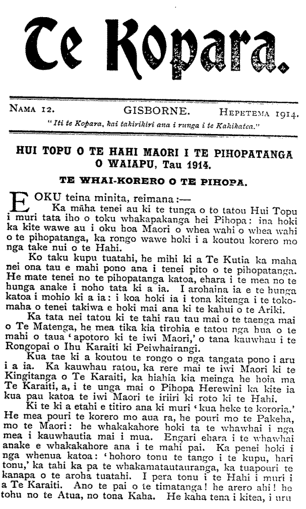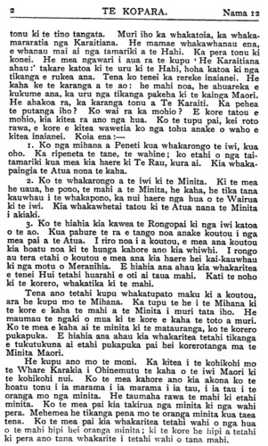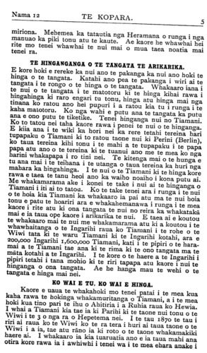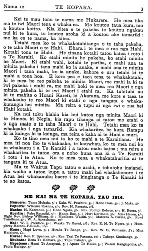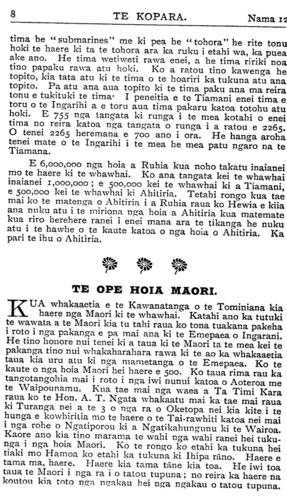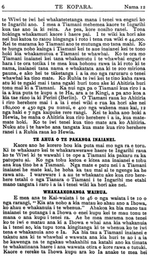 tima he "submarines" me ki pea he "tohora" he rite tonu hoki te haere ki ta te tohora ara ka ruku i etahi wa, ka puea ake ano. He tima wetiweti rawa enei, a he tima ririki noa tino papaku rawa atu hoki. Ko a ratou tino kawenga he topito, kia tata atu ki te tima o te hoariri ka tukuna atu ana topito. Pa atu ana aua topito ki te tima paku ana ma reira tonu e tukituki te tima I peneitia e te Tiamani enei tima e toru o te Ingarihi a e toru aua tima pakaru katoa totohu atu hoki. E 755 nga tangata ki runga i te mea kotahi o enei tima no reira katoa nga tangata o runga i a ratou e 2265 O tenei 2265 heremana e 700 ano i ora. He hanga aroha tenei mate o te Ingarihi i te mea he mea patu ngaro na te Tiamana. E 6,000,000 nga hoia a Ruhia kua noho takatu inaianei mo te haere ki te whawhai. Ko ana tangata kei te whawhai inaianei 1,000,000 e 500,000 kei te whawhai ki a Tiamani, e 500,000 kei te whawhai ki Ahitiria. Tetahi rongo kua tae mai ko te matenga o Ahitiria i a Ruhia raua ko Hewia e kiia ana nuku atu i te miriona nga hoia a Ahitiria kua matemate kua riro herehere ranei i enei mana ara te tikanga he nuku atu i te hawhe o te kaute katoa o nga hoia o Ahitiria. Ka pari te ihu o Ahitiria. TE OPE HOIA MAORI. KUA whakaaetia e te Kawanatanga o te Tominiana kia haere nga Maori ki te whawhai. Katahi ano ka tutuki te wawata a te Maori kia tu tahi raua ko tona tuakana pakeha i roto i nga pakanga e pa mai ana ki te Emepaea o Ingarani. He tino honore nui tenei ki a taua ki te Maori ta te mea kei te pakanga tino nui whakaharahara rawa ki te ao ka whakaaetia taua kia uru atu ki nga mametanga o te Emepaea. Ko te kaute o nga hoia Maori hei haere e 500. Ko taua rima rau ka tangotangohia mai i roto i nga iwi nunui katoa o Aoteroa me te Waipounamu. Kua tae mai nga waea a Ta Timi Kara raua ko te Hon. A. T. Ngata whakaatu mai ka tae mai raua ki Turanga nei a te 3 o nga ra o Oketopa nei kia kite i te hunga e kowhiritia rno te haere o te Tai-rawhiti katoa nei mai i nga rohe o Ngatiporou ki a Ngatikahungunu ki te Wairoa. Kaore ano kia tino marama te wahi nga wahi ranei hei tukunga i nga hoia Maori. Ko te rongo ko etahi ka tukuna hei tiaki mo Hamoa ko etahi ka tukuna ki Ihipa rano. Haere e tama ma, haere. Haere kia tama tane kia toa. He iwi toa taua te Maori i nga ra i o tatou tupuna; no reira ka haere na koutou kia toto nga ngakau hei nga ngakau o tatou tupuna. Haere me te whakaaro ki te pupuri i te rongo toa o tatou tupuna kaua hei tukuna e koutou kia ukuia atu i runga i a tatou i a ratou uri i tenei ra. Haere, "Kia wehi ki te Atua, whakahonoretia te Kingi." Ma te Atua koutou e manaaki e tiaki i a koutou ka haere na Mana koutou e arataki i roto i nga kino katoa e tupono mai ki o koutou aroaro, a ki te pai ia Mana ano koutou e whakahoki pai mai ki Aotearoa te whenua o to koutou whanautanga. PIHOPATANGA O WAlAPU. TE HAHI MAORI. HE tikanga ena i whakaritea e te Komiti o te Hinota mo te taha Maori o te Hahi: 1. Me tukutuku te oranga mo te Minita Maori, i ia marama, i ia marama. He mea nui tenei, engari e kore e taea ki te kore e tukua ki Nepia e nga Pariha Maori he oranga mo te Minita. Ma te tuku wawe i taua oranga e tae wawe ai te oranga ki te Minita. 2. Kia tangohia i te oranga o ia Minita o ia Minita e £ 2-0-0 i te tau mo te Poari Penehana. Ko taua £ 2-0-0 te mea e riro mai ai te Penehana mo te Minita ina kaumatua ia, ki te mea ranei e pangia ia e te mate. 3. Ko te oranga mo nga Minita o Heretaunga, o Rotorua hoki, ma te Hahi Maori anake e whakarite, ara ma te Tahua Oranga Minita, tetahi wahi, ma te iwi o te Pariha tetahi wahi. Kahore