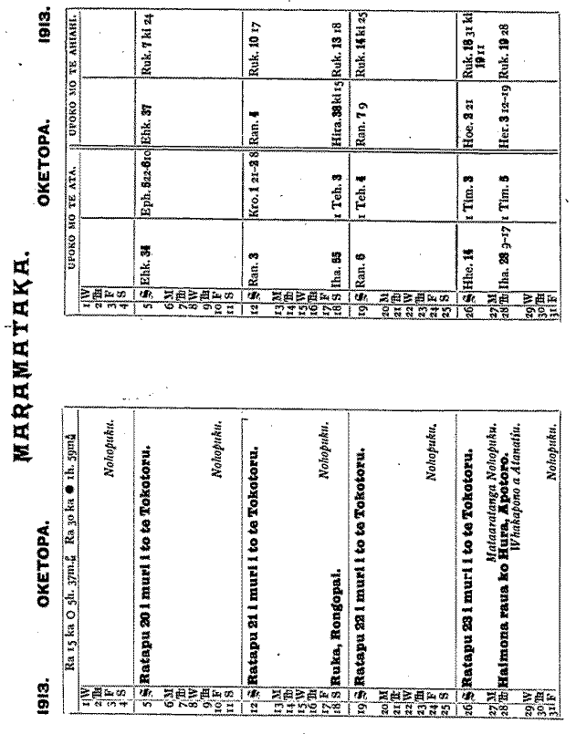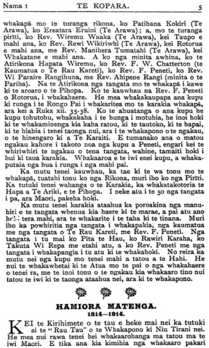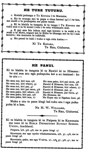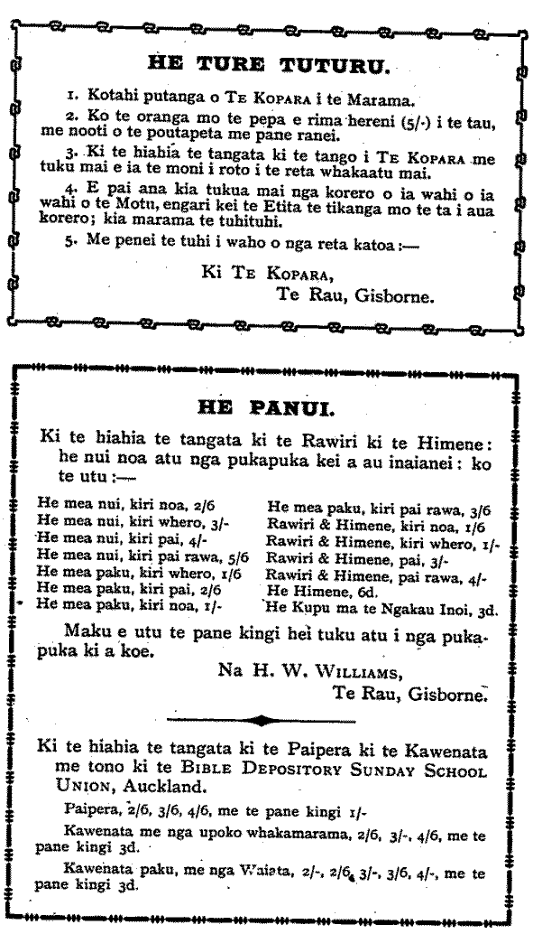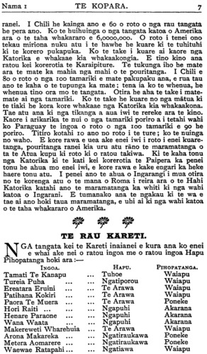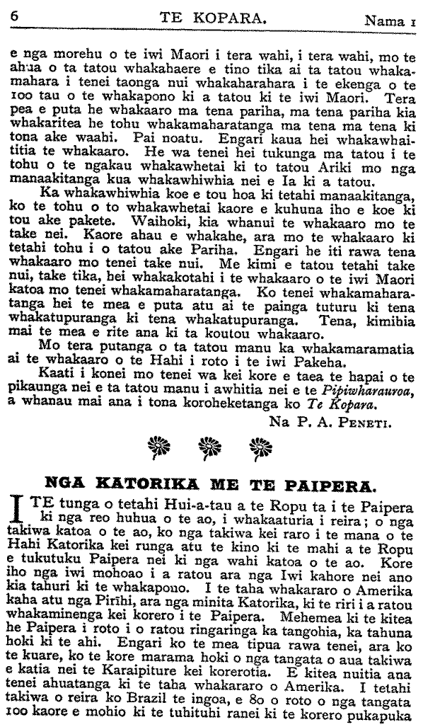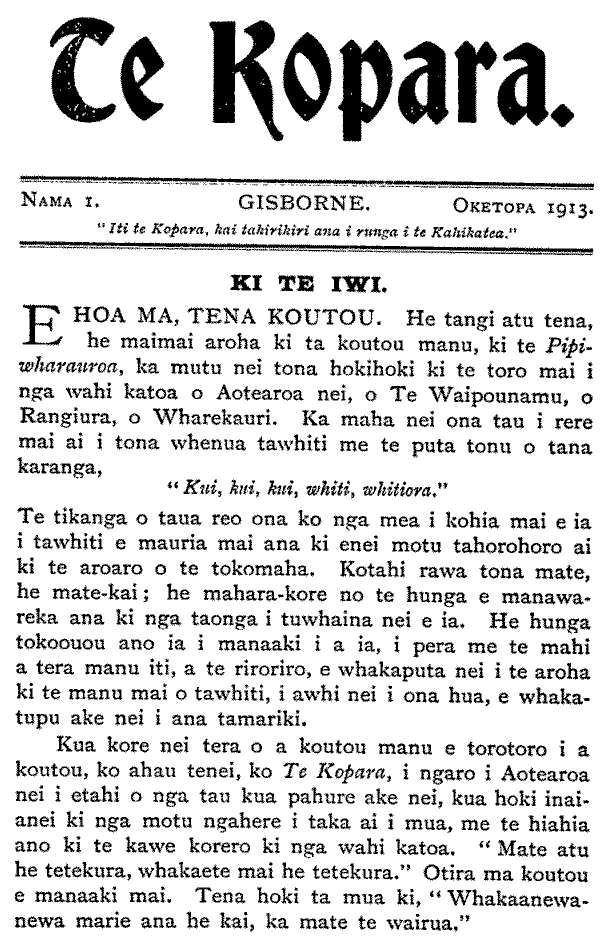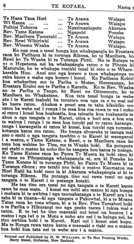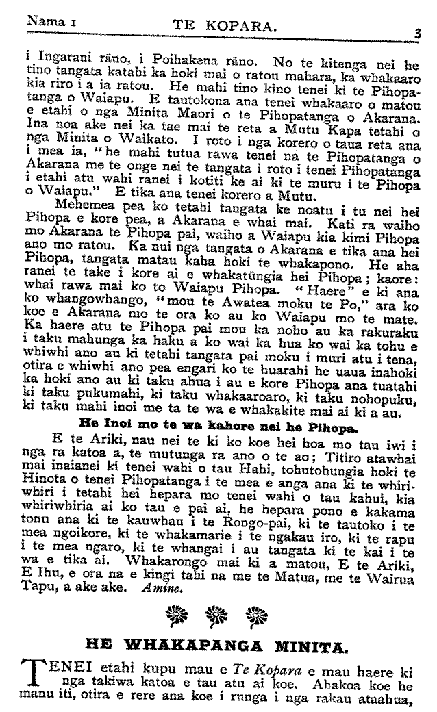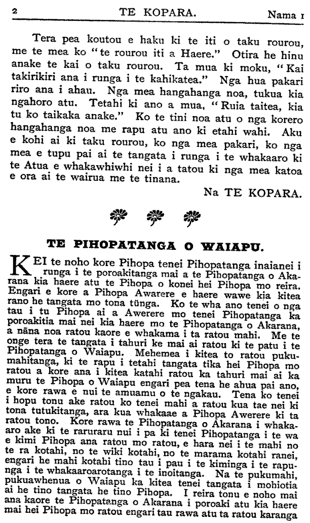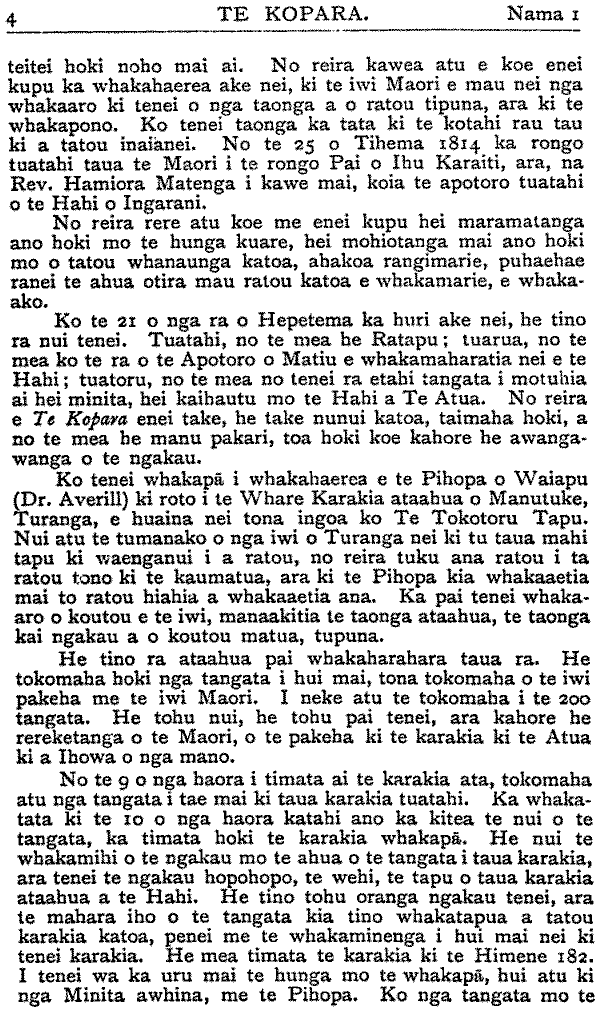 Tera pea koutou e haku ki te iti o taku rourou, me te mea ko "te rourou iti a Haere." Otira he hinu anake te kai o taku rourou. Ta mua ki moku, "Kai takirikiri ana i runga i te kahikatea." Nga hua pakari riro ana i ahau. Nga mea hangahanga noa, tukua kia ngahoro atu. Tetahi ki ano a mua, "Ruia taitea, kia tu ko taikaka anake." Ko te tini noa atu o nga korero hangahanga noa me rapu atu ano ki etahi wahi. Aku e kohi ai ki taku rourou, ko nga mea pakari, ko nga mea e tupu pai ai te tangata i runga i te whakaaro ki te Atua e whakawhiwhi nei i a tatou ki nga mea katoa e ora ai te wairua me te tinana. Na TE KOPARA. TE PIHOPATANGA O WAIAPU. KEI te noho kore Pihopa tenei Pihopatanga inaianei i runga i te poroakitanga mai a te Pihopatanga o Akarana kia haere atu te Pihopa o konei hei Pihopa mo reira. Engari e kore a Pihopa Awarere e haere wawe kia kitea rano he tangata mo tona tünga. Ko te wha ano tenei o nga tau i tu Pihopa ai a Awerere mo tenei Pihopatanga ka poroakitia mai nei kia haere mo te Pihopatanga o Akarana a nana noa ratou kaore e whakama i ta ratou mahi. Me te onge tera te tangata i tahuri ke mai ai ratou ki te patu i te Pihopatanga o Waiapu. Mehemea i kitea to ratou pukumahitanga, ki te rapu i tetahi tangata tika hei Pihopa mo ratou a kore ana i kitea katahi ratou ka tahuri mai ai ka muru te Pihopa o Waiapu engari pea tena he ahua pai ano, e kore rawa e nui te amuamu o te ngakau. Tena ko tenei i hopu tonu ake ratou ko tenei mahi a ratou kua tae nei ki tona tutukitanga, ara kua whakaae a Pihopa Awerere ki ta ratou tono. Kore rawa te Pihopatanga o Akarana i whakaaro ake ki te raruraru nui i pa ki tenei Pihopatanga i te wa e kimi Pihopa ana ratou mo ratou, e hara nei i te mahi no te ra kotahi, no te wiki kotahi, no te marama kotahi ranei, engari he mahi kotahi tino tau i pau i te kiminga i te rapunga i te whakaaroarotanga i te inoitanga. Na te pukumahi, pukuawhenua o Waiapu ka kitea tenei tangata i mohiotia ai he tino tangata he tino Pihopa. I reira tonu e noho mai ana kaore te Pihopatanga o Akarana i poroaki atu kia haere mai hei Pihopa mo ratou engari tau rawa atu ta ratou karanga i Ingarani rano, i Poihakena rano. No te kitenga nei he tino tangata katahi ka hoki mai o ratou mahara, ka whakaaro kia riro i a ia ratou. He mahi tino kino tenei ki te Pihopatanga o Waiapu. E tautokona ana tenei whakaaro o matou e etahi o nga Minita Maori o te Pihopatanga o Akarana. Ina noa ake nei ka tae mai te reta a Mutu Kapa tetahi o nga Minita o Waikato. I roto i nga korero o taua reta ana i mea ia, "he mahi tutua rawa tenei na te Pihopatanga o Akarana me te onge nei te tangata i roto i tenei Pihopatanga i etahi atu wahi ranei i kotiti ke ai ki te muru i te Pihopa o Waiapu." E tika ana tenei korero a Mutu. Mehemea pea ko tetahi tangata ke noatu i tu nei hei Pihopa e kore pea, a Akarana e whai mai. Kati ra waiho mo Akarana te Pihopa pai, waiho a Waiapu kia kimi Pihopa ano mo ratou. Ka nui nga tangata o Akarana e tika ana hei Pihopa, tangata matau kaha hoki te whakapono. He aha ranei te take i kore ai e whakatüngia hei Pihopa; kaore: whai rawa mai ko to Waiapu Pihopa. " Haere" e ki ana ko whangowhango, "mou te Awatea moku te Po," ara ko koe e Akarana mo te ora ko au ko Waiapu mo te mate. Ka haere atu te Pihopa pai mou ka noho au ka rakuraku i taku mahunga ka haku a ko wai ka hua ko wai ka tohu e whiwhi ano au ki tetahi tangata pai moku i muri atu i tena, otira e whiwhi ano pea engari ko te huarahi he uaua inahoki ka hoki ano au ki taku ahua i au e kore Pihopa ana tuatahi ki taku pukumahi, ki taku whakaaroaro, ki taku nohopuku, ki taku mahi inoi me ta te wa e whakakite mai ai ki a au. He Inoi mo te wa kahore nei ho Pihopa E te Ariki, nau nei te ki ko koe hei hoa mo tau iwi i nga ra katoa a, te mutunga ra ano o te ao; Titiro atawhai mai inaianei ki tenei wahi o tau Hahi, tohutohungia hoki te Hinota o tenei Pihopatanga i te mea e anga ana ki te whiriwhiri i tetahi hei hepara mo tenei wahi o tau kahui, kia whiriwhiria ai ko tau e pai ai, he hepara pono e kakama tonu ana ki te kauwhau i te Rongopai, ki te tautoko i te mea ngoikore, ki te whakamarie i te ngakau iro, ki te rapu i te mea ngaro, ki te