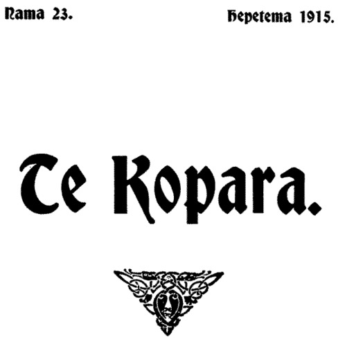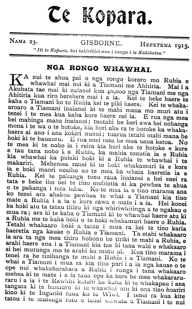 Te Kopara. NAMA 23. GISB0RNE, HEPETEMA 1915. "Iti te Kopara, kai takirikiri ana i runga i te Kahikatea." NGA RONGO WHAWHAI. KA nui te ahua pai o nga rongo korero mo Ruhia e whawhai mai nei ki a Tiamani me Ahitiria. Mai i a Akuhata tae mai ki naianei kua 40,000 nga Tiamani me nga Ahitiria kua riro herehere mai i a ia. Kei te heke haere te kaha o Tiamani ko to Ruhia kei te piki haere. Kei te whakaaroaro a Tiamani inaianei ki te mahi mana mo muri atu i tenei i te mea kua kaha kore haere nei ia. E rua nga mea hei mahinga mana inaianei; tuatahi he keri awa hei nohanga mona i te wa o te hotoke, kia hori ake ra te hotoke ka whakahaere ai ano i ana kokiri nunui; tuarua tetahi mahi mana he hoki ki te hauauru. E rua enei mea he mea uaua katoa. No te mea ki te noho ia i reira kia hori ake te hotoke e kore e tau tana noho i a Ruhia, ka mahia tonutia ia e Ruhia kia whawhai ka puiaki hoki ki a Ruhia te whawhai i te makariri. Mehemea ranei ki te hoki whakamuri ia e kore ia e hoki maori noaiho no te mea ka whaia haeretia ia e Ruhia. Kei te pakanga tonu raua inaianei a hei enei ra tata e heke iho nei te tino mohiotia ai ka pewhea te ahua o te pakanga i tera taha. Ko te mea ia e tino marama ana ko tenei ara ahakoa pewhea te whai a Tiamani kia tino mate a Ruhia i a ia e kore rawa e mate i a ia. Hei konei ka hoki atu ta tatau titiro ki nga whiriwhiringa a te ngakau o mua ra, ara ki te kaha o Tiamani ki te whawhai haere atu ki a Ruhia me te kaha hoki o te hoki whakamuri haere o Ruhia. Tetahi whakaaro hoki a tatau i mua ra kei te tino karia haeretia nga kauae o Ruhia e Tiamani. Ta etahi whakaaro ia ara ta nga mea titiro hohonu he tiriki te mahi a Ruhia, e arahi haere ana i a Tiamani kia tae ki tana wahi e whakaaro ai hei mutunga mo te arahi ka mutu ai kua tino marama i tenei ra he tinihanga te mahi a Ruhia i a Tiamani. Ko te whai a Tiarnani i mua ra kia tino pari i a ia nga kauae o te ope nui whakaharahara a Ruhia i runga i tana whakaaro mehea ki te mate i a ia taua ope ka kore he mea whakararuraru i a ia i te Rawhiti katahi ka kaha ki te whakapau i ana tangata ki te hauauru ki te whawhai atu ki ona tino hoariri kino ki te Ingarihi raua ko te Wiwi. I tenei ra kua kite tatou i te matenga roto o tenei wawata a Tiamani i te nui