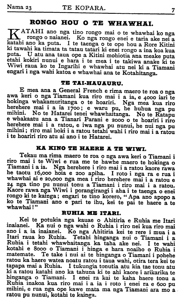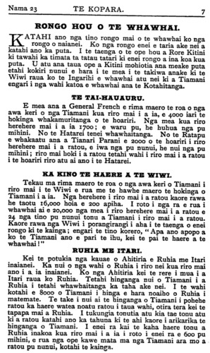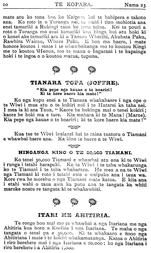 mate atu ko tona hoa ko Kaipara kei te hohipera e takoto ana. Ko roto ia o Turanga nei, te wahi i tino mohiotia ana enei tamariki a Rukingi raua ko tona teina. Kei te pouri a roto o Turanga mo enei tamariki kua hinga hui atu hoki ki o konei ake tamariki ara ki a Tanara Wherihi, Akuhata Paku, Rawhira Wairau, Whare Peka. E hoa ma haere, i mate honore koutou i mate i te whawhaitanga mo to koutou Kingi me to koutou Whenua mo te mana o Ingarani i te hapainga hoki i te ingoa o o koutou matua, tupuna. TIANARA TOPA (JOFFRE). "Kia pepe nga kauae o te hoariri! Ki te kore haere kia mate! Ko nga kupu enei a te Tianara whakahaere i nga ope o te Wiwi i mua atu o te kokiri nui i te Hatarei ka taha nei. I mea ia ki ana Taua "Kaore he hokinga mai o tenei kokiri; kaore he hoki ma e tare. Kia mahara ki te Mana! (Marne). Kia pepe nga kauae o te hoariri; ki te kore haere kia mate ! " Kua tae te Wiwi inaianei kei te raina tuatoru o Tiamani e whawhai haere ana. Ka kino te haere a te Wiwi. HINGANGA KINO O TE 30,000 TIAMANI. Ko tenei 30,000 Tiamani e whawhai atu ana ki te Wiwi i runga i tetahi harapaki. Ko te Wiwi i te taha whakarunga ko te Tiamani i te taha whakararo. He mea a na te Wiwi nga Tiamani ki roto i tetahi awa e waipuke ana i taua wa. Kore rua he morehu o nga Tiamani mate katoa. E kiia ana i etahi wahi o taua awa ka putu ana te tangata ka whiti maroke noatu re tangata ki te whakawhiti. ITARI ME AHITIRIA. Te rongo hou mai mo te whawhai a nga Itariana me nga Ahitiria kua horo a Korihia i nga Itariana. Te maha o nga tangata o tenei pa e 30,000. Ki te whakaaro e 8000 nga Ahitiriana i mate i te kokiri whakamutunga. Katoa o Ahitiria i riro herehere mai i nga Hariana e 20,000; ko nga Itariana i riro herehere i a Ahitiria 1,ooo.