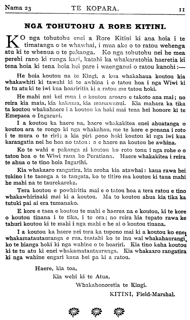 NGA TOHUTOHU A RORE KITINI. KO nga tohutohu enei a Rore Kitini ki ana hoia i te timatanga o te whawhai i mua ake o to ratou wehenga atu ki te whenua o te pakanga. Ko nga tohutohu nei he mea perehi rano ki runga kari katahi ka whakaratohia haeretia ki tena hoia ki tena hoia hei pare i waenganui o ratou kanohi:- He hoia koutou na te Kingi, a kua whakahaua koutou kia whakawhiti ki tawahi ki te awhina i o tatou hoa i nga Wiwi ki te tu atu ki te iwi kua hoariritia ki a ratou me tatou hoki. He mahi nui kei mua i o koutou aroaro e takoto ana mai; no reira kia maia, kia kakama, kia manawanui. Kia mahara ka tika ta koutou whakahaere i a koutou ka hoki mai tena hei honore ki te Emepaea o Ingarani. I a koutou ka haere na, haere whakakitea enei ahuatanga o koutou ara te rongo ki nga whakahau, me te kore e ponana i roto i te mura o te riri; a kia piri pono hoki koutou ki nga iwi kua karangatia nei he hoa no tatou: a e haere na koutou he awhina. Ko te wahi e pakanga ai koutou ko roto tonu i nga rohe o o tatou hoa o te Wiwi raua ko Peratiana. Haere whakakitea i reira te ahua o te tino hoia Ingarihi. Kia whakaaro rangatira, kia aroha kia atawhai: kaua rawa hei tukino i te taonga a te tangata, ko te titiro ma koutou ki taua mahi he mahi na te taurekareka. Tera koutou e powhiritia mai e o tatou hoa a tera ratou e tino whakawhirinaki mai ki a koutou. Ma to koutou ahua kia tika ka tutuki pai ai era tumanako. E kore e taea e koutou te mahi e haerea na e koutou, ki te kore o koutou tinana i te tika, i te ora; no reira kia tupato rawa ke tahuri koutou ki te mahi i nga mahi e he ai o koutou tinana. I a koutou ka haere nei tera ka tupono mai ki a koutou ko enei whakamatautauranga e rua tuatahi ko te inu wai whakahaurangi, ko te hianga hoki ki nga wahine o te hoariri. Kia tino kaha koutou ki te tu atu ki enei whakamatautauranga. Kia whakaaro rangatira ki nga wahine engari kaua hei pa ki a ratou. Haere, kia toa, Kia wehi ki te Atua, Whakahonoretia te Kingi. KITINI, Field-Marshal.