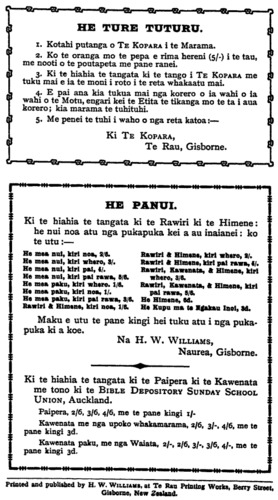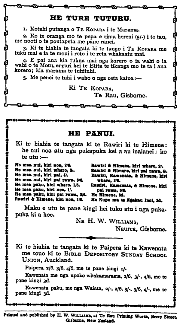 HE TURE TUTURU. 1. Kotalhi putanga o TE KOPARA i te Marama. 2. Ko te oranga mo te pepa e rima hereni (5/-) i te tau, me nooti o te poutapeta me pane ranei. 3. Ki te hiahia te tangata ki te tango i TE KOPARA me tuku mai e ia te moni i roto i te reta whakaatu mai. 4. E pai ana kia tukua mai nga korero o ia wahi o ia wahi o te Motu, engari kei te Etita te tikanga mo te ta i aua korero; kia marama te tuhituhi. 5. Me penei te tuhi i waho o nga reta katoa: Ki TE KOPARA, Te Rau, Gisborne. HE PANUI. Ki te hiahia te tangata ki te Rawiri ki te Himene: he nui noa atu nga pukapuka kei a au inaianei: ko te utu: He mea nui, kiri noa, 2/6. Rawiri & Himene, kiri whero, 2/. He mea nui, kiri whero, 3/. Rawiri & Himene, kiri pai rawa, 4/. He mea nui, kiri pai, 4/. Rawiri, Kawenata, & Himene, kiri whero, 3/6. He mea nui, kiri pai rawa, 5/6. Rawiri, Kawenata, & Himene, kiri pai rawa, 5/6. He mea paku, kiri whero. 1/6. He Himene, 6d. He mea paku, kiri noa, 1/. He Kupu ma te Ngakau Inoi, 3d. He mea paku, kiri pai rawa, 3/6. Rawiri & Himene kiri noa, 1/6. Maku e utu te pane kingi hei tuku atu i nga pukapuka ki a koe. Na H. W. WILLIAMS, Naurea, Gisborne. Ki te hiahia te tangata ki te Paipera ki te Kawenata me tono ki te BIBLE DEPOSITORY SUNDAY SCHOOL UNION, Auckland. Paipera, 2/6, 3/6 4/6, me te pane kingi 1/- Kawenata me nga upoko whakamarama, 2/6, 3/-, 4/6, me te pane kingi 3d. Kawenata paku, me nga Waiata, 2/-, 2/6, 3/-, 3/6 4/-, me te pane kingi 3d. Printed and published by H. W. WILLIAMS, at Te Rau Printing Works, Berry Street, Gisborne, New Zealand.